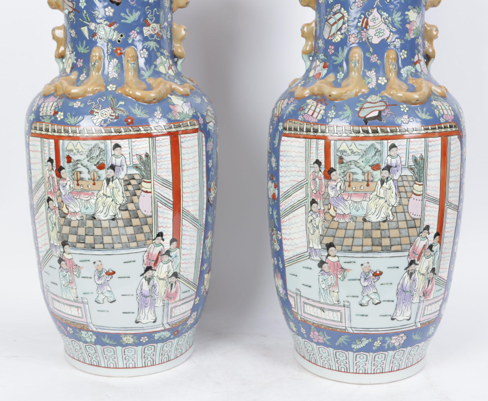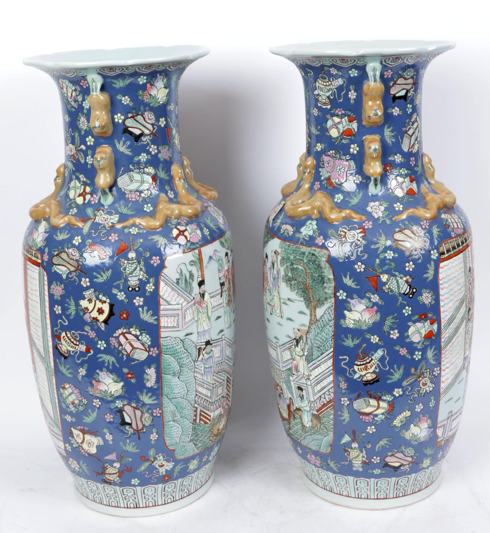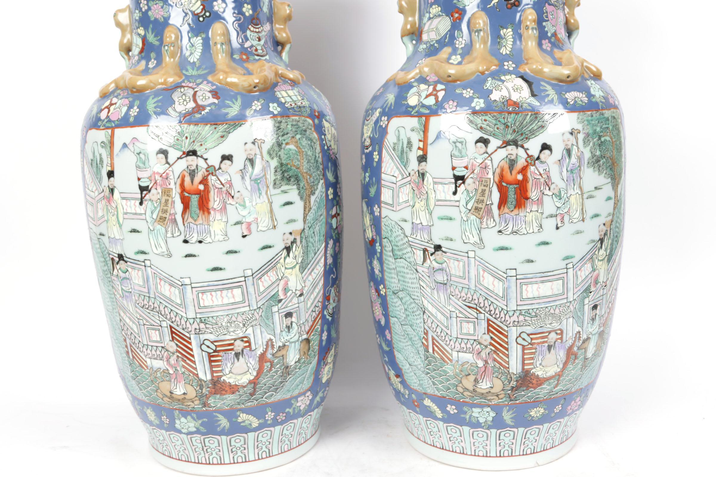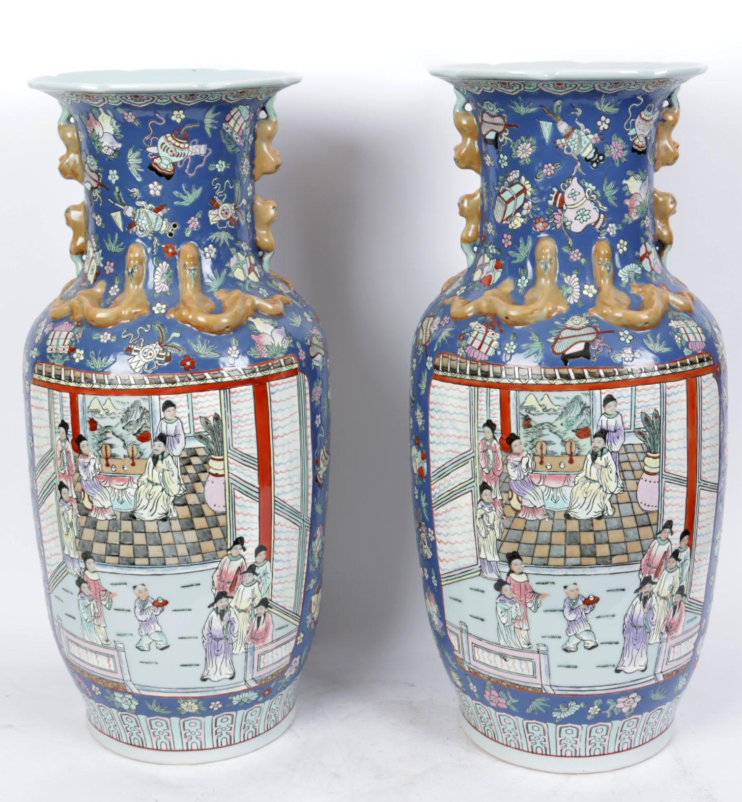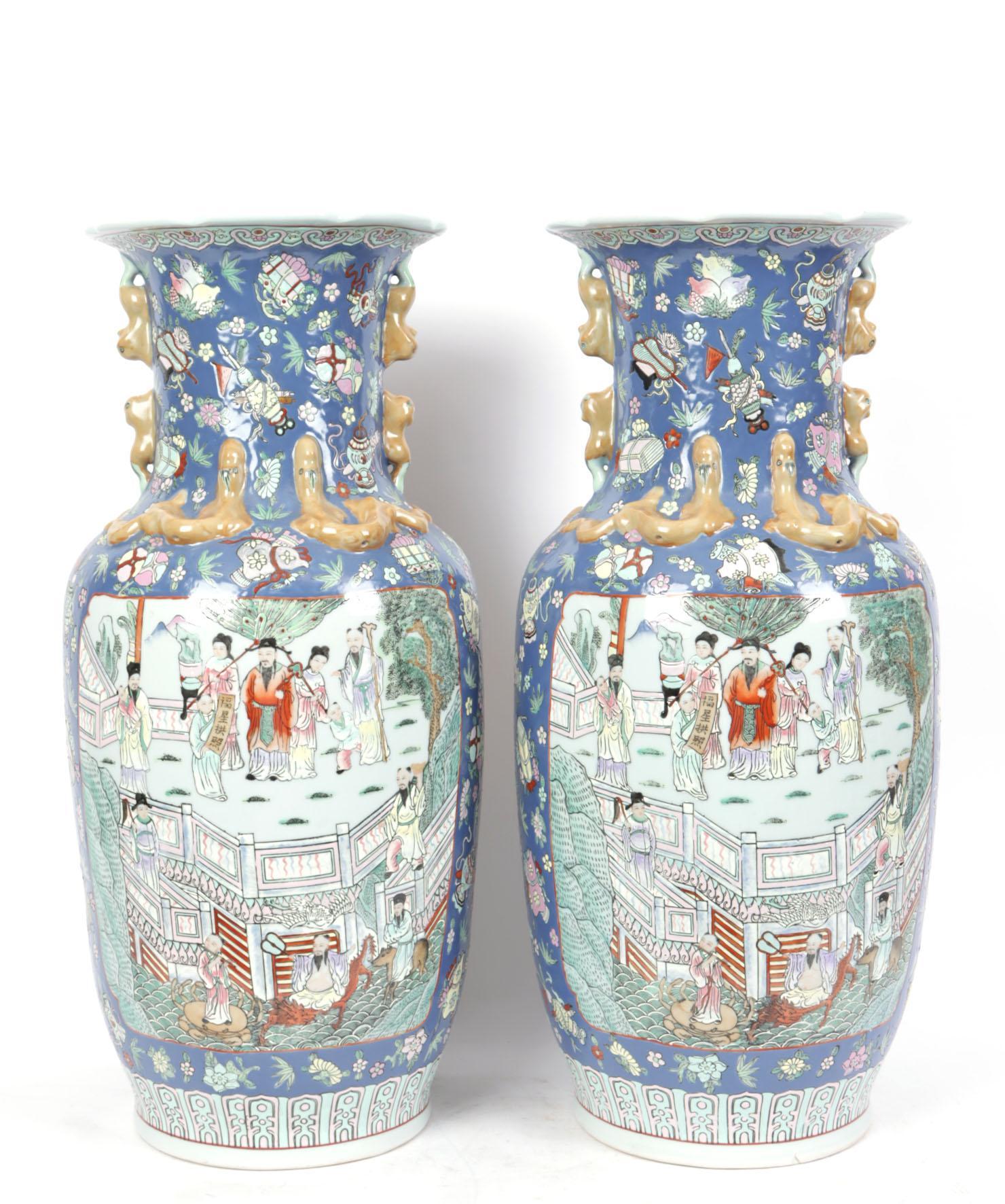 Twee met personen in landschap gedecoreerde Chinees porseleinen kraagvazen