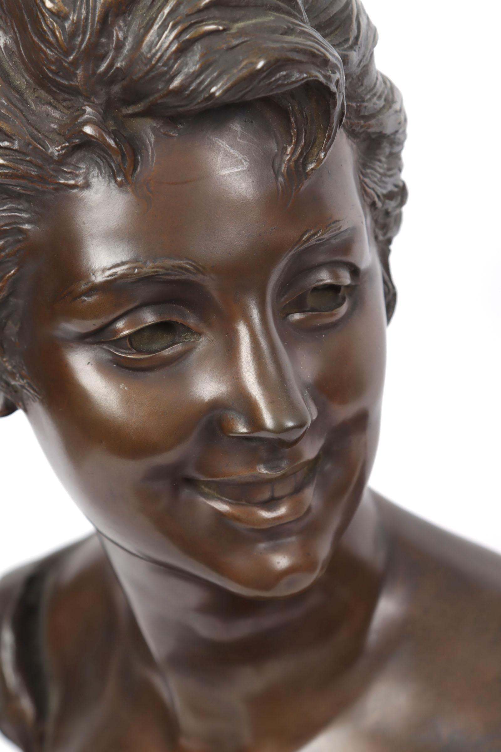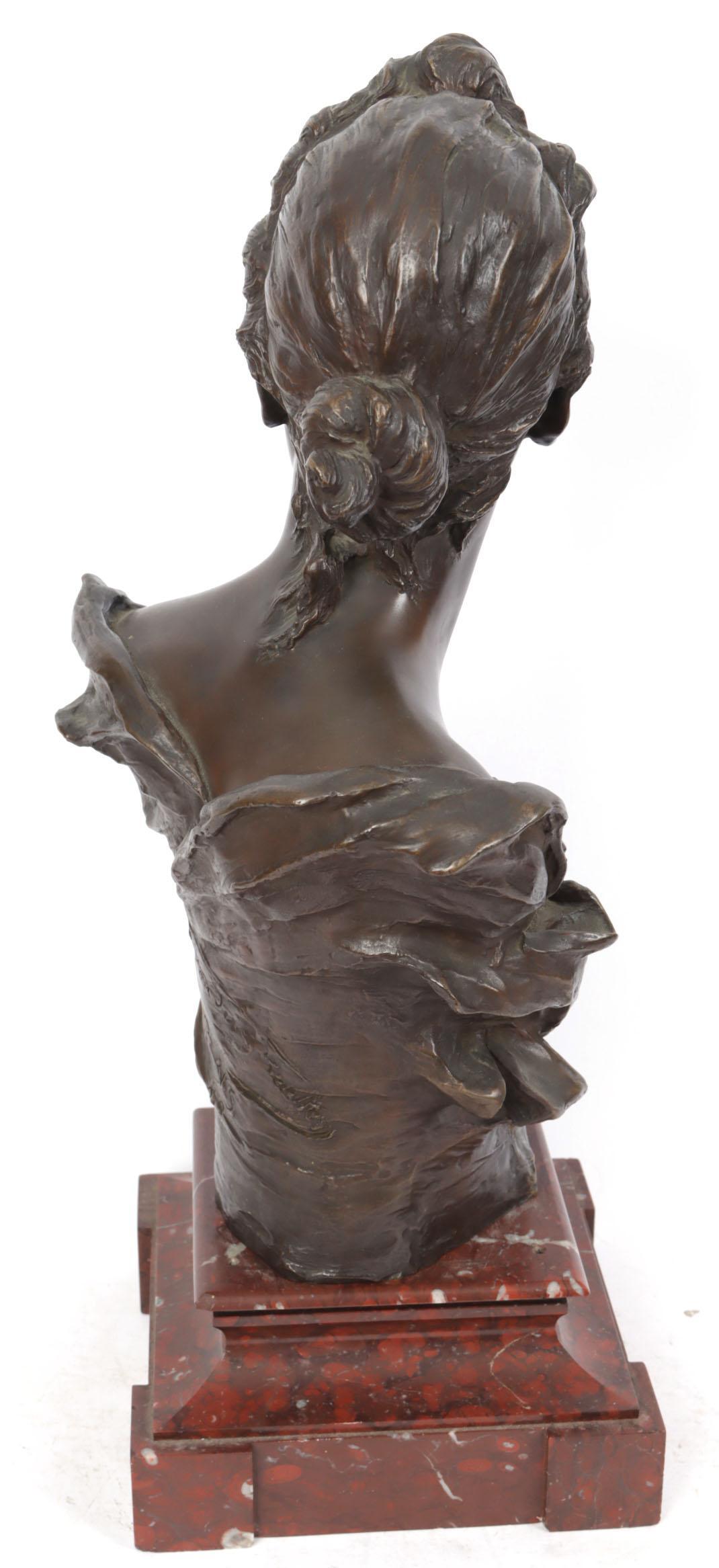 Georges van der Straeten (1856-1928), Bronzen buste van een dame rustend op rood marmeren voetstuk, h.