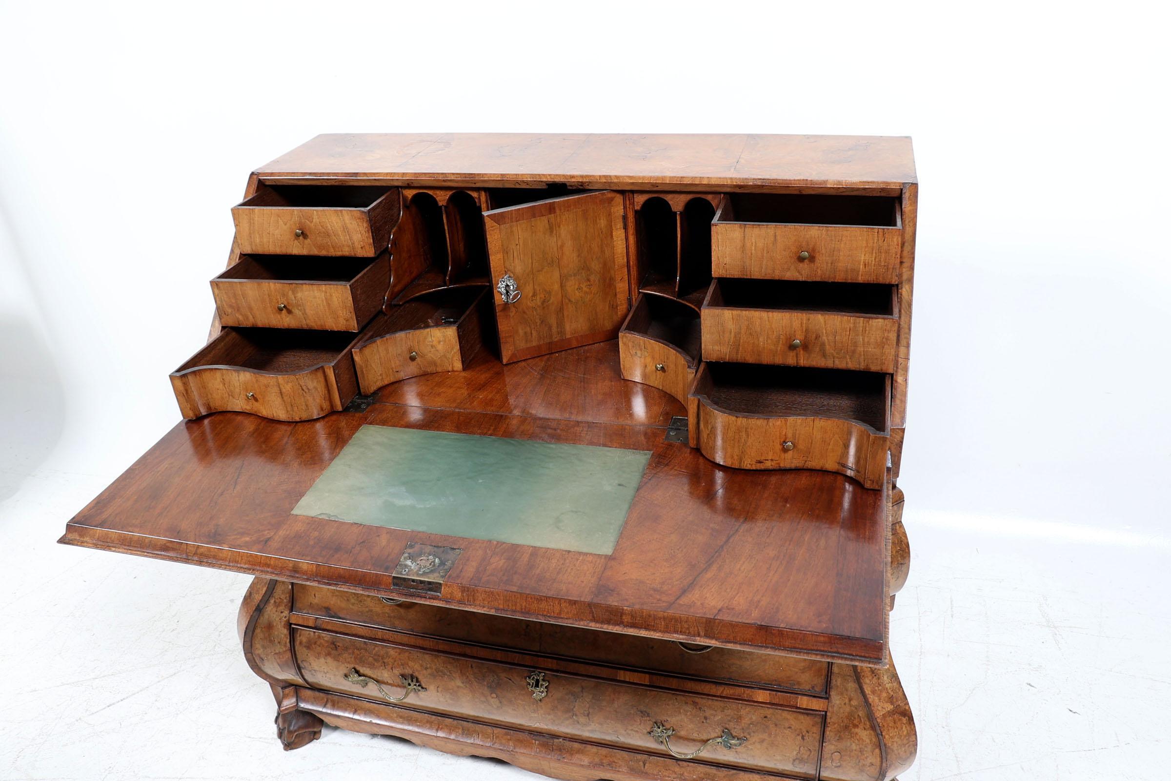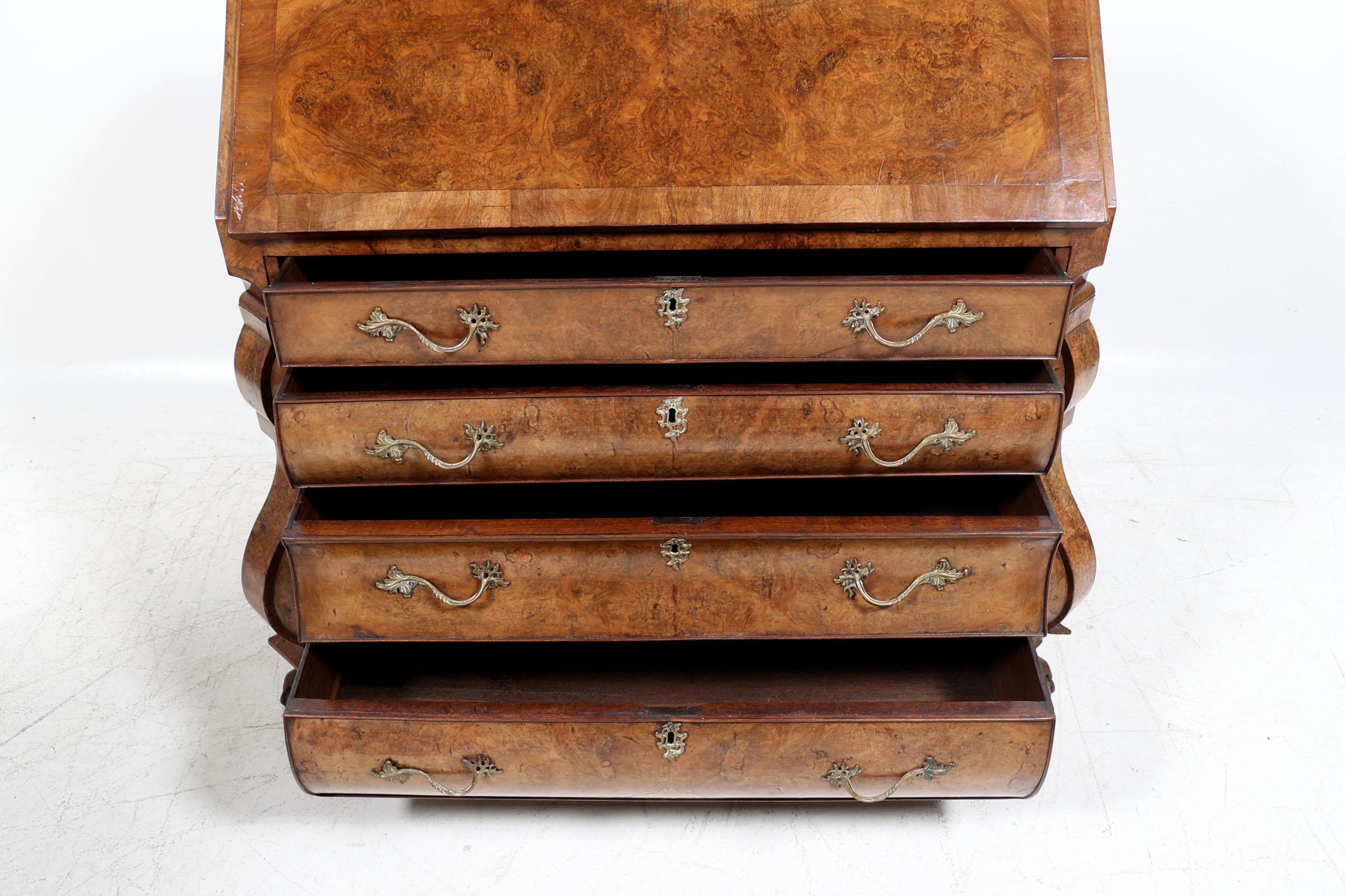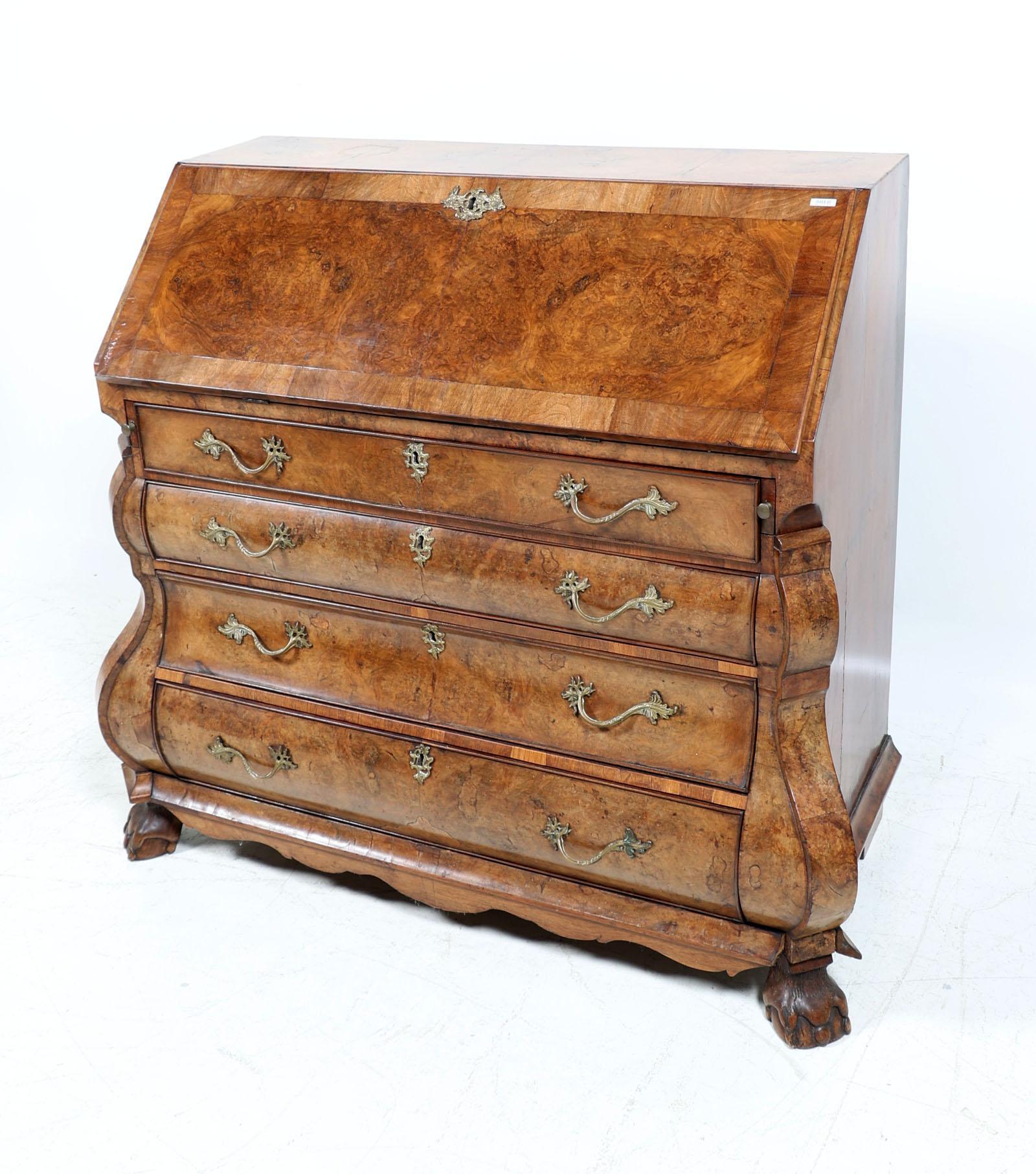 Antieke Hollandse wortelnotenhouten dubbelgebogen secretaire rustend op klauwpoten, 18e eeuw