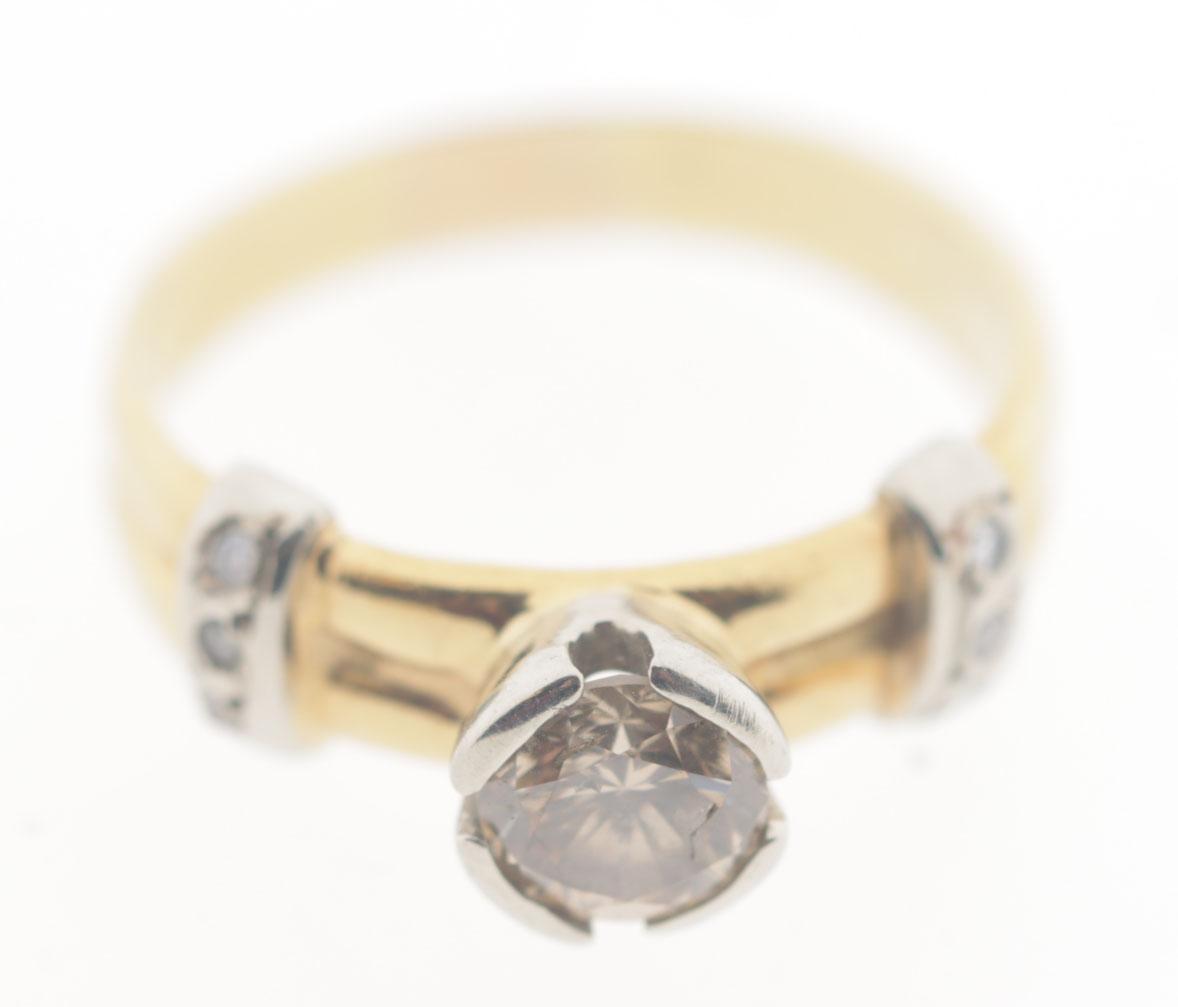 18 Kt. gouden ring bezet met 0.75 ct. roze diamant en 6 briljant geslepen diamantjes, 5,7 gram