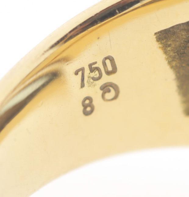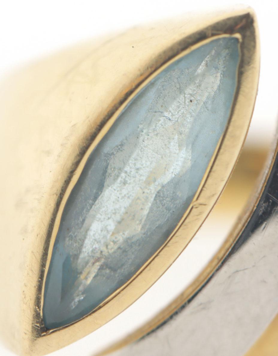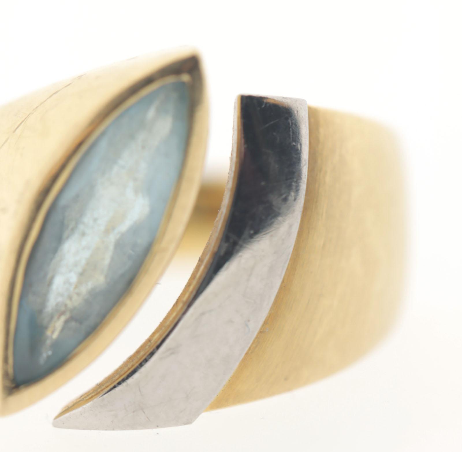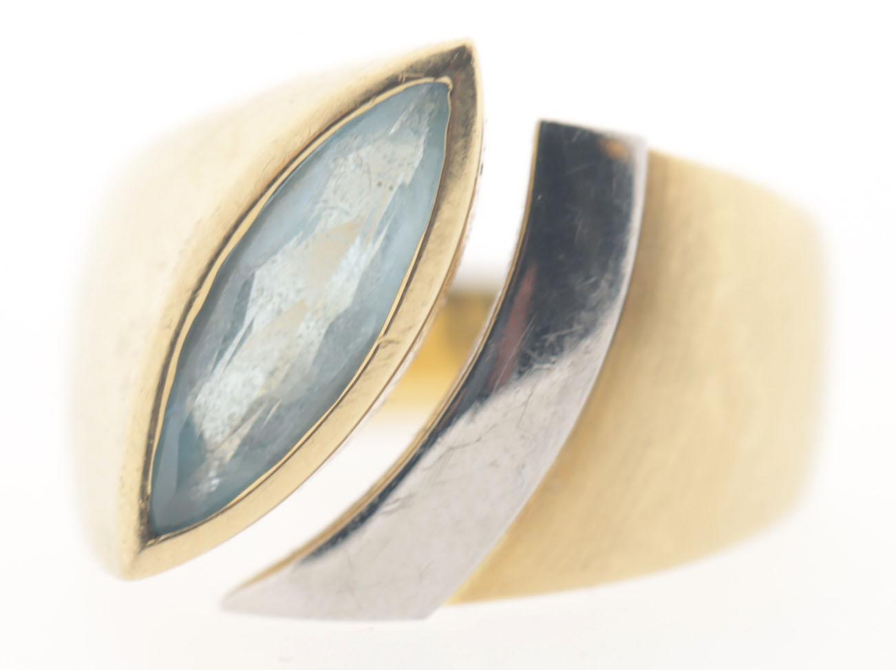 18 Kt. gouden ring bezet met blauwe kleursteen, 15,8 gram