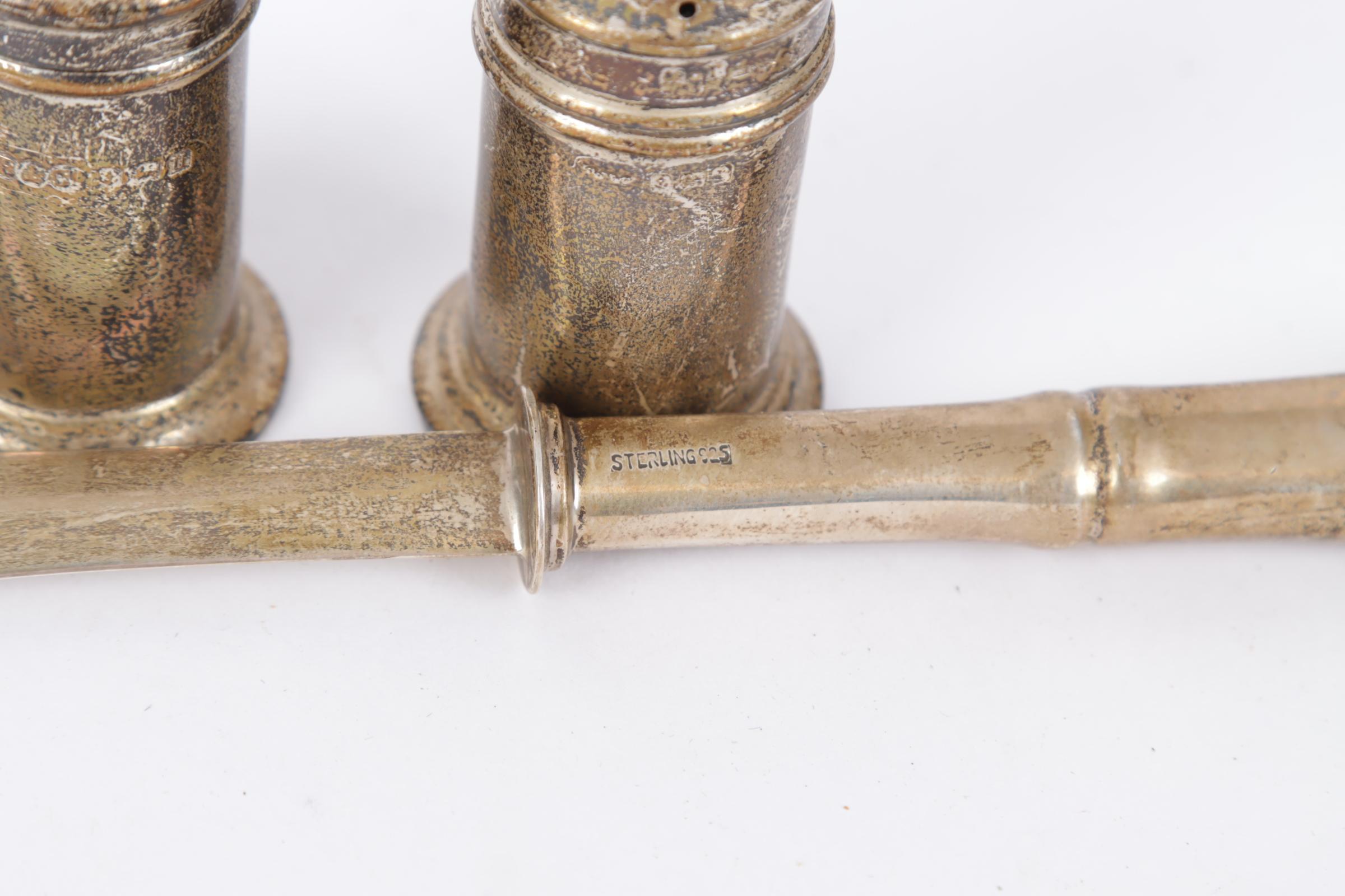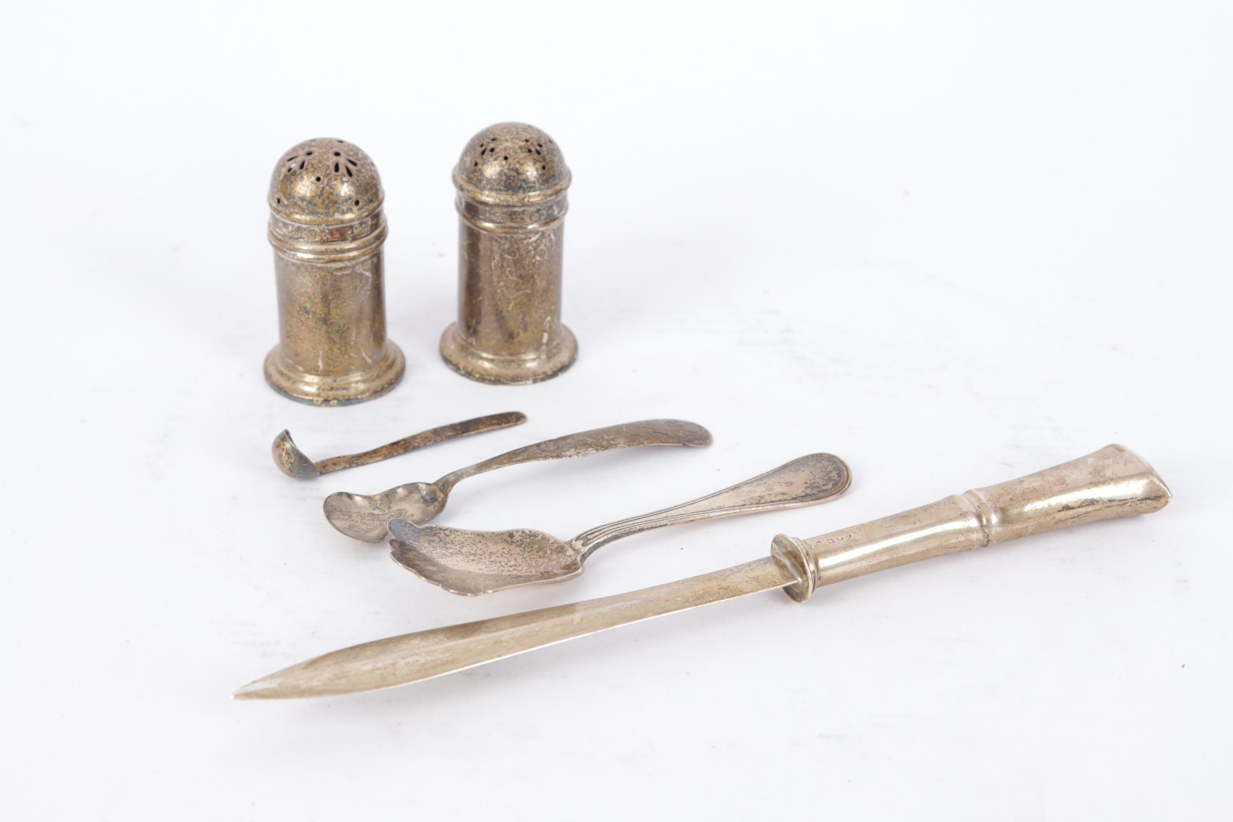 Koopje van een Engels zilveren zout en peperstel, 2 suikerscheppen, zoutlepeltjes en een briefopener