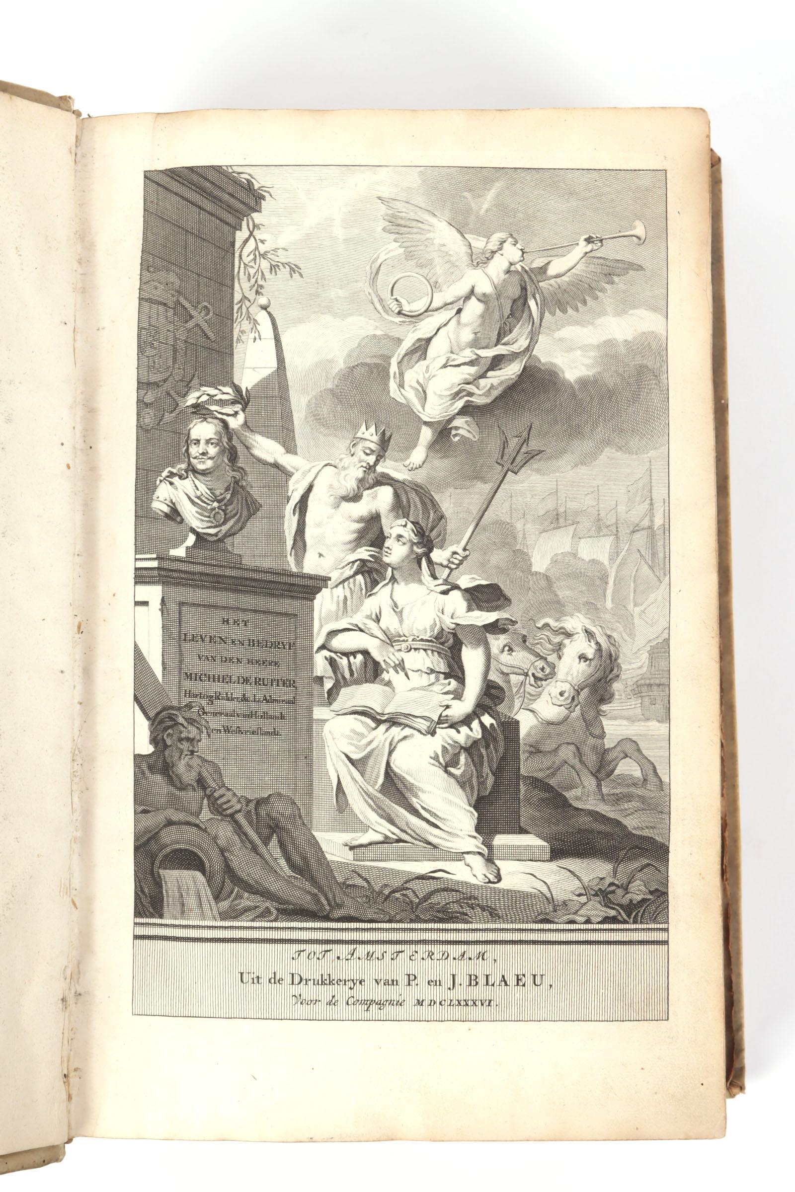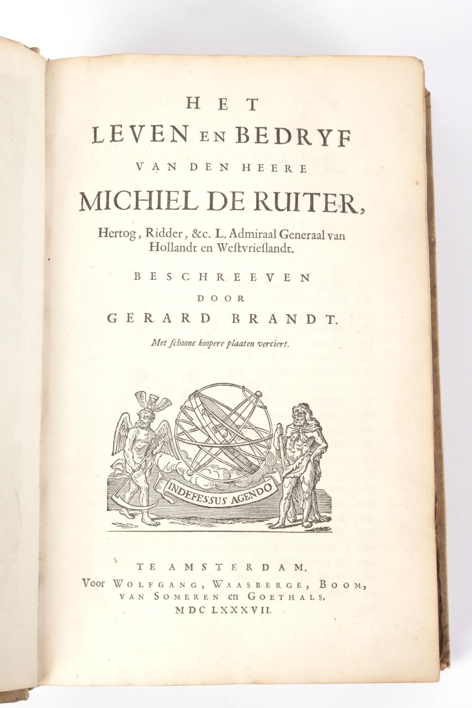 Het leven en bedrijf van den heere Michiel de Ruiter, geschreven door Gerard Brandt, Drukkers: Pieter Blaeu en Joan Blaeu, Uitgegeven: Wolfgang, Waesberge, Boom, Van Someren en Goethals, met schoone koopere platen verciert, gedateerd 1687.