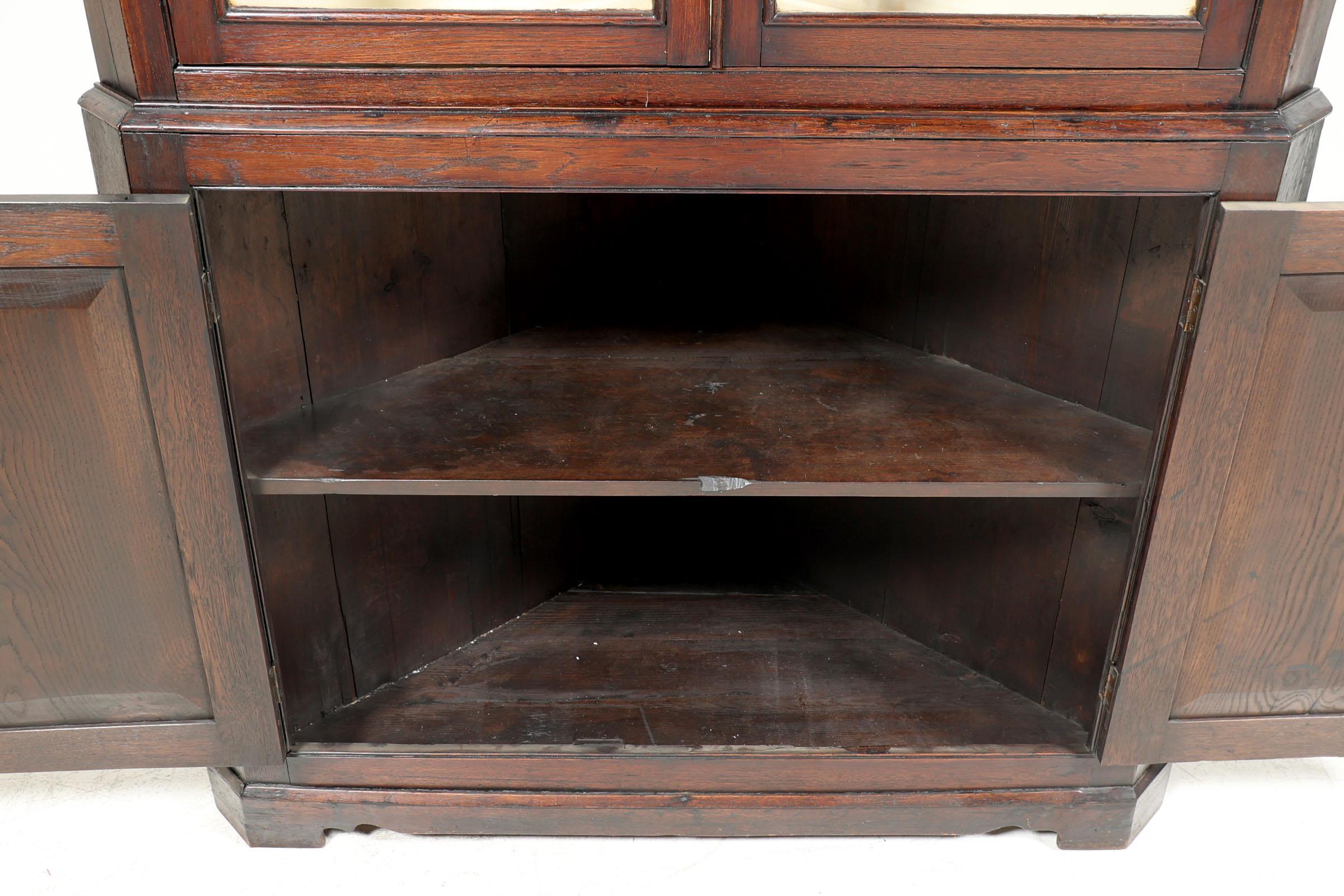 Antieke eikenhouten 4-deurs hoekkast waarvan de bovenste deuren beglaasd, h.198 x b.107 x d.60 cm.