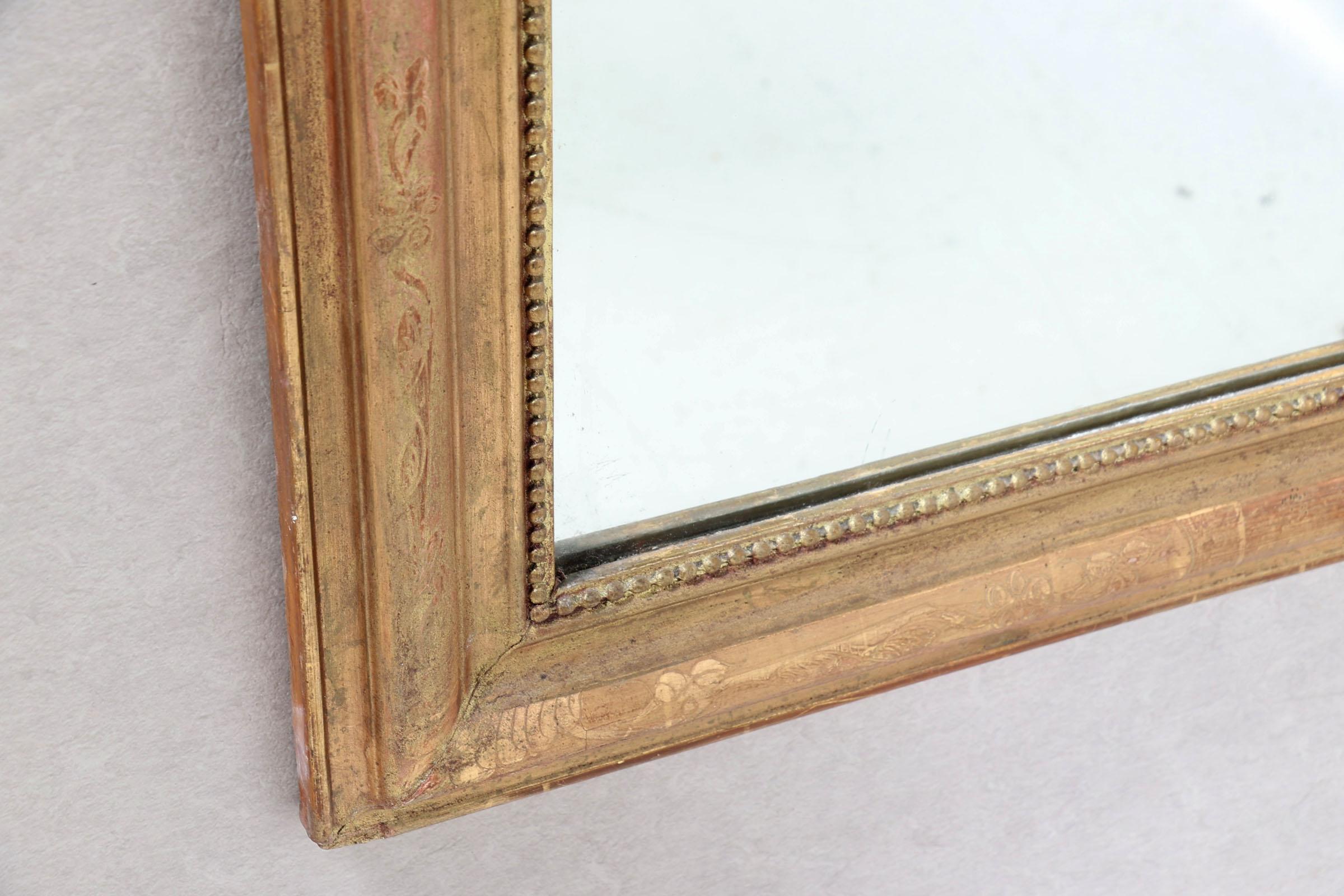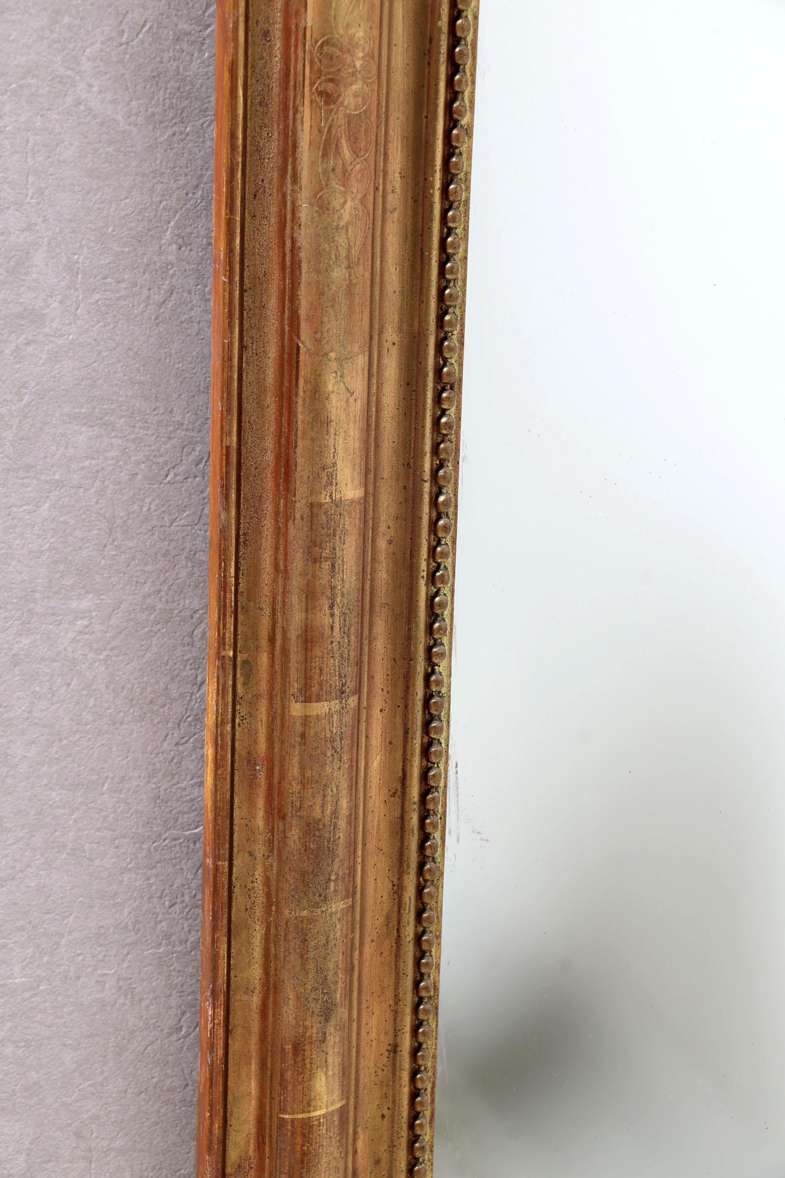 Antieke spiegel in vergulde lijst met parelrand, 126 x 89 cm.