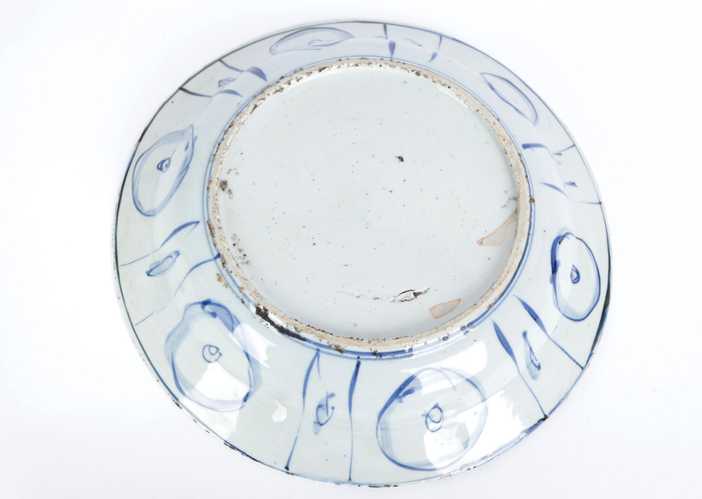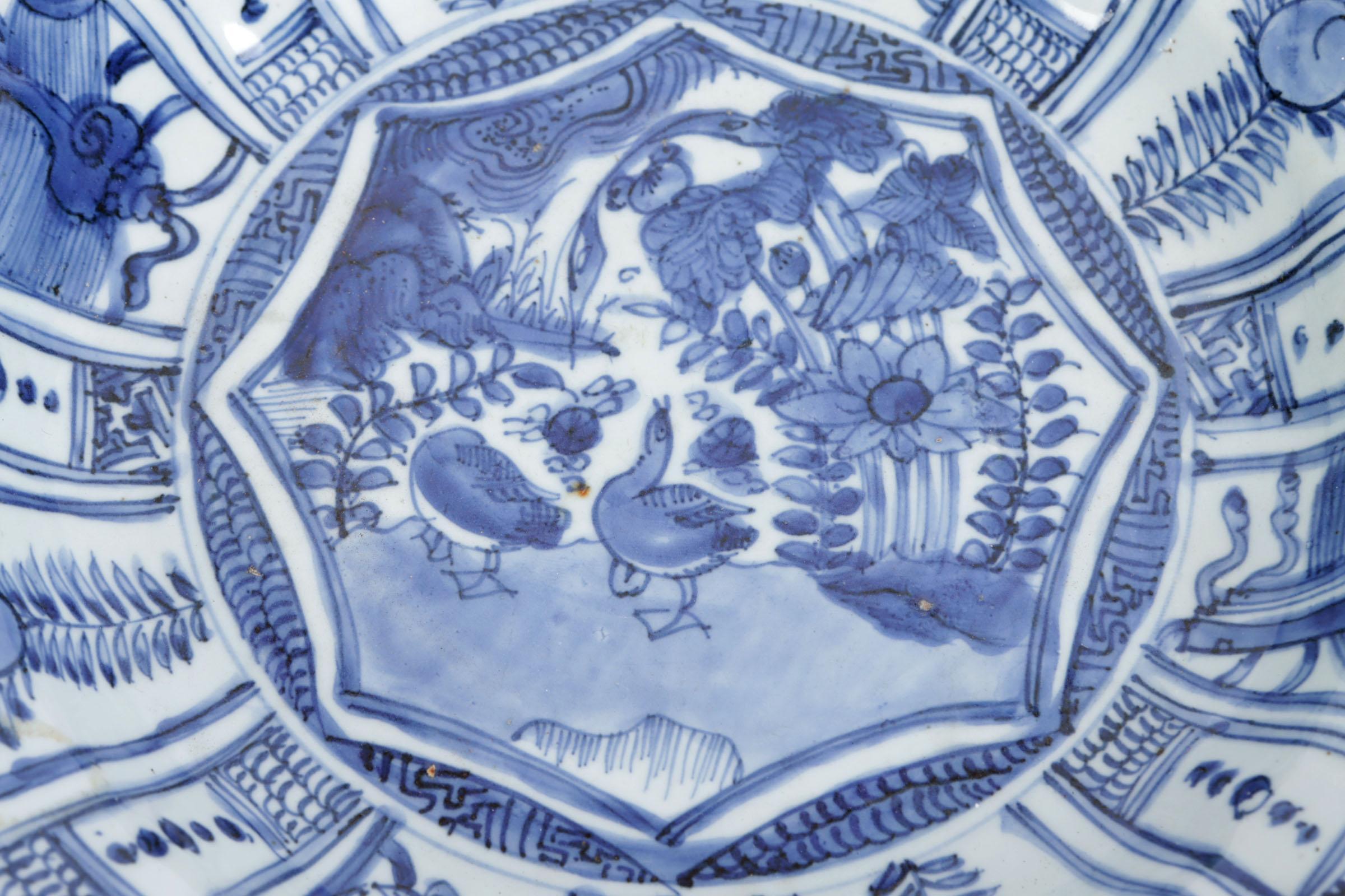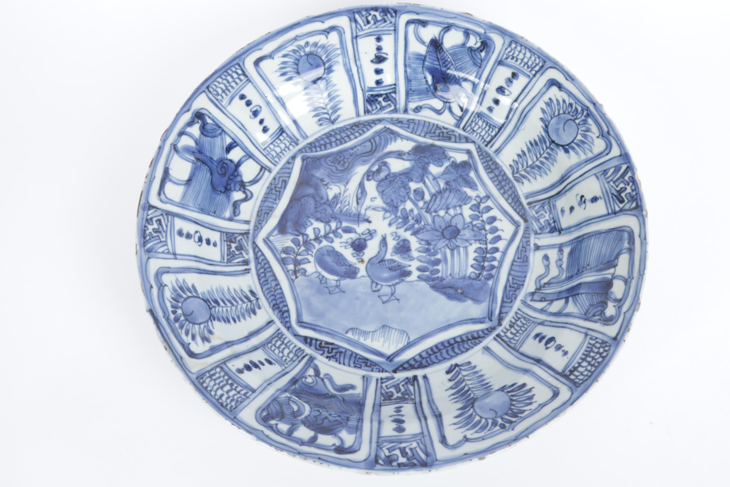 Antieke blauw/wit Chinees porseleinen Wanli (1573-1619) schotel met decoratie van vogels en florale motieven, diam. 32 cm.