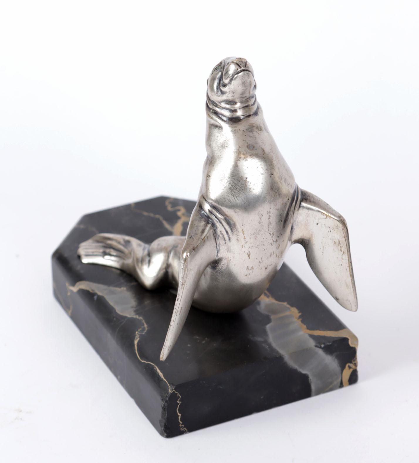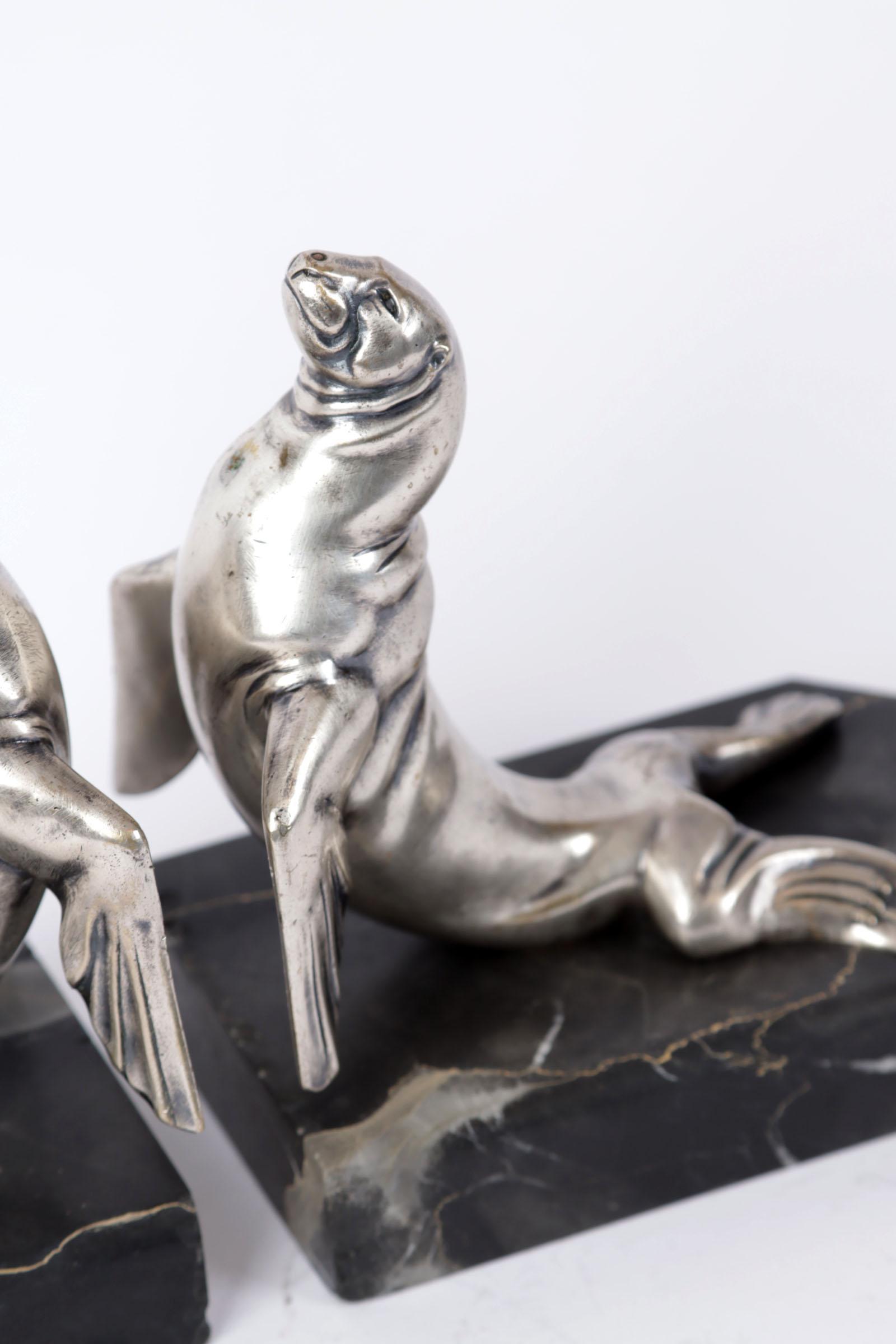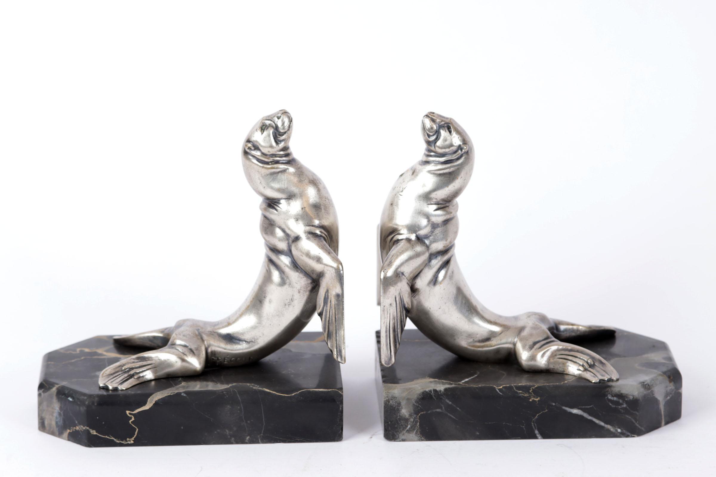 Stel Art Deco boekensteunen met voorstelling van bronzen zeeleeuwen op marmer voetje gesigneerd Frécourt - Maurice Frécourt 1890-1961
