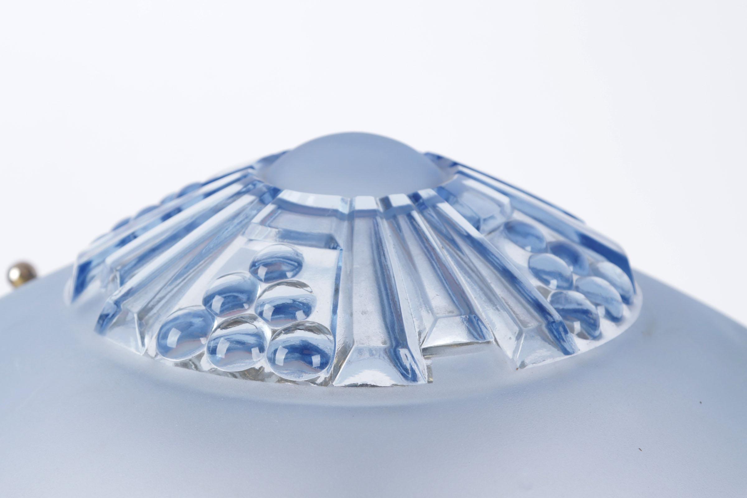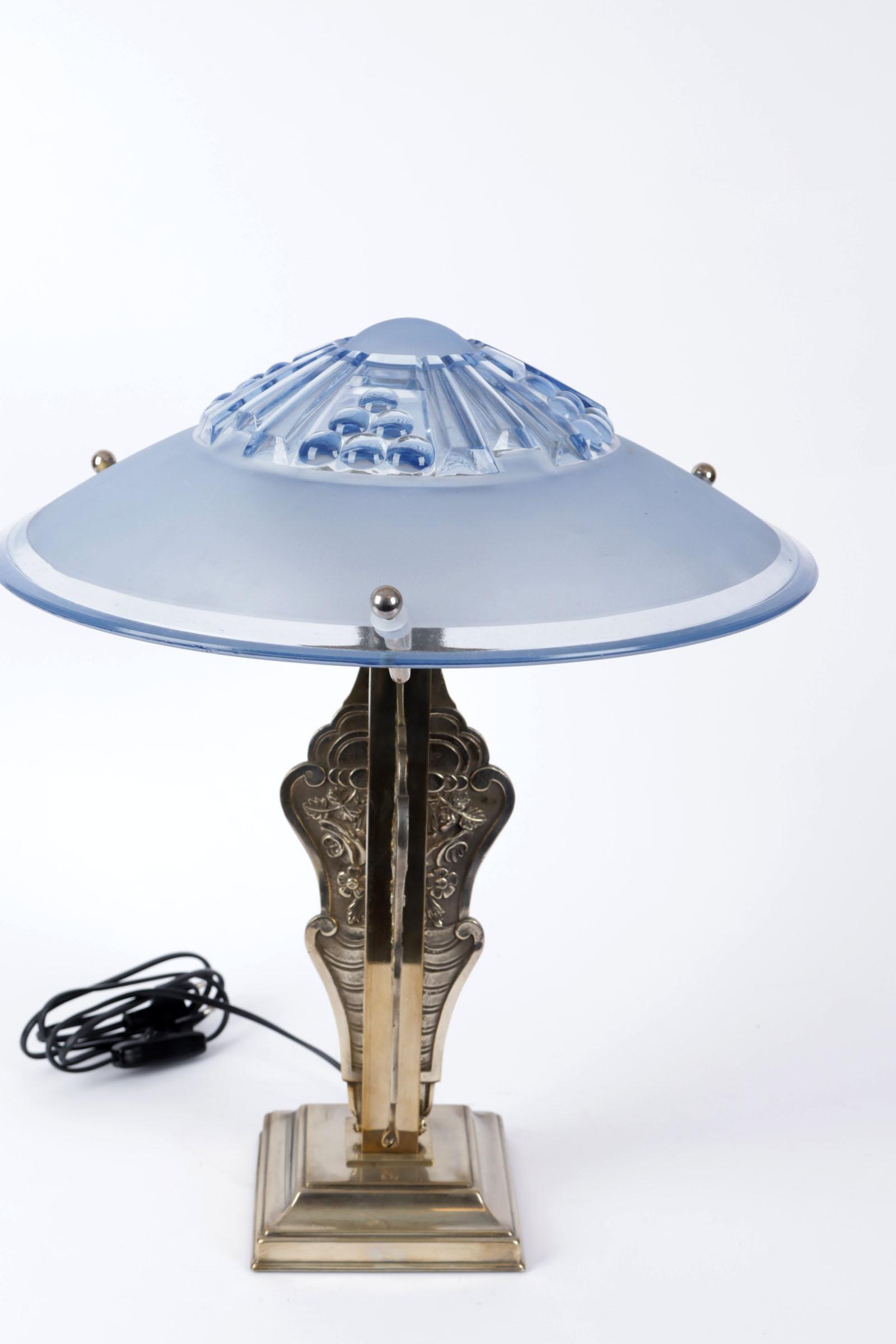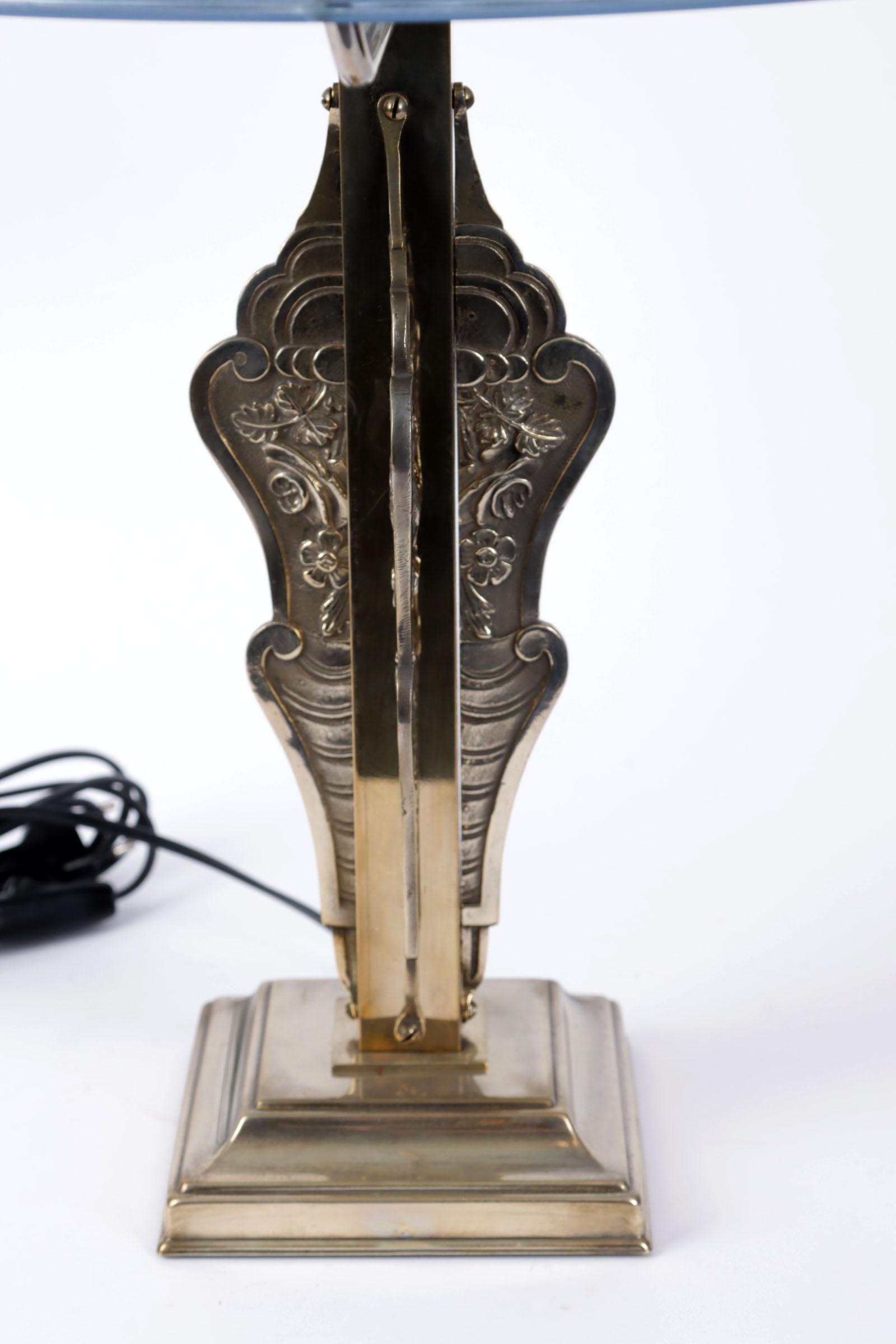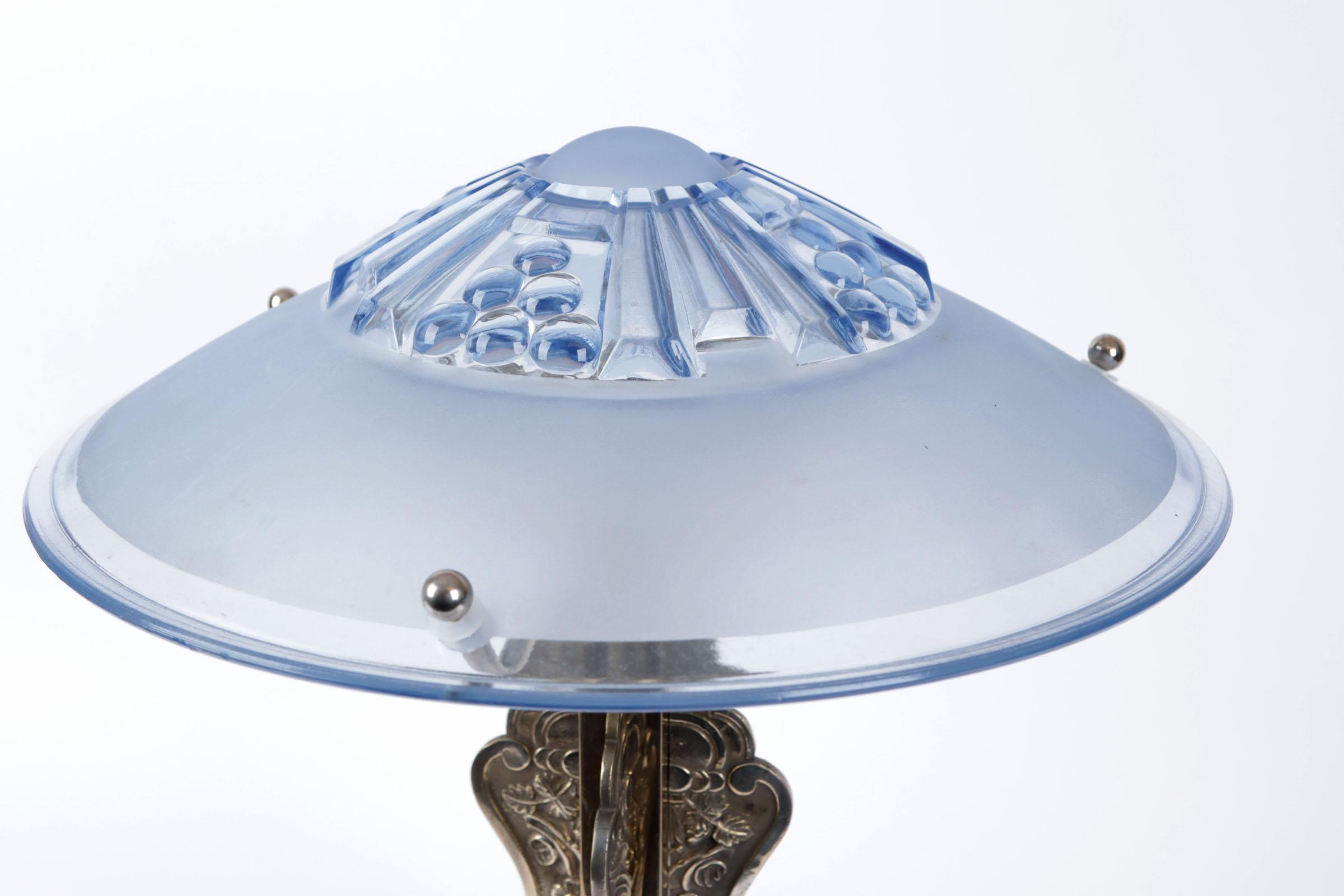 Art Deco tafellamp op verzilverde voet met blauw glazen kap in hoogreliëf