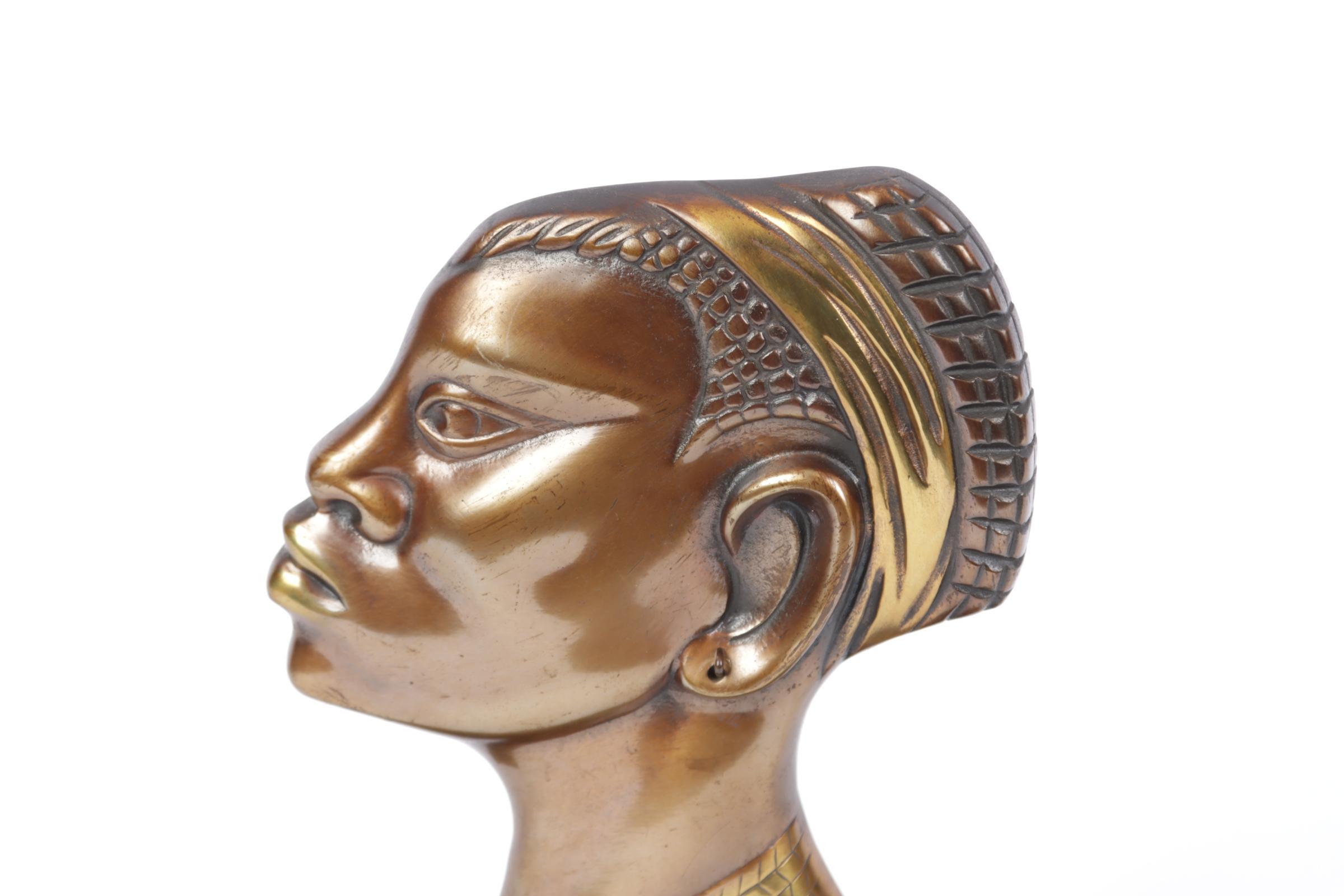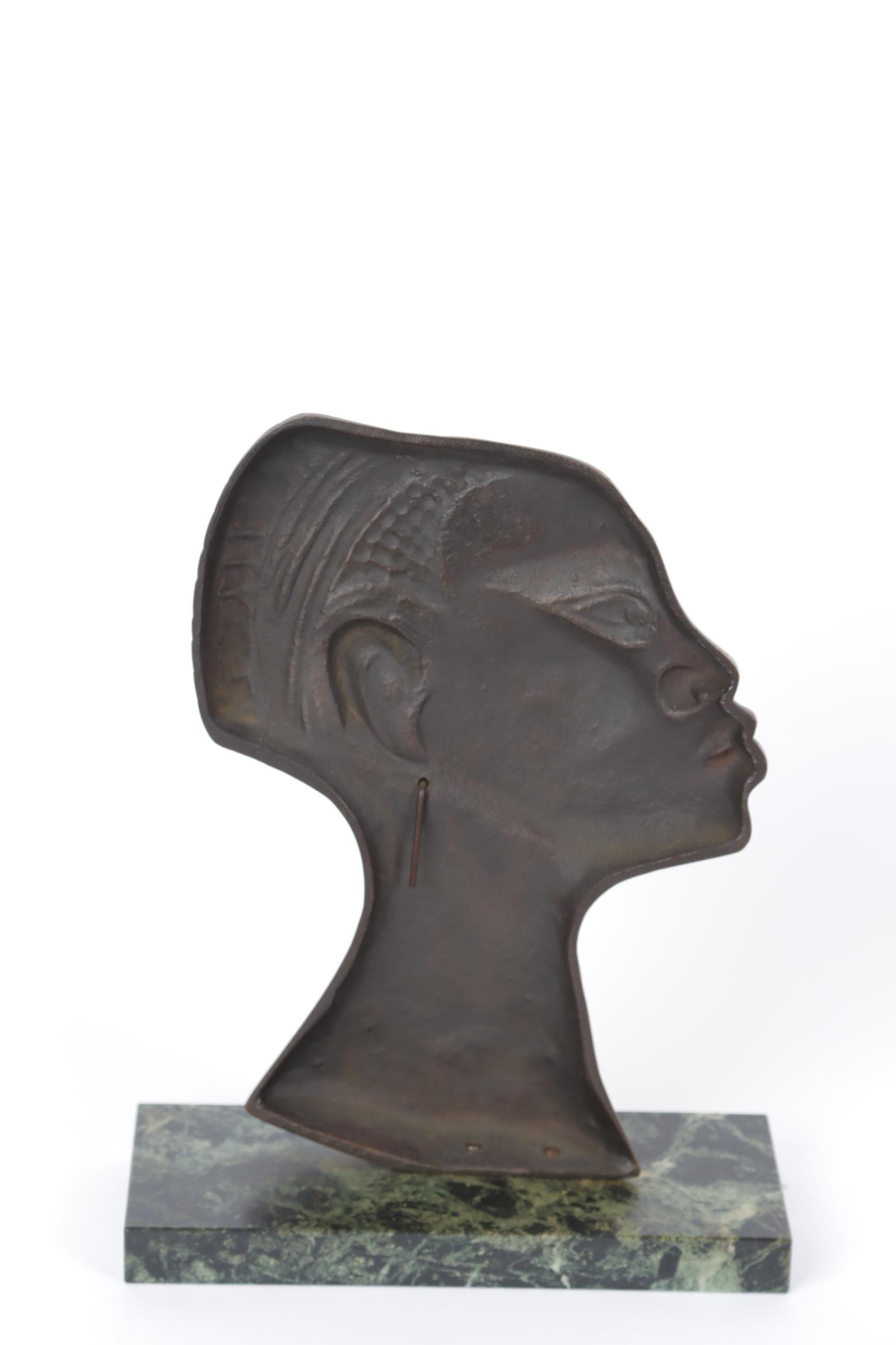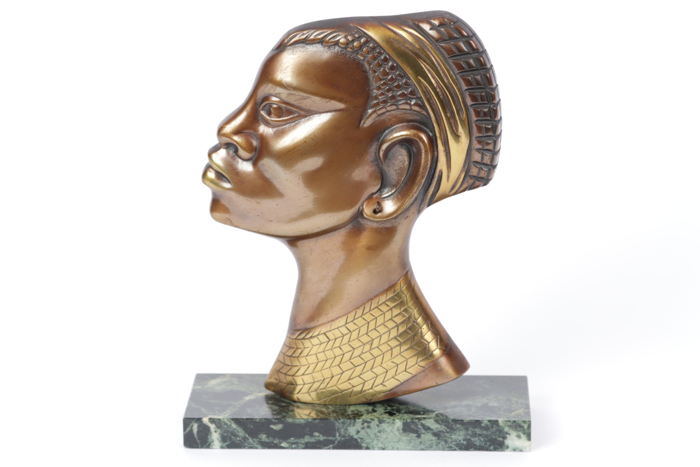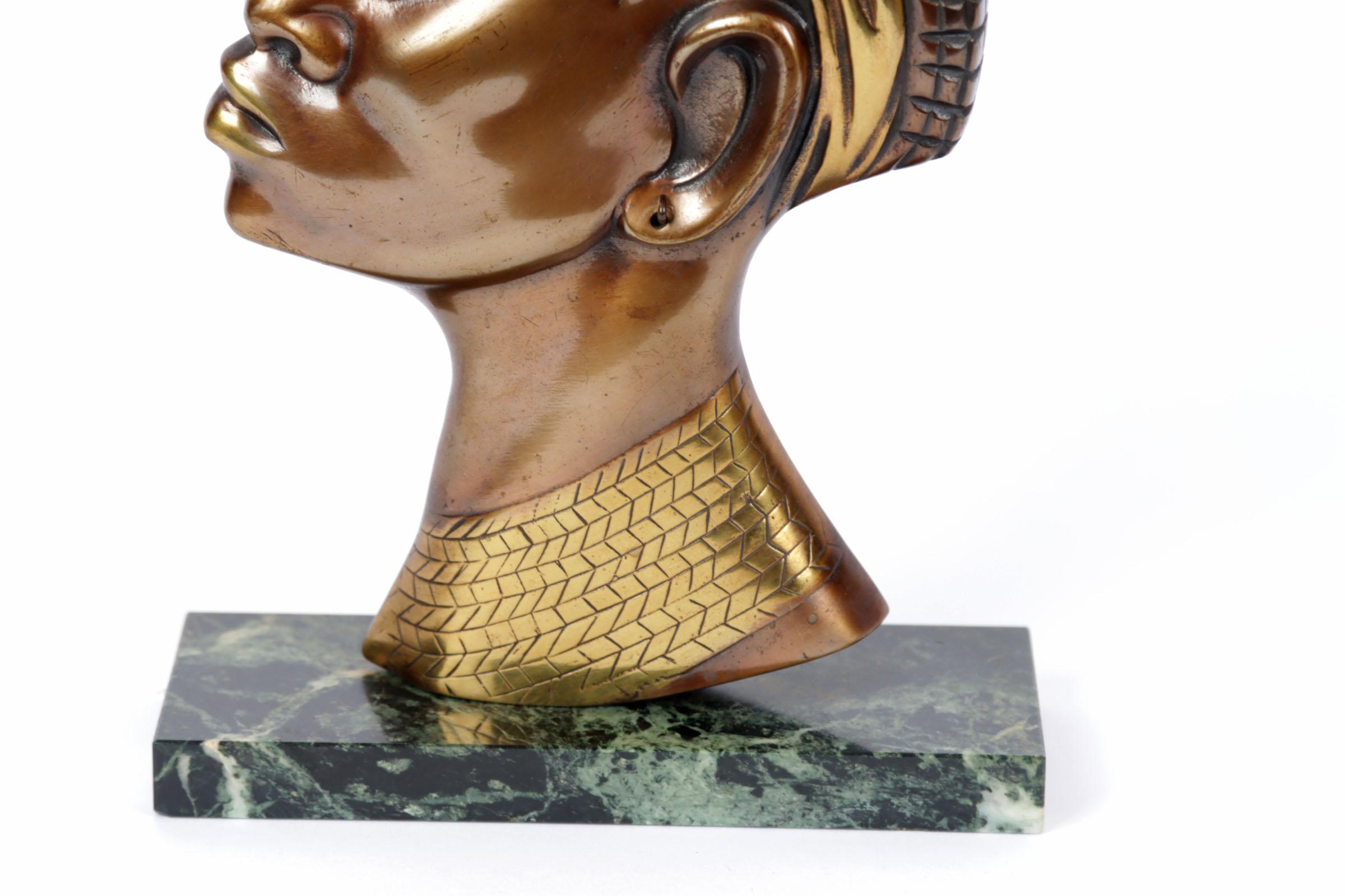 Bronzen Art Deco borstbeeld van een Afrikaanse vrouw op groen marmer basement