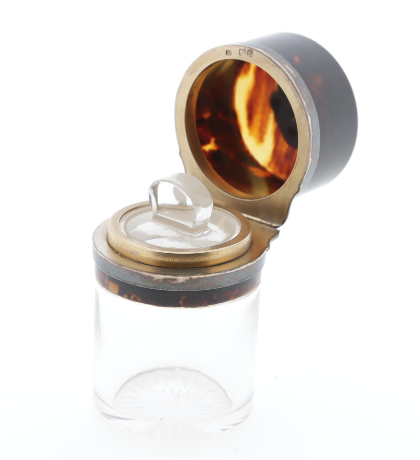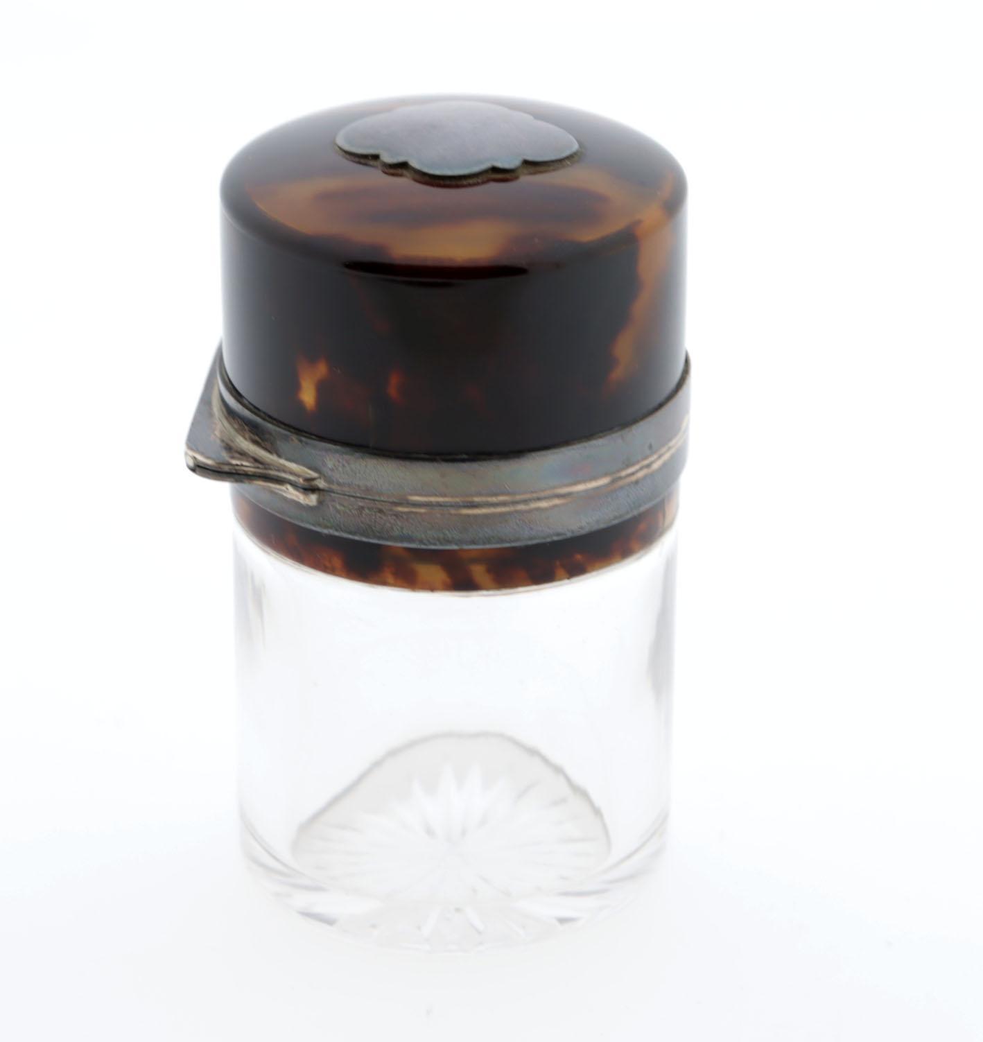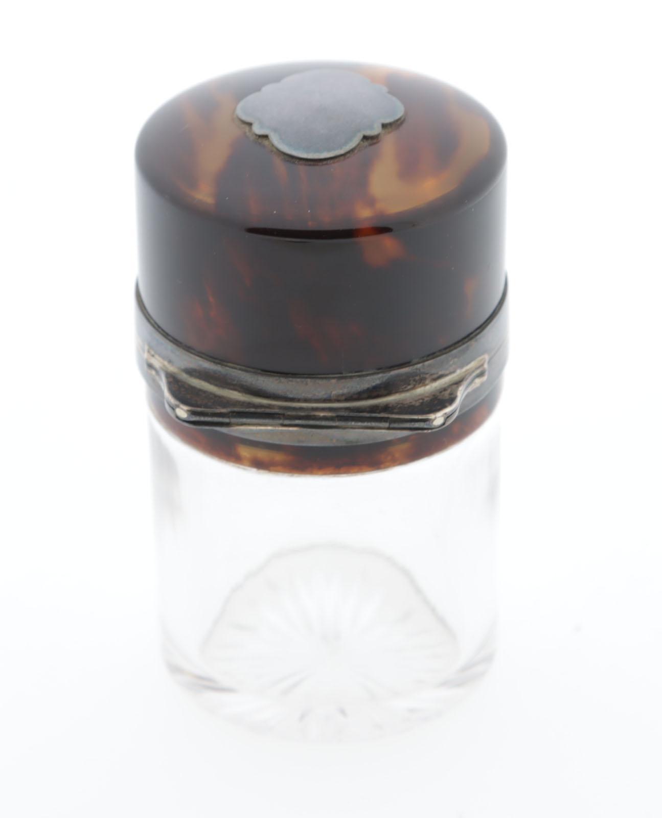 toilettafel fles, crystal, zilver en schildpad, crystallen binnendop, hoogte 8,5 cm