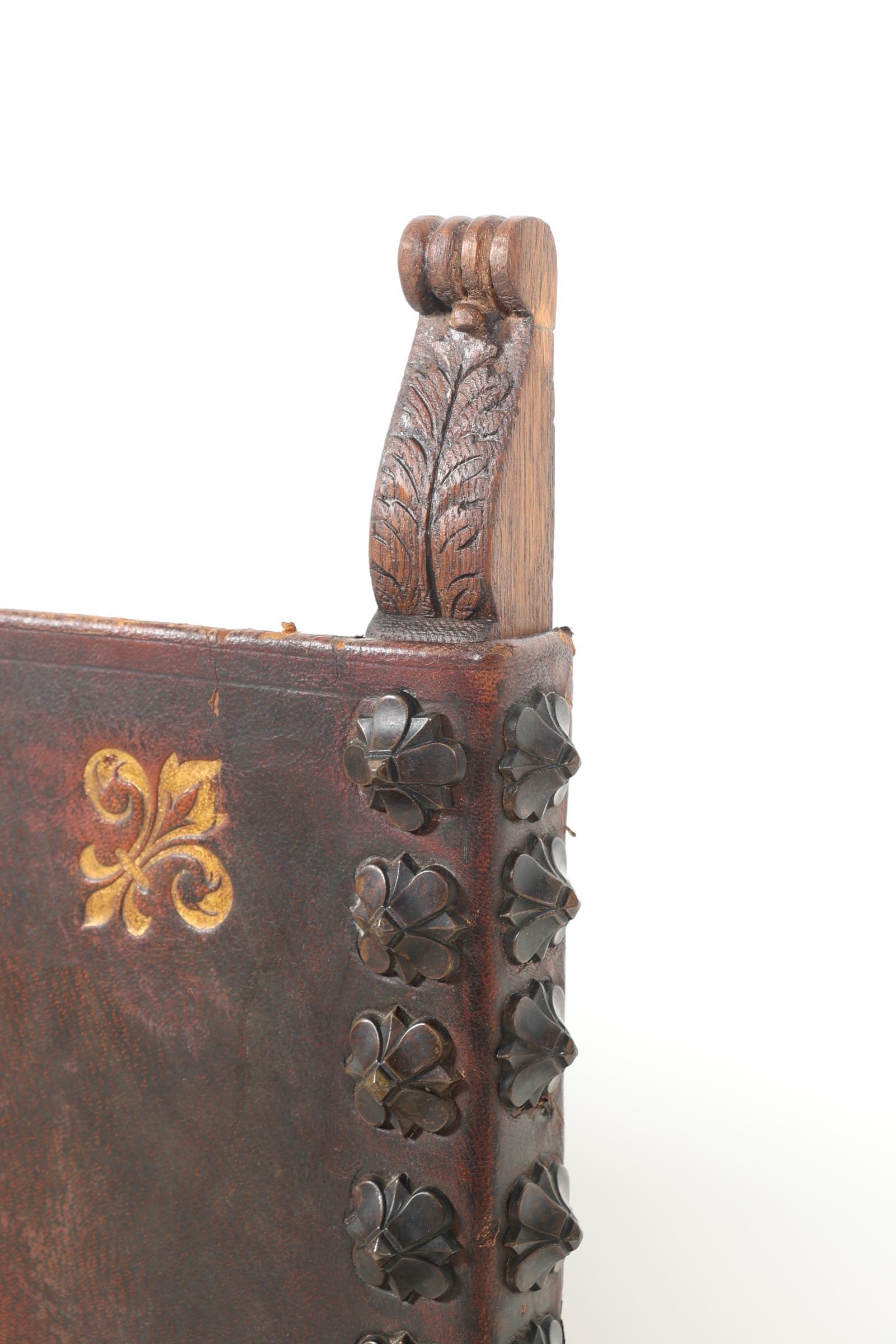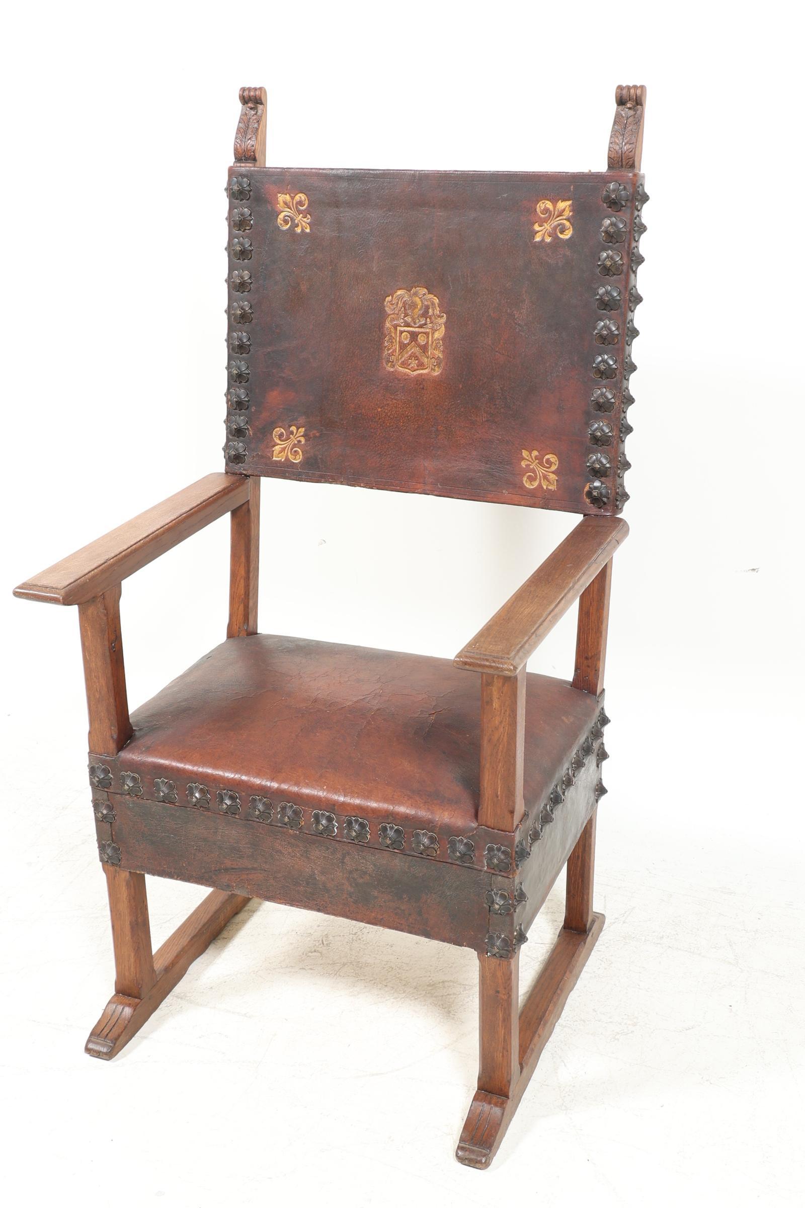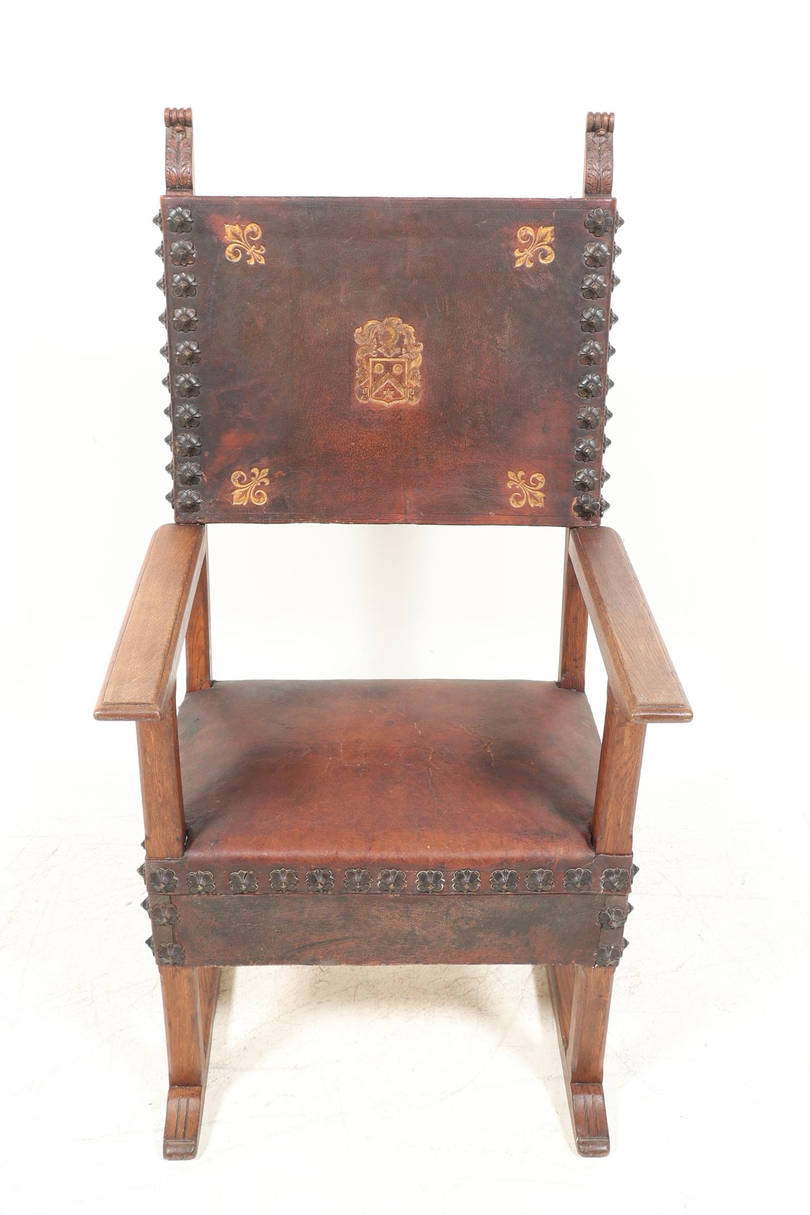 Oude eikenhouten armstoel met lederen bekleding en daarop een wapenschild en Franse lelies, Spaanse stijl “troon” die in het Amstel Hotel in Amsterdam gestaan heeft.