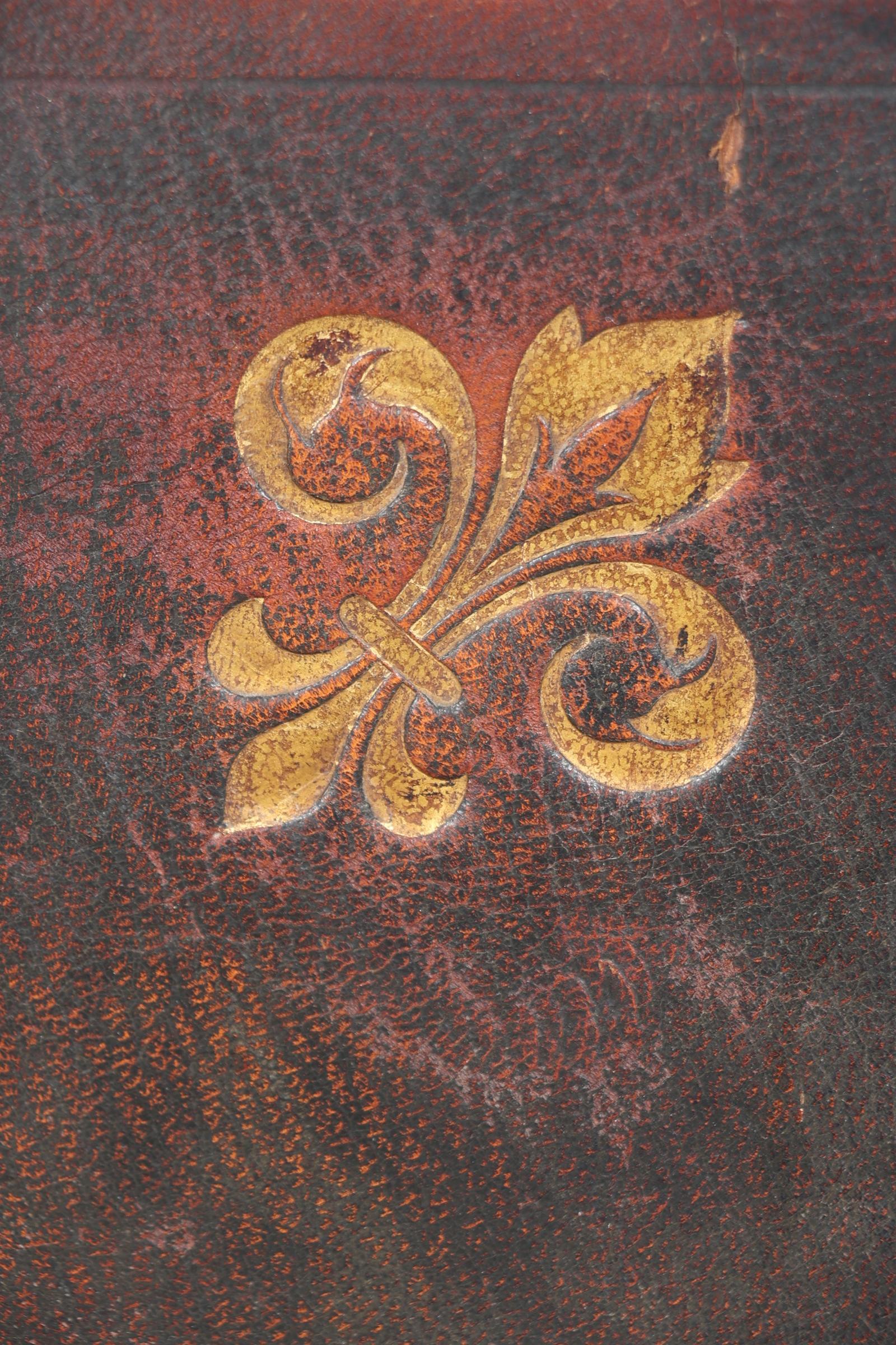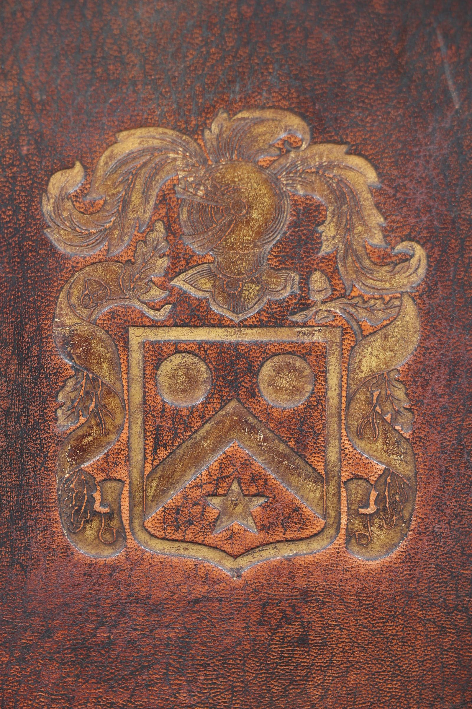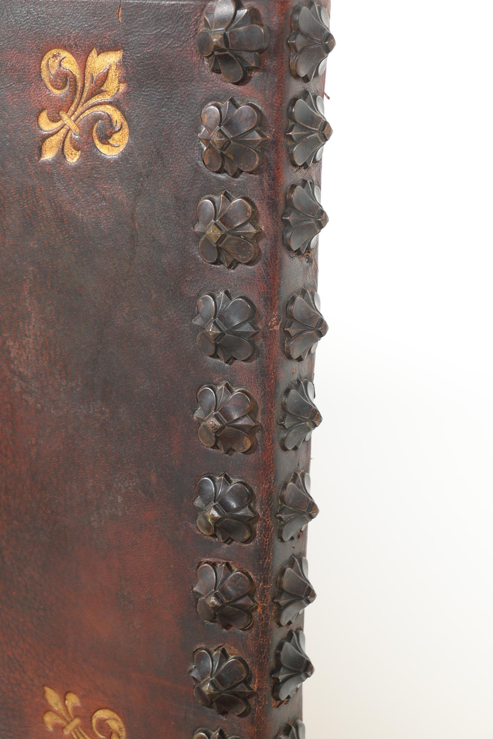 Oude eikenhouten armstoel met lederen bekleding en daarop een wapenschild en Franse lelies, Spaanse stijl “troon” die in het Amstel Hotel in Amsterdam gestaan heeft.