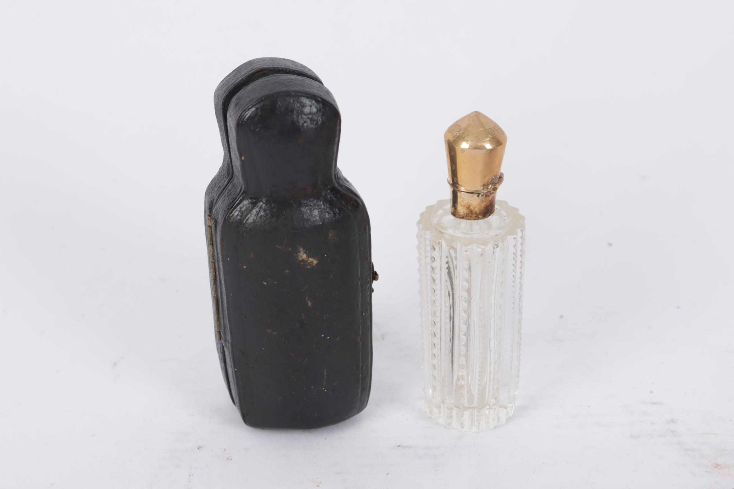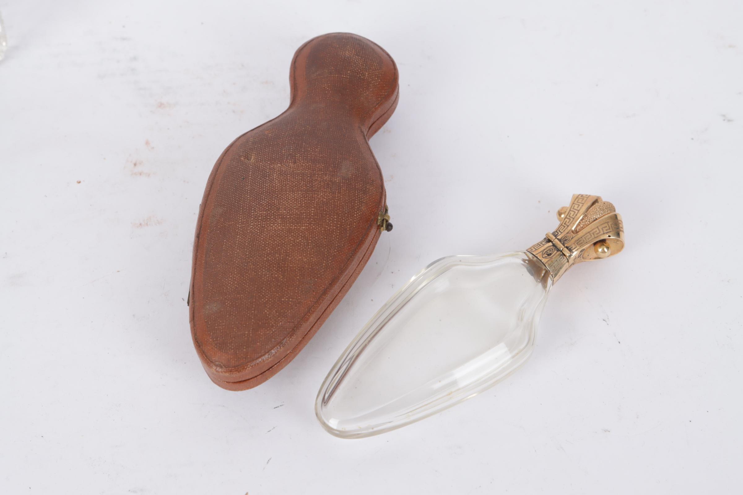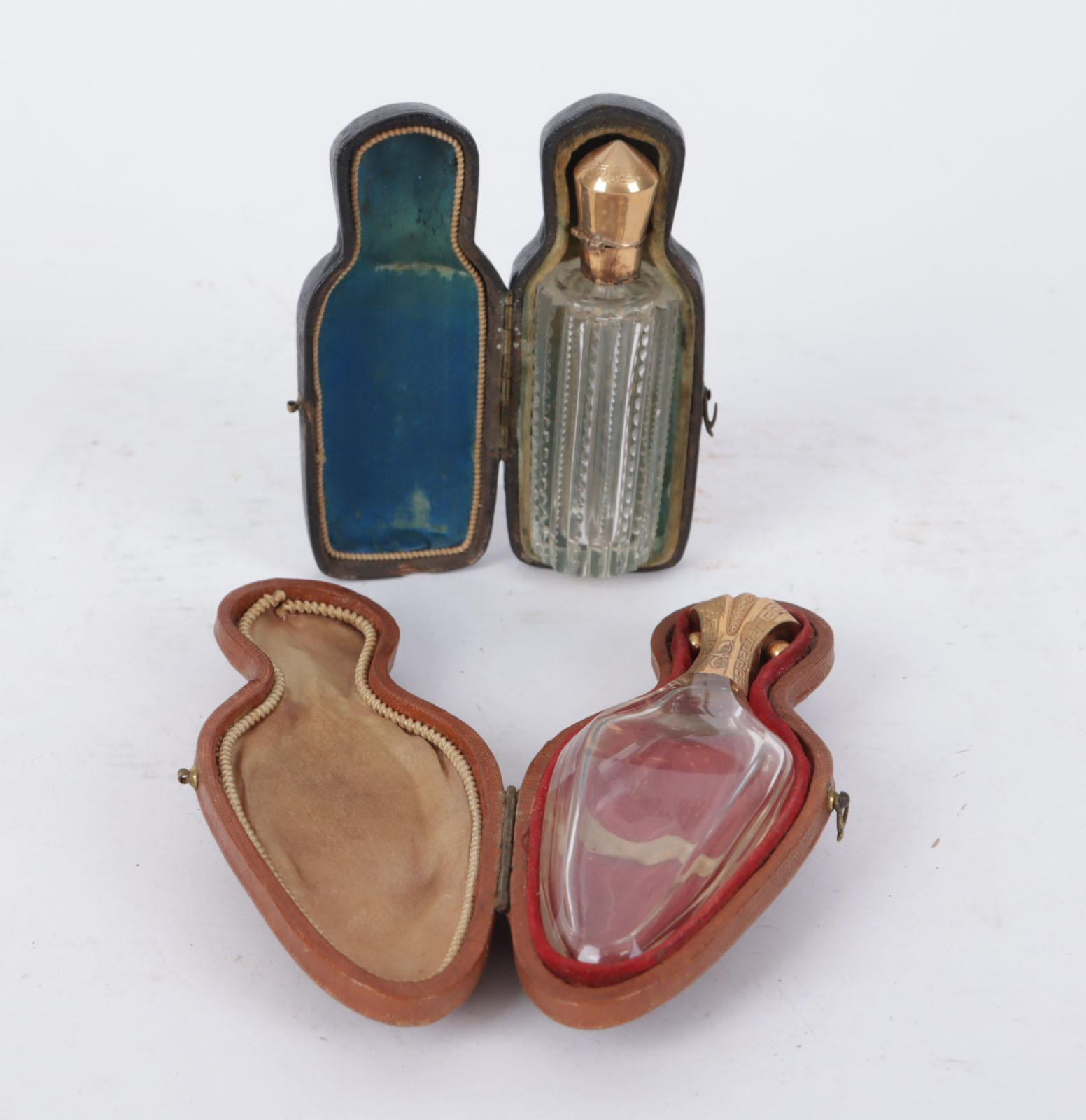 2 Kristallen parfumflacons met gouden dop in foudraal