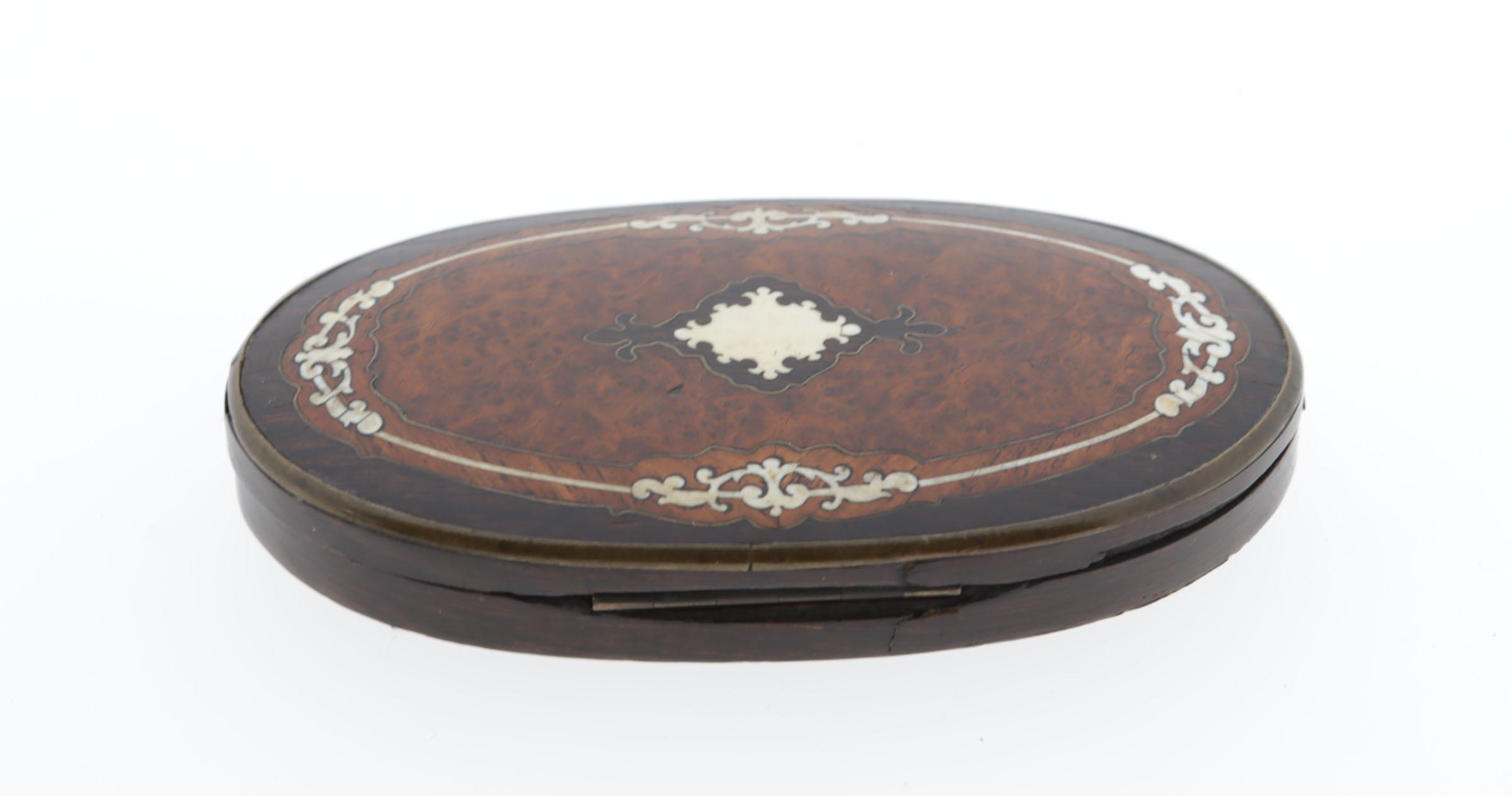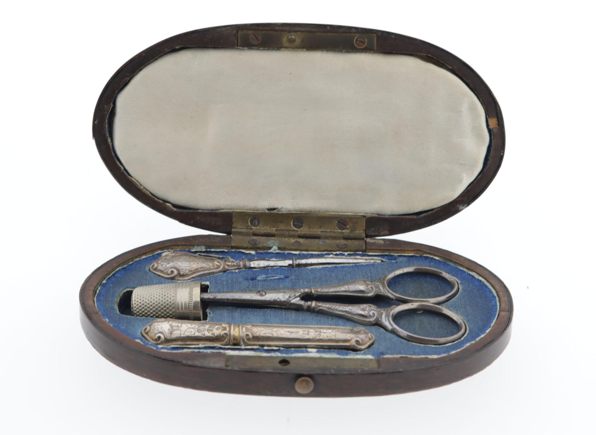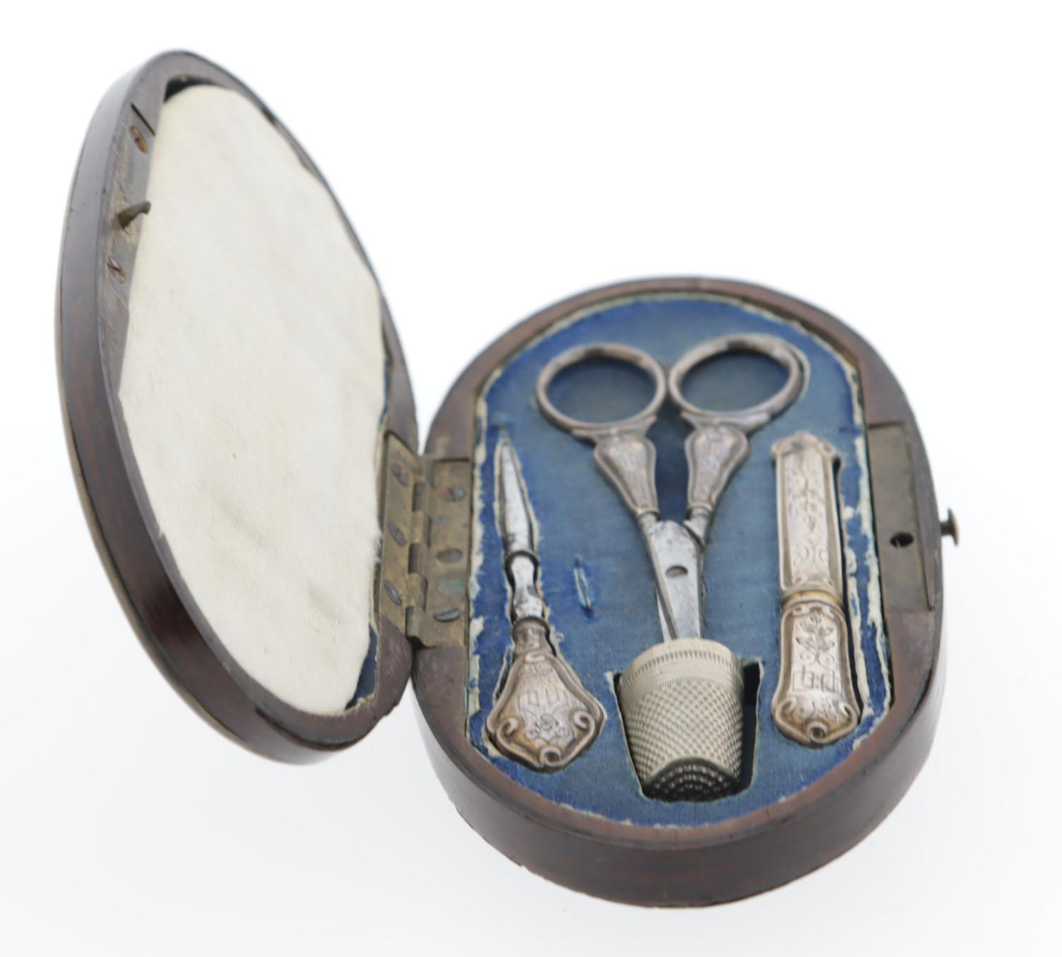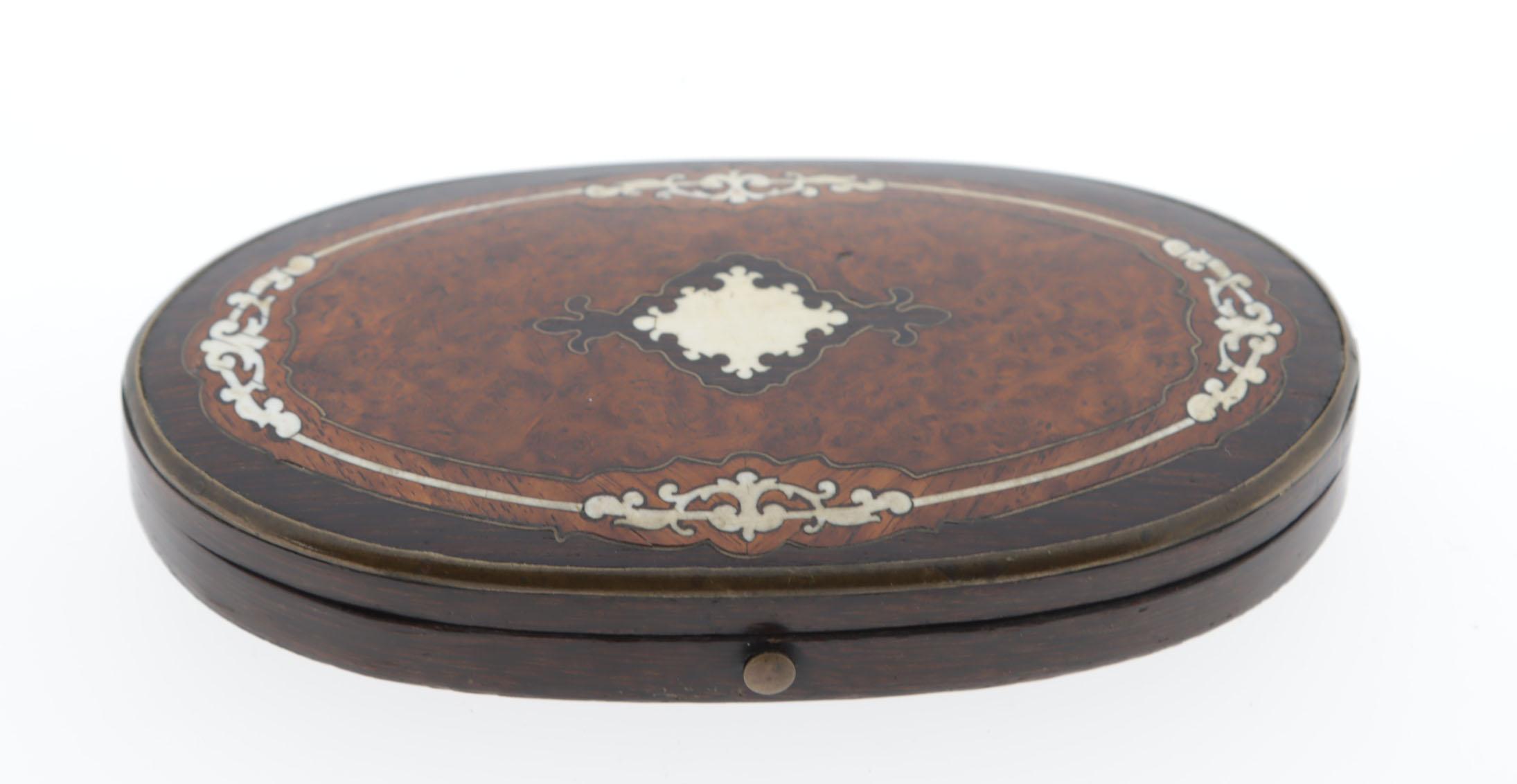 ovale, gebolde houten naaidoos met been ingelegd, voorzien van priem, naaldenkoker, schaar en vingerhoed, verzilverd metaal, 19e eeuws, Frans, 12x6,5 cm