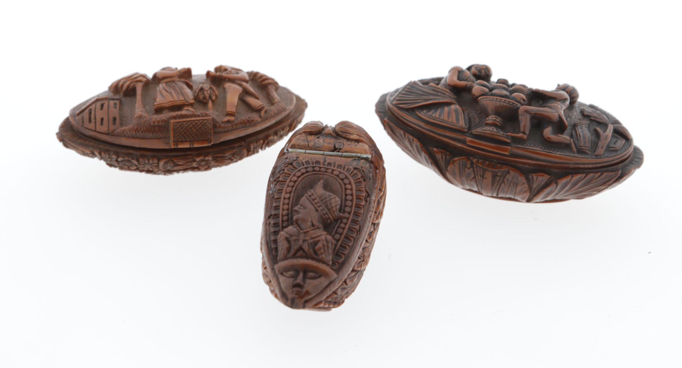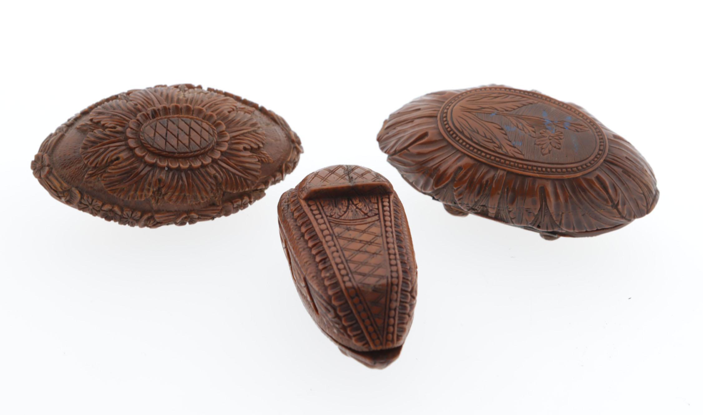3 snuifdozen van coquille noten, waaronder 1 met man en vrouw tussen 2 bomen en op de bodemzijde plantmotieven en bloemen rondom, Frans, 18e eeuw, 7,5x3x4,2 cm