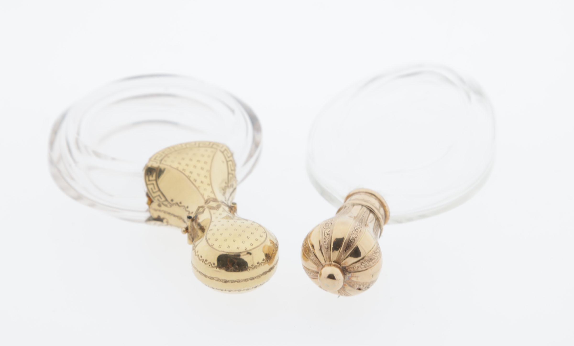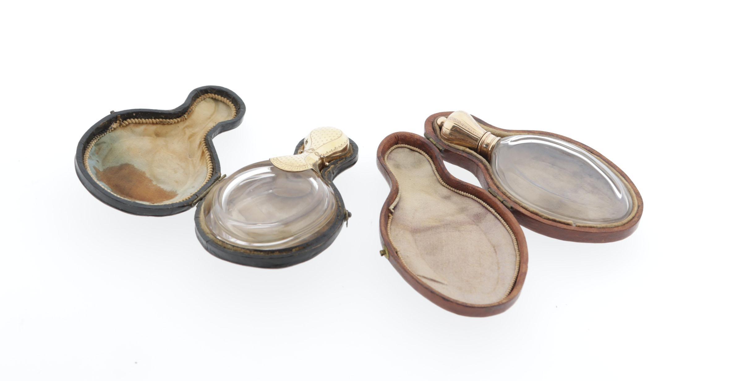 1 crystallen fles in zwart leren foudraal, gouden montuur, gouden binnenstopje, hoogte 8,5 cm, 1 crystallen fles in bruin leren foudraal, gouden montuur en dop, crystallen binnendop, hoogte 10 cm