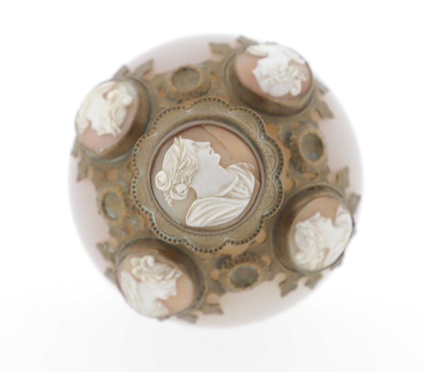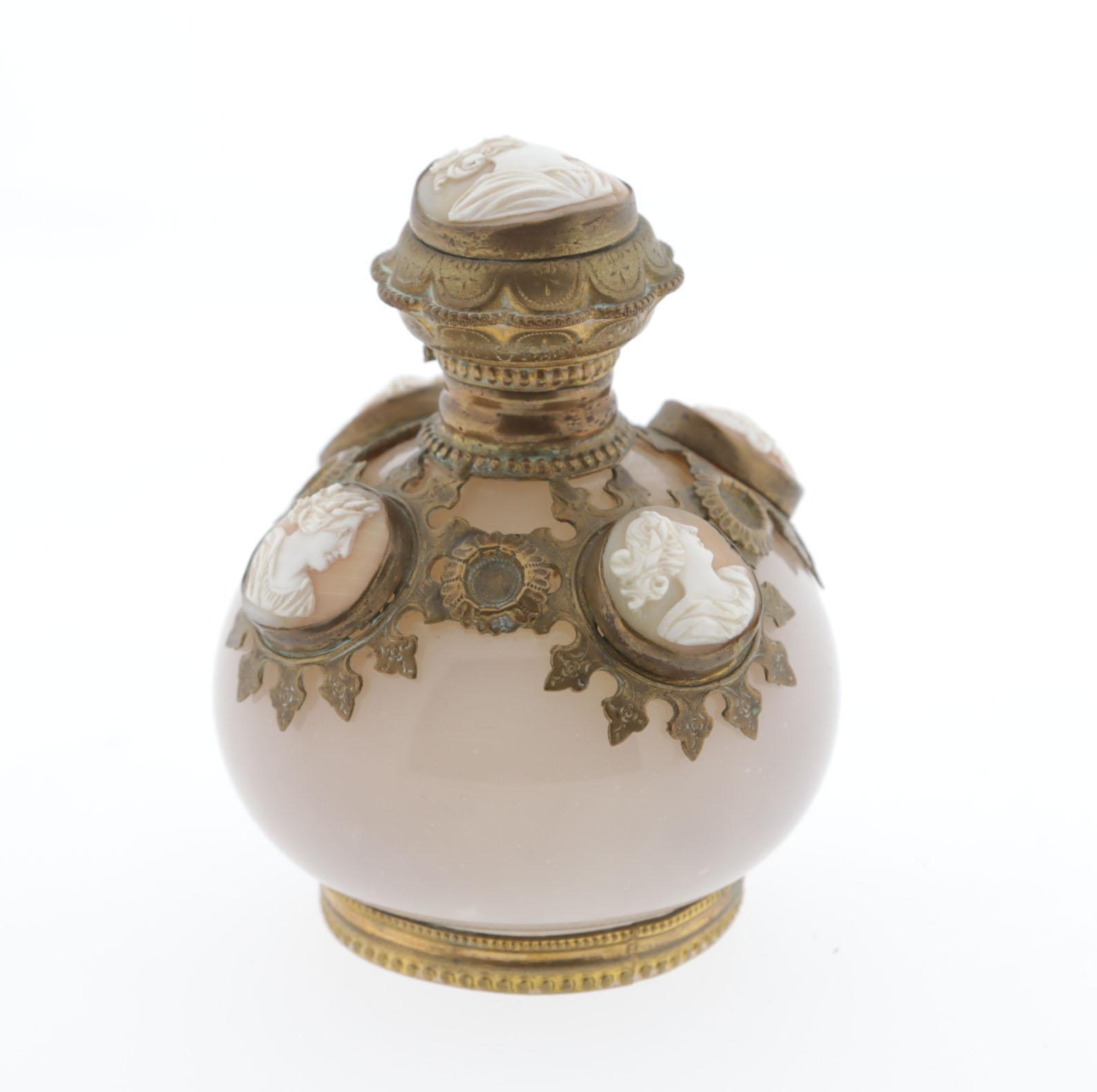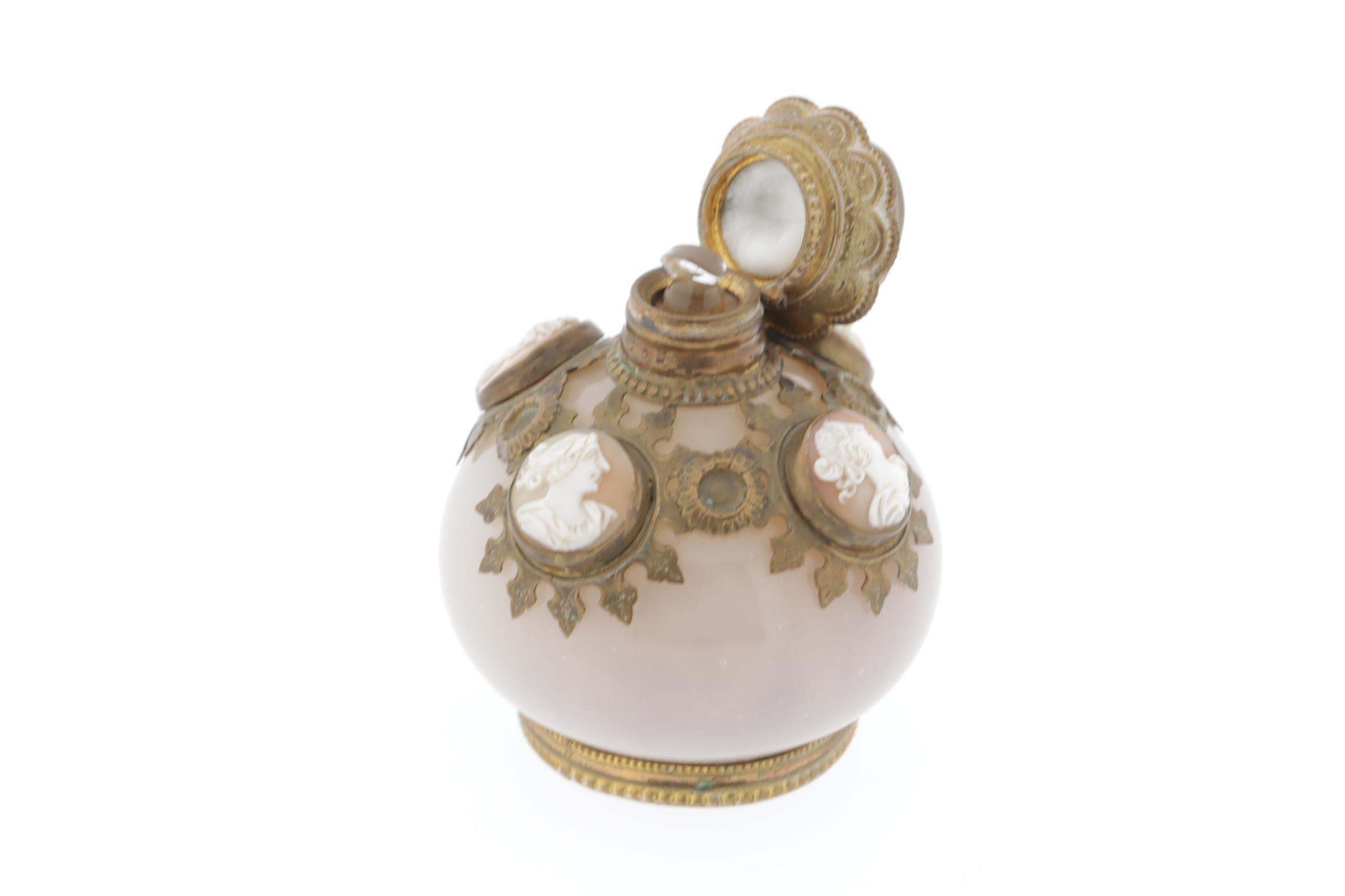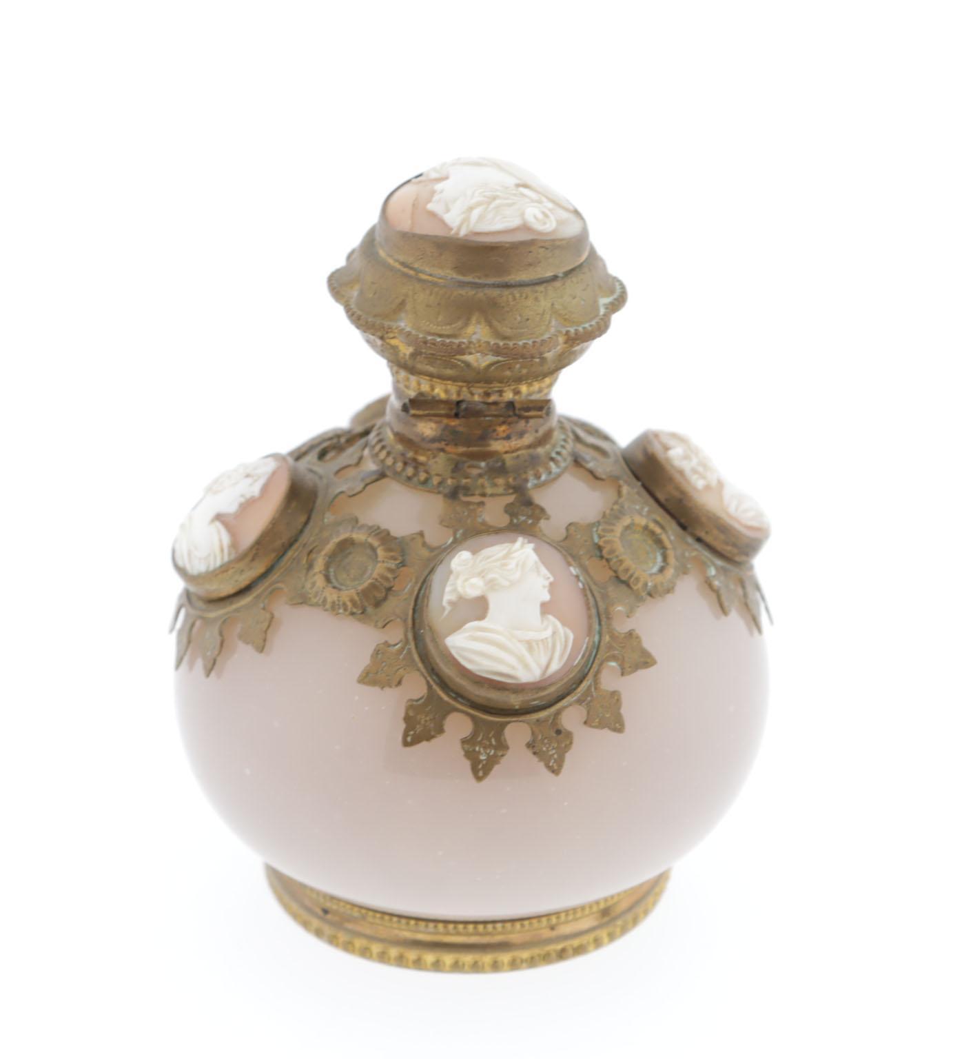 parfumfles roze opaline met metalen montuur waarin 5 cameeën, crystallen binnendop, Frans, 19e eeuws, 9,5 cm hoog