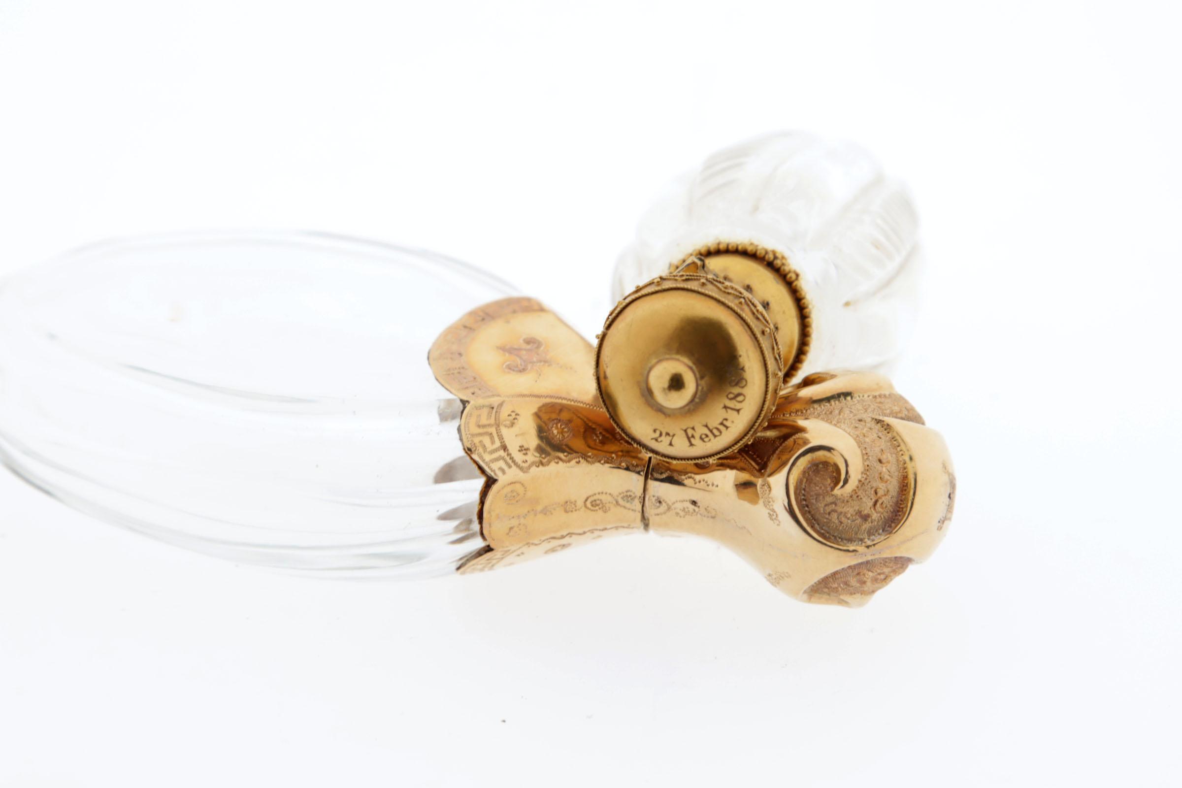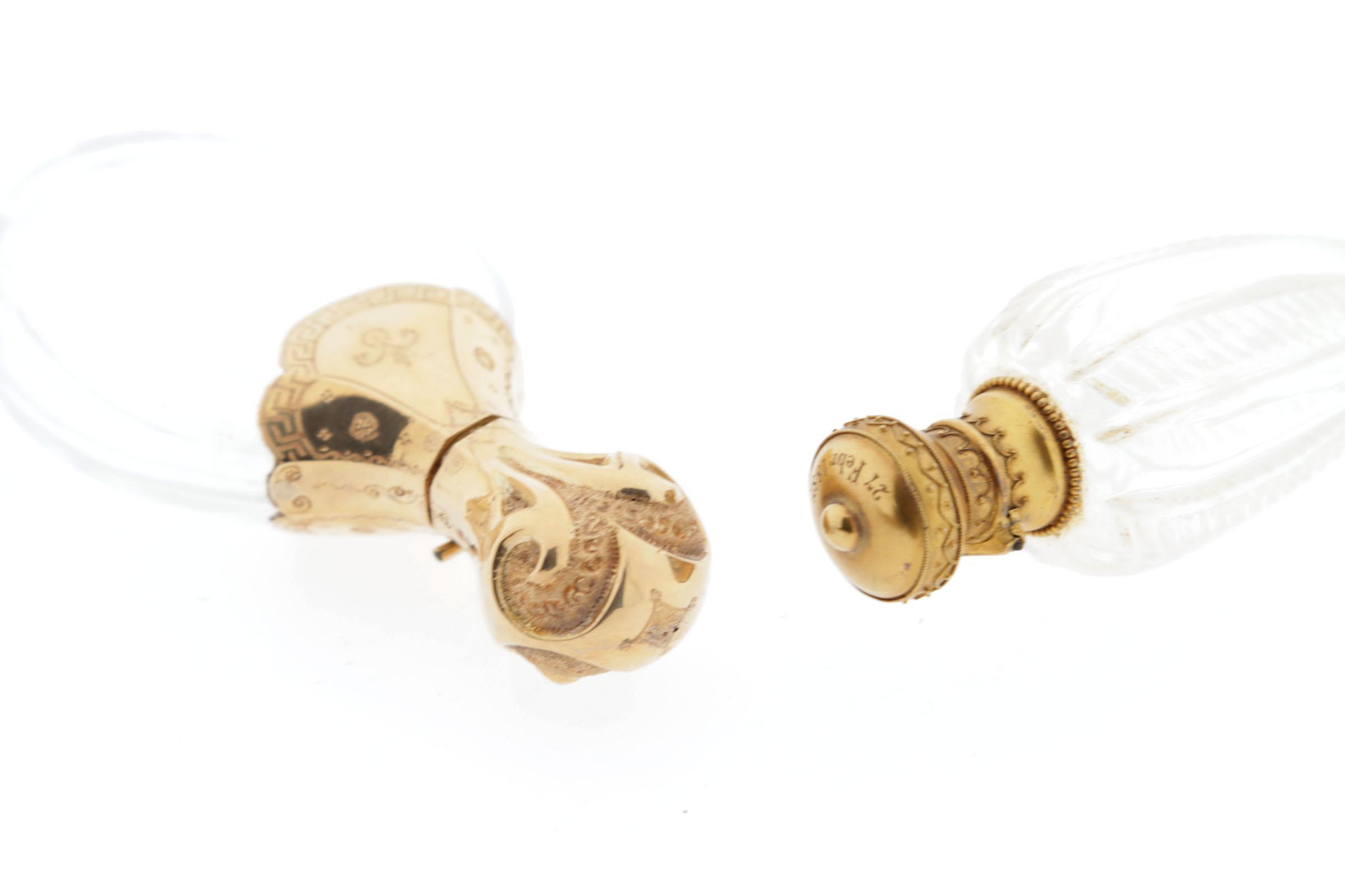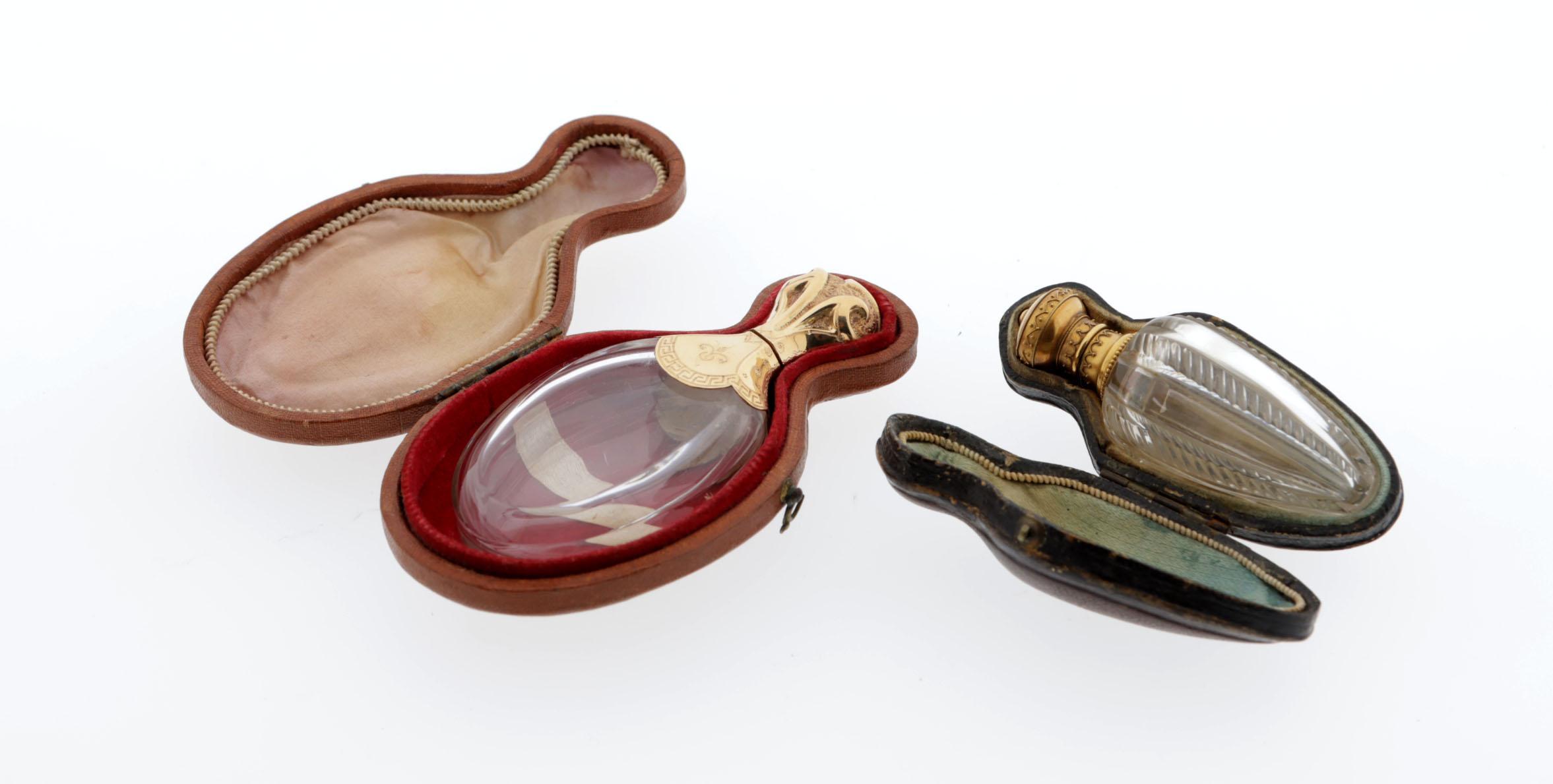 1 klein crystallen flesje in leren foudraal, bewerkte gouden dop, 7 cm, 1 crystallen fles in bruin leren foudraal, gouden dop, crystallen binnendop, 9 cm