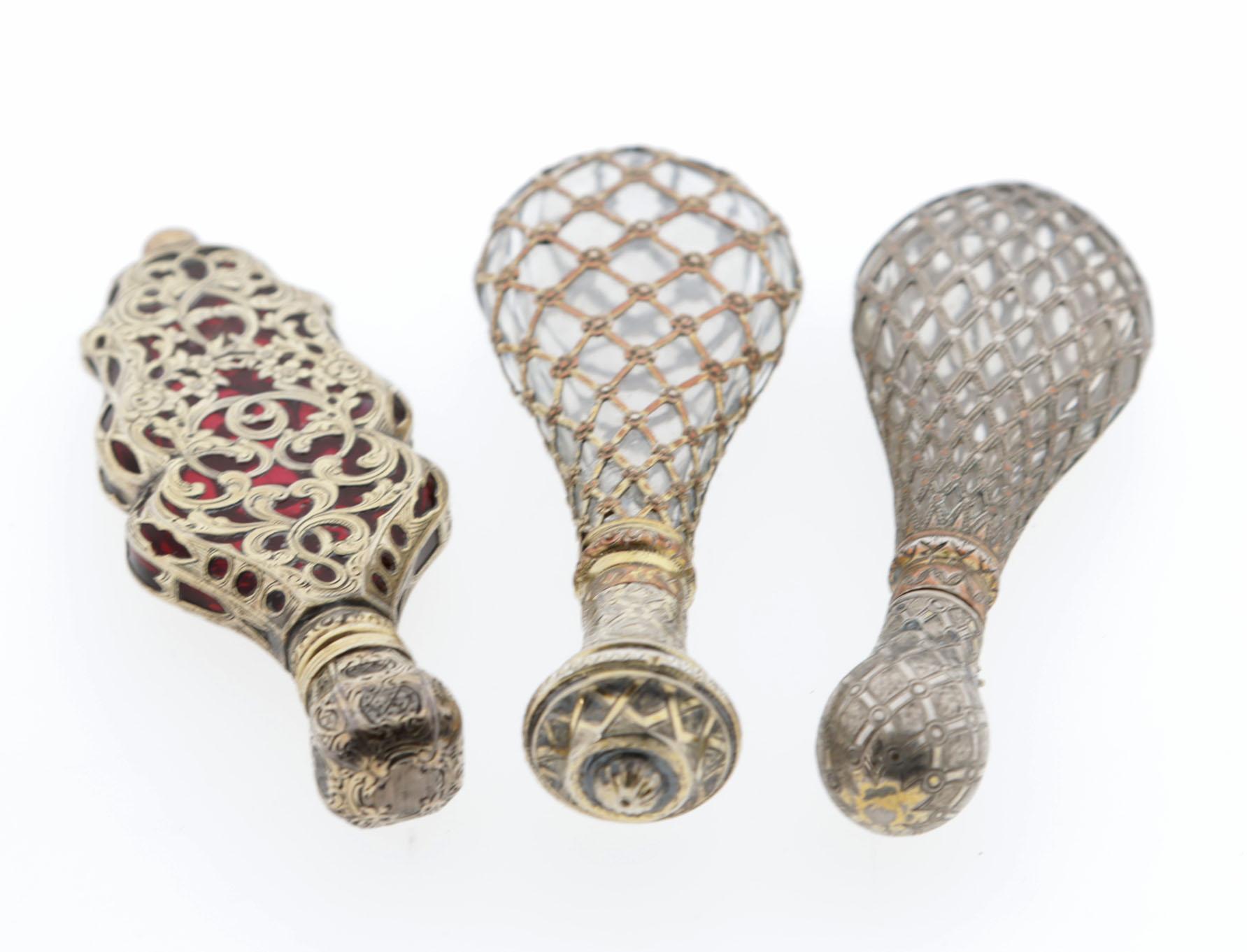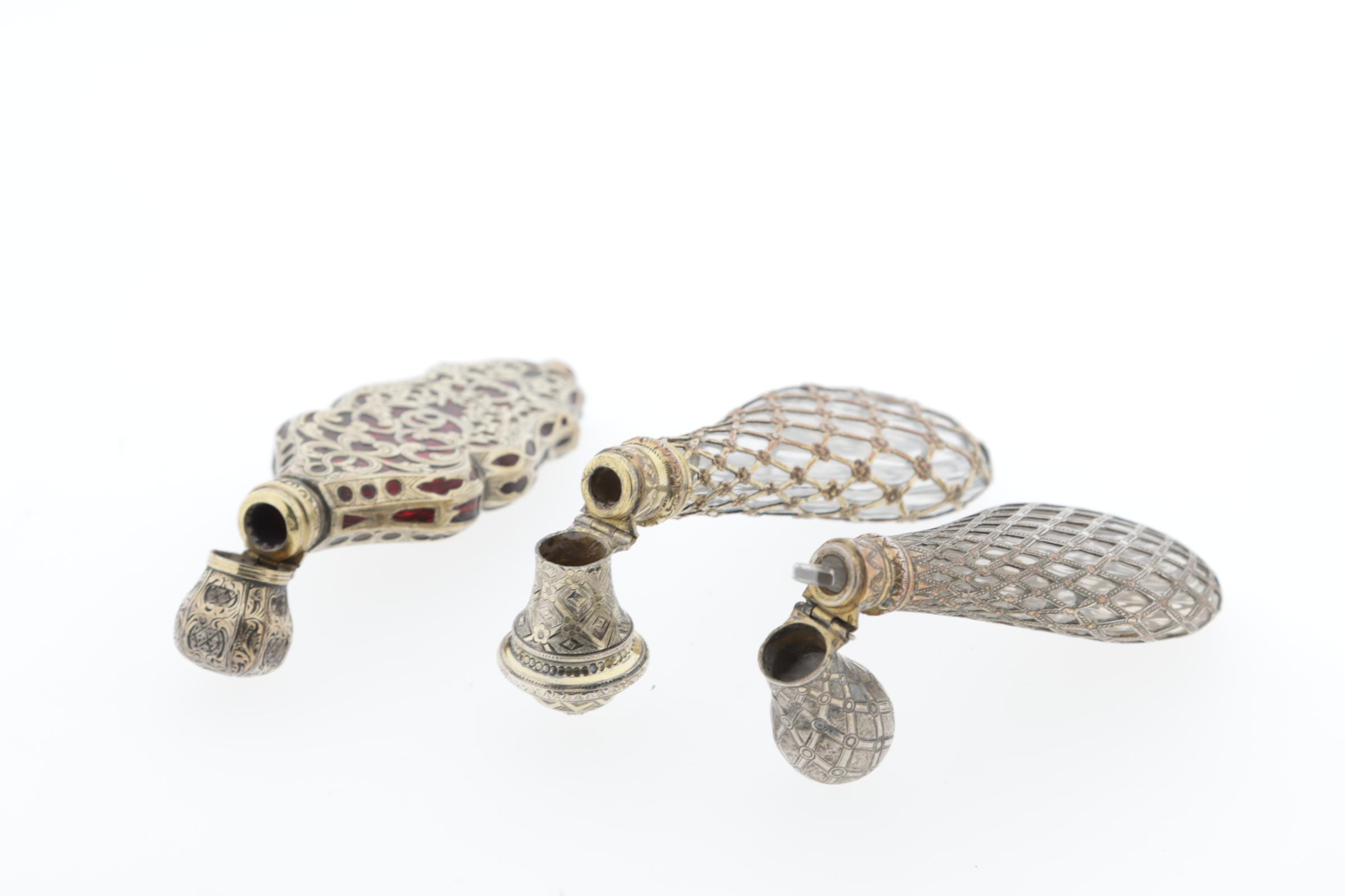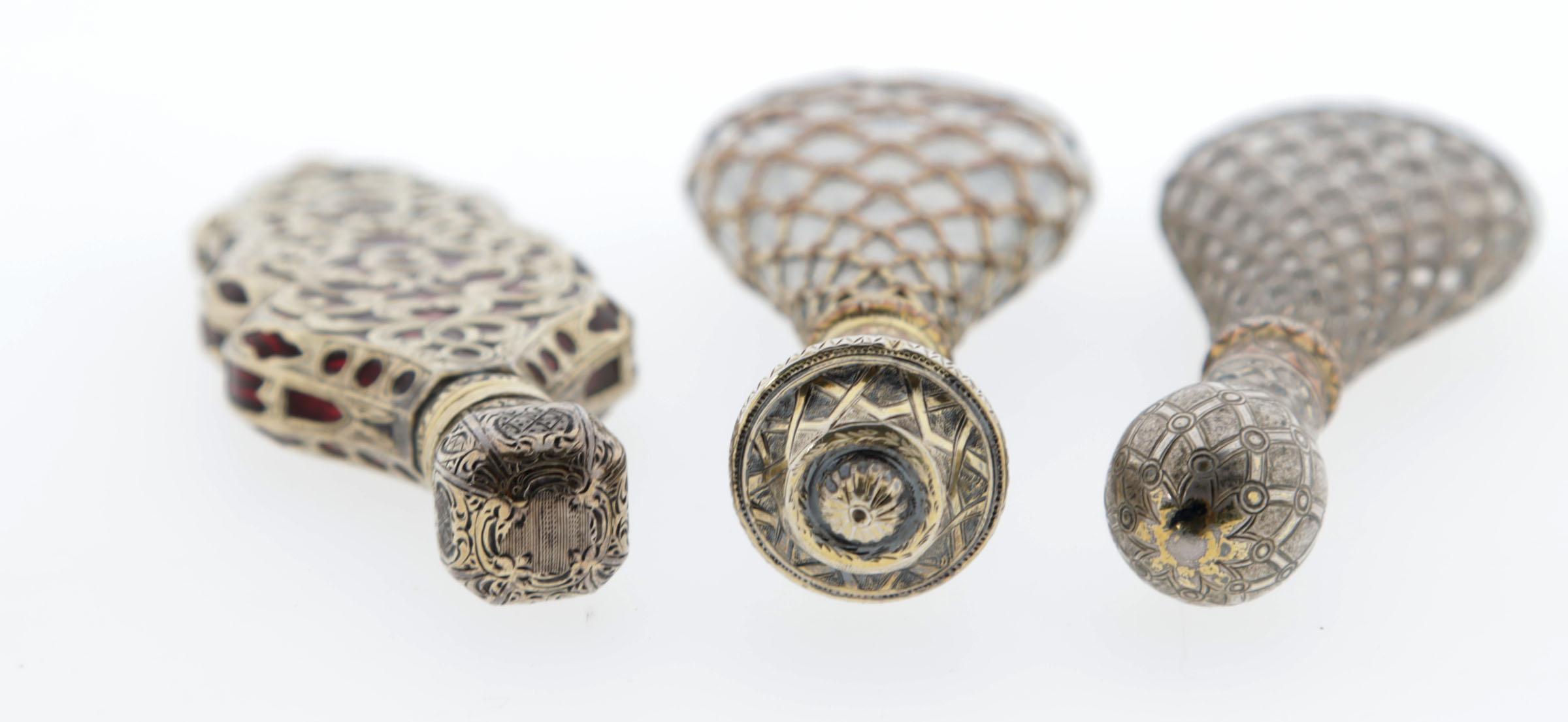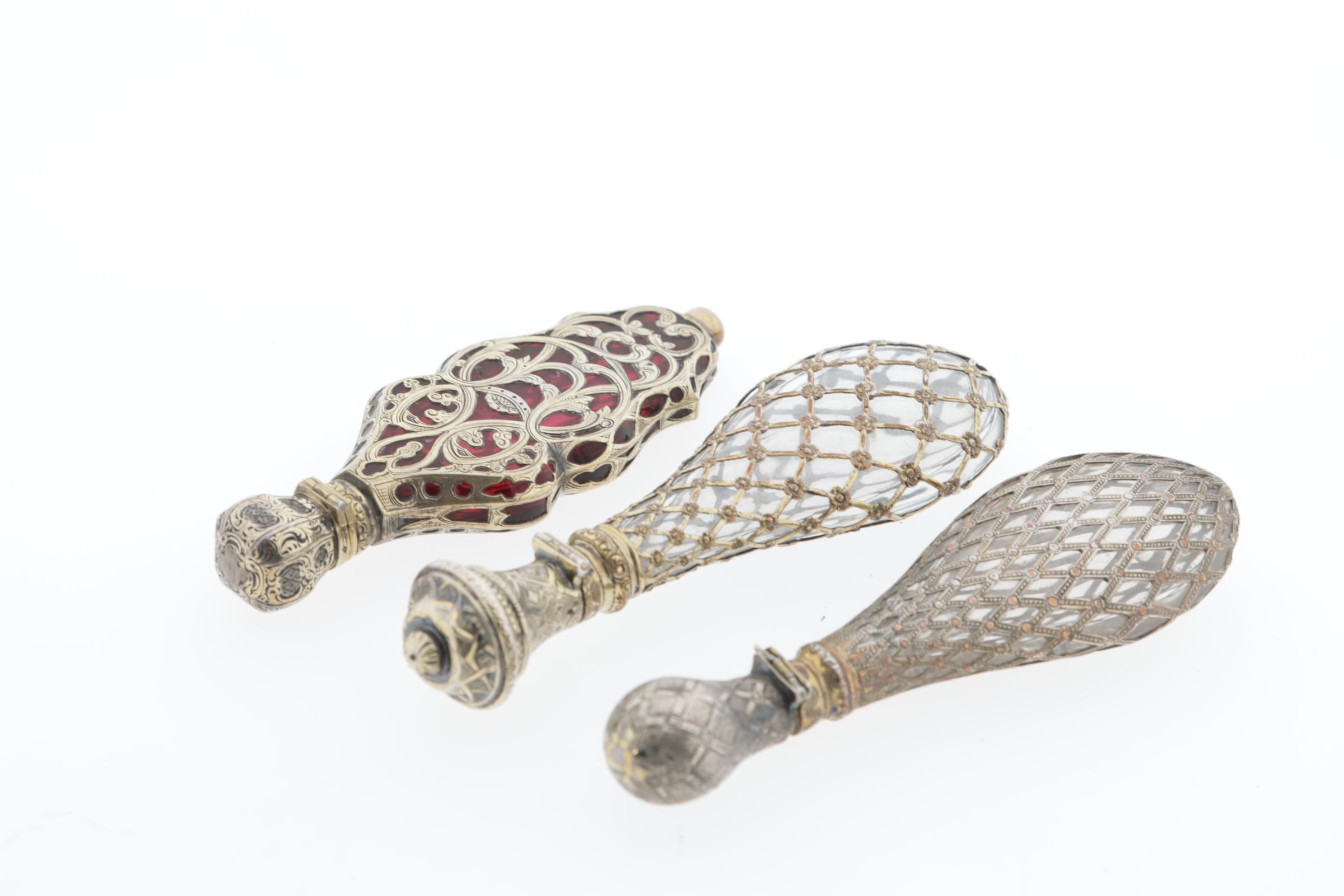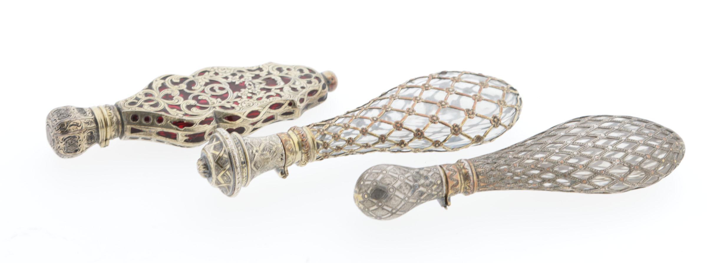 1 druppelvormige fles met 'kooi' van draden, vermeil, Frans, rond 1850, 11 cm hoog, 1 druppelvormige fles, vermeil, Frans, 'kooi'van draden,rond 1850, 11 cm, 1 rood crystallen flacon, volledig gevat in verguld zilveren montuur, aan voorkant met bloemmotieven, opengewerkte ranken, scharnierende dop, bewerkt, 9,7x3,3 cm, Frans (zwijnskop), rond 1840