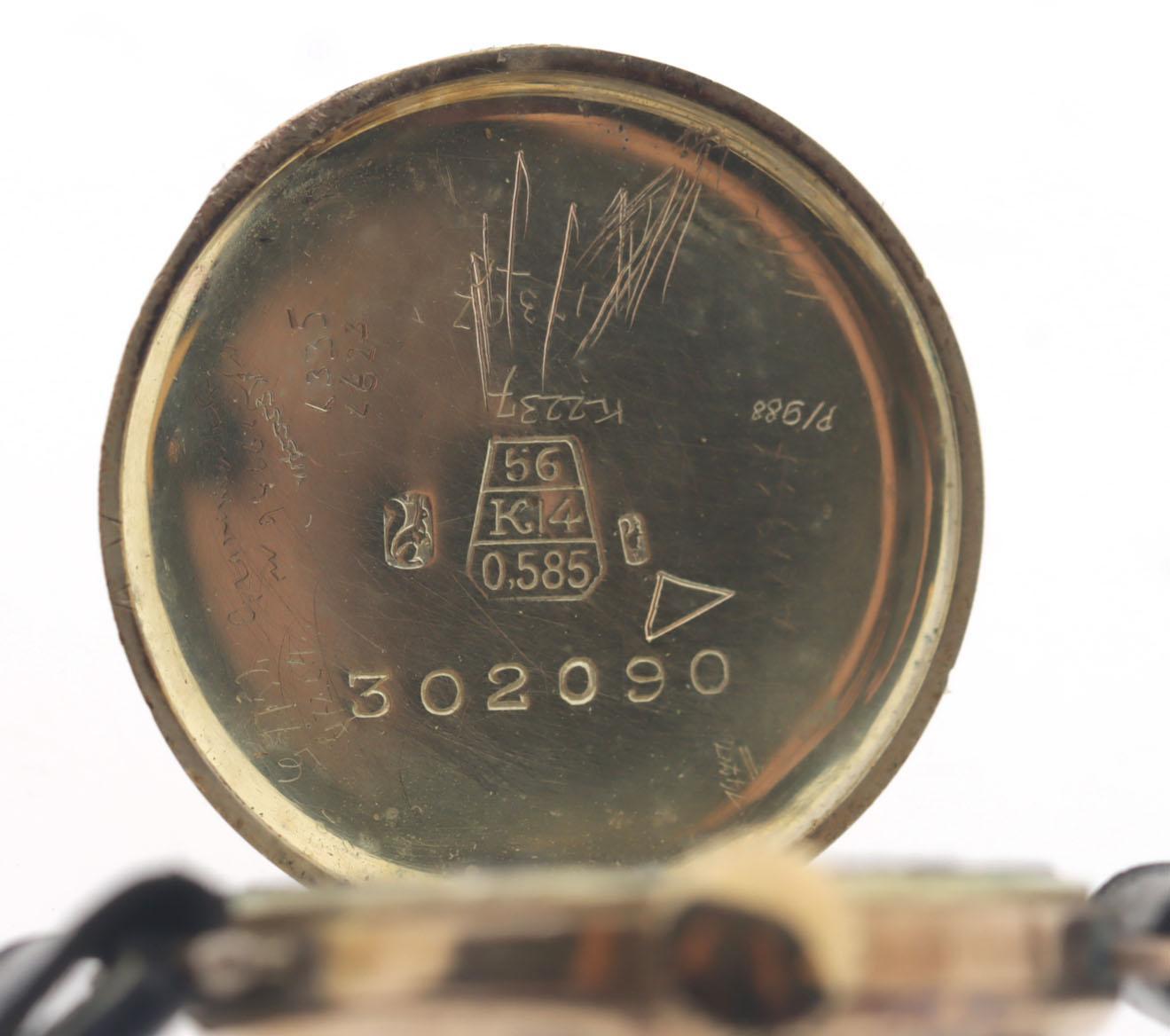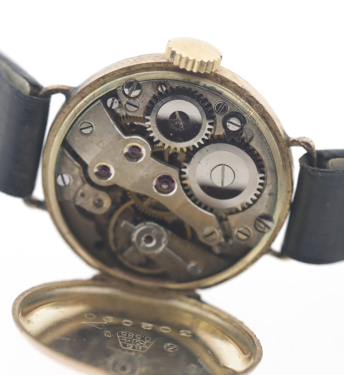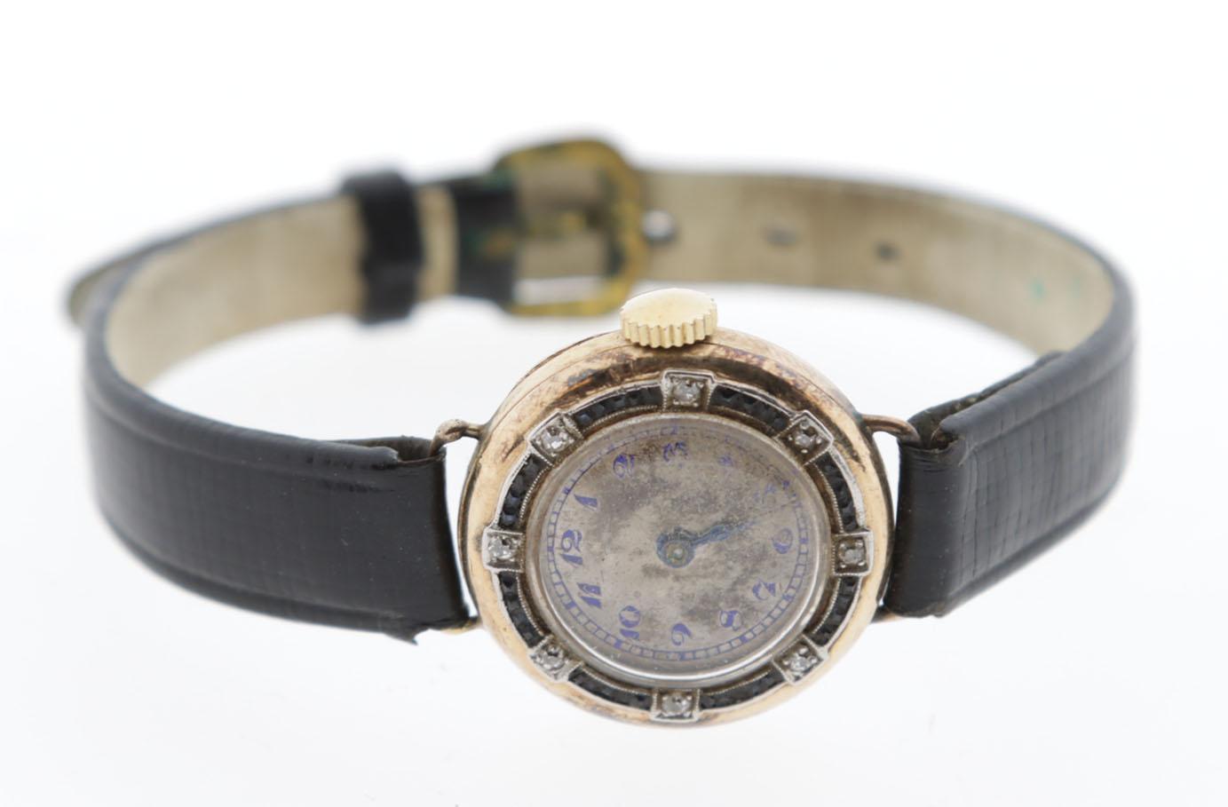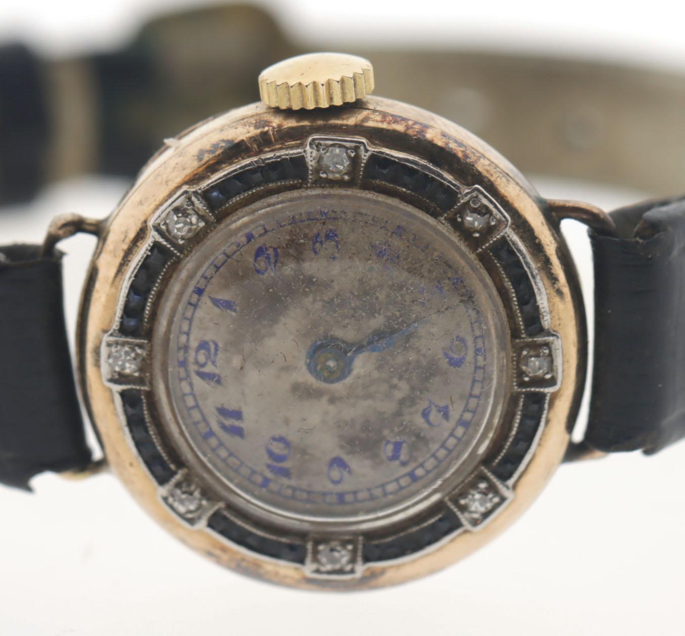 Art Deco damespolshorloge in 14 kt. gouden kast bezet met saffier en briljant geslepen diamant