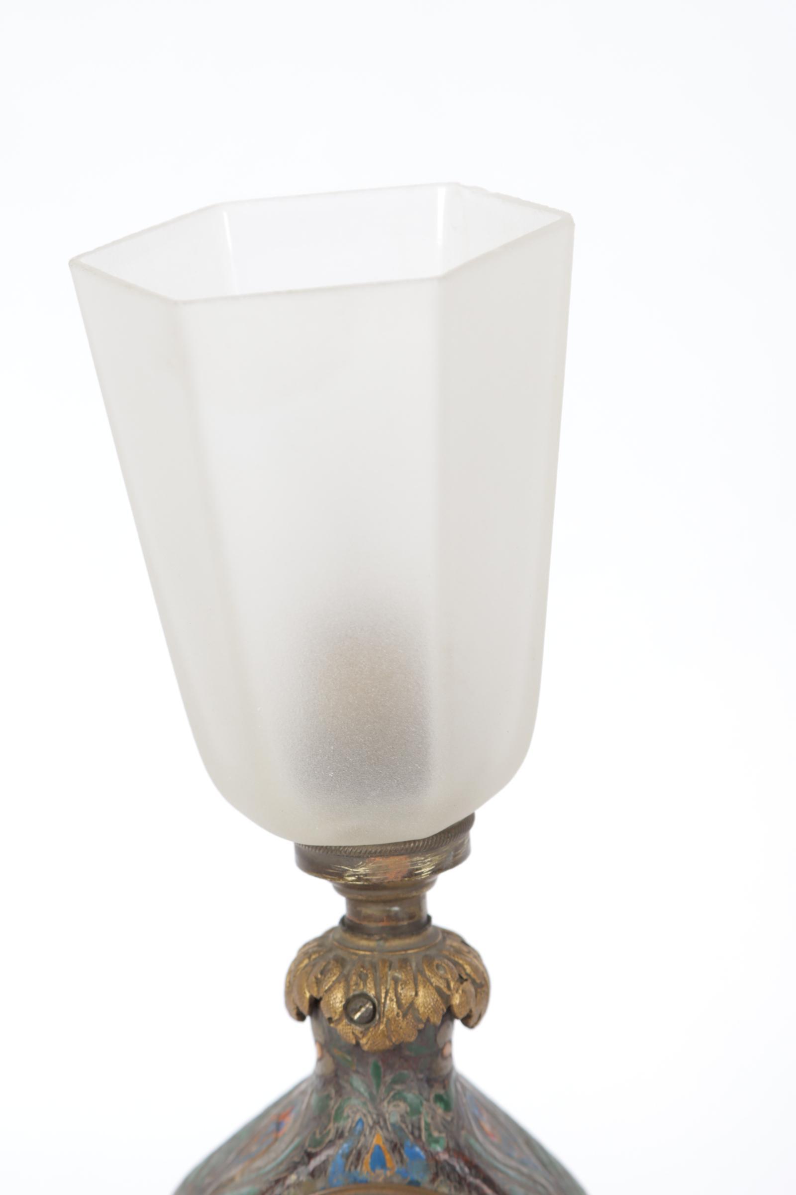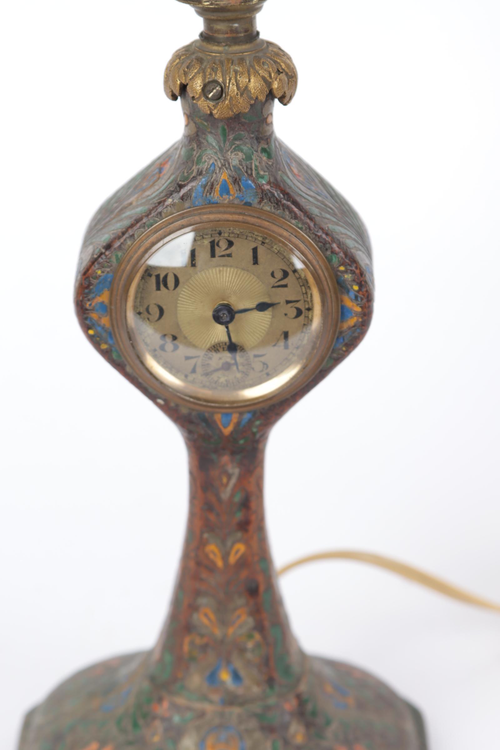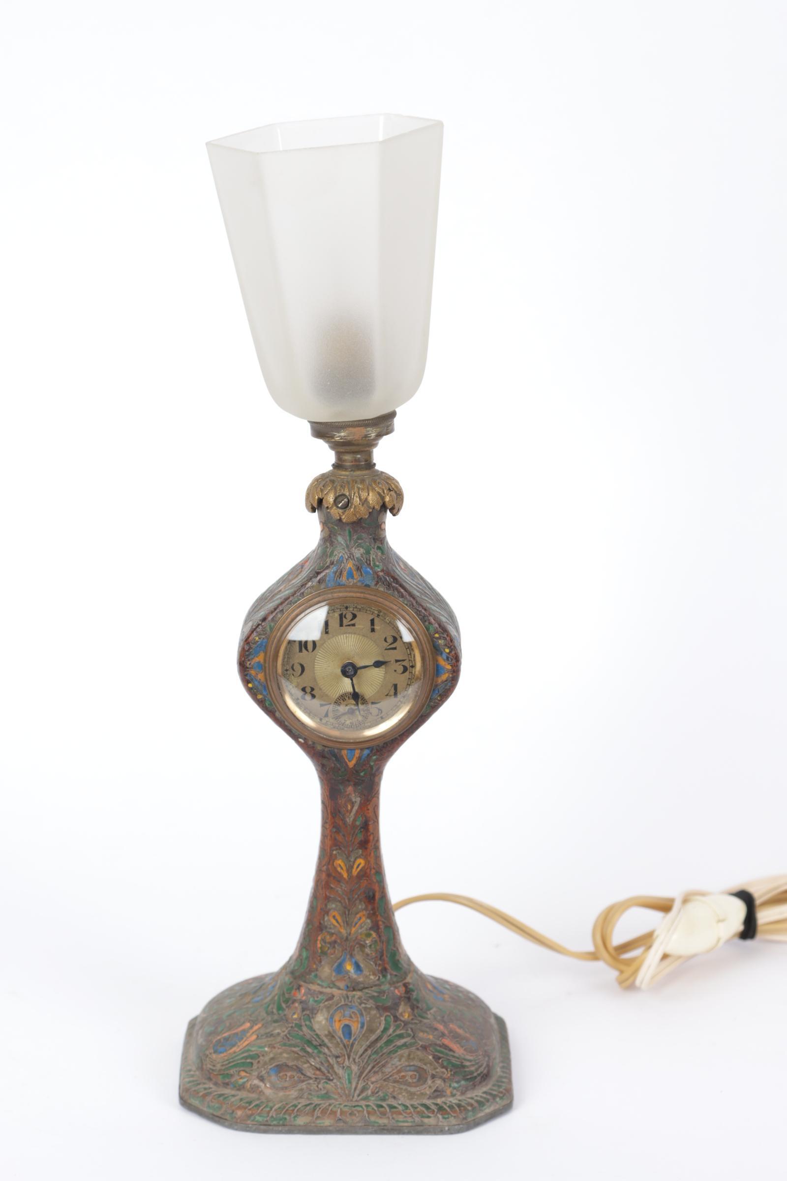 Antiek tafellampje met uurwerkje en satiné glaskapje