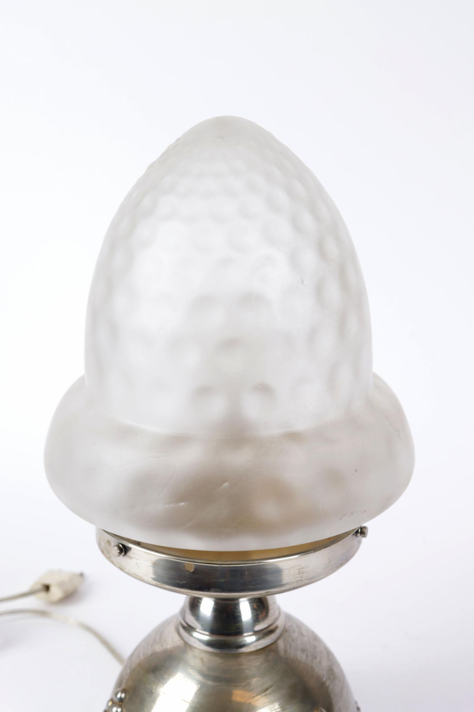 Verzilverd bronzen Art Deco tafellamp met gesatineerde glaskap h.43 cm.