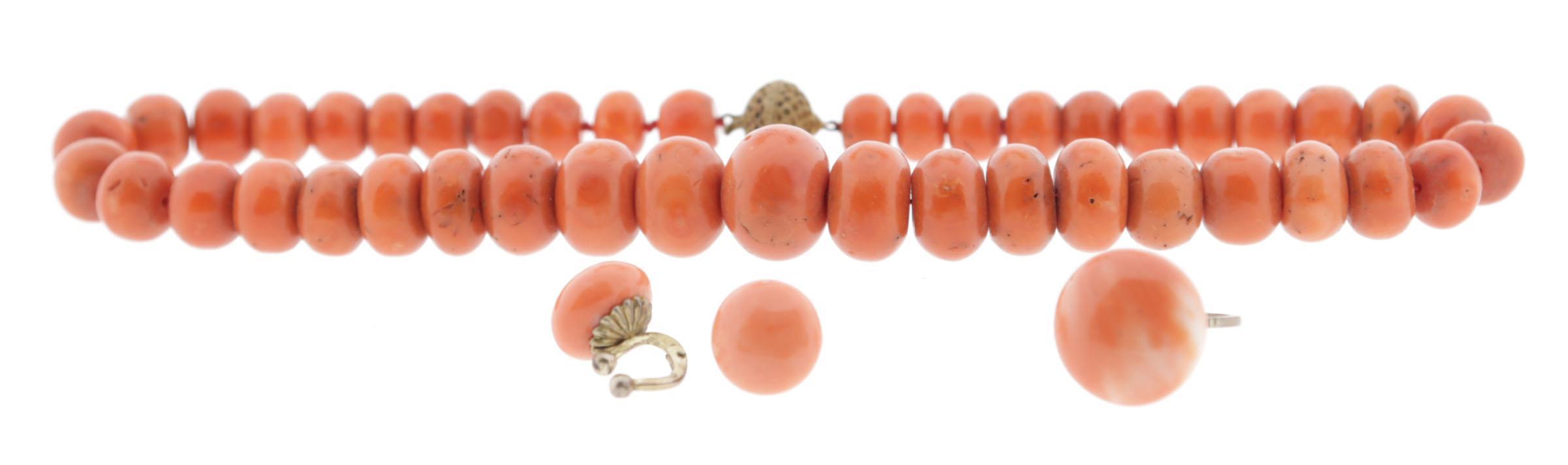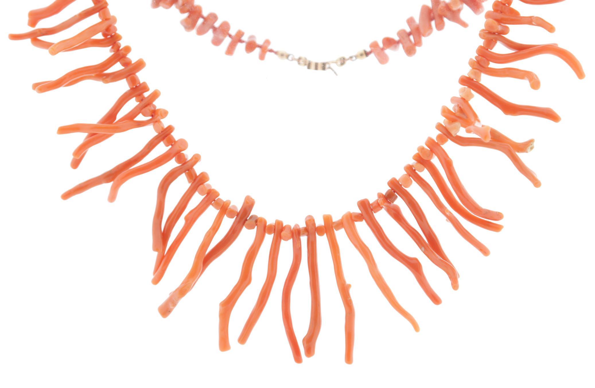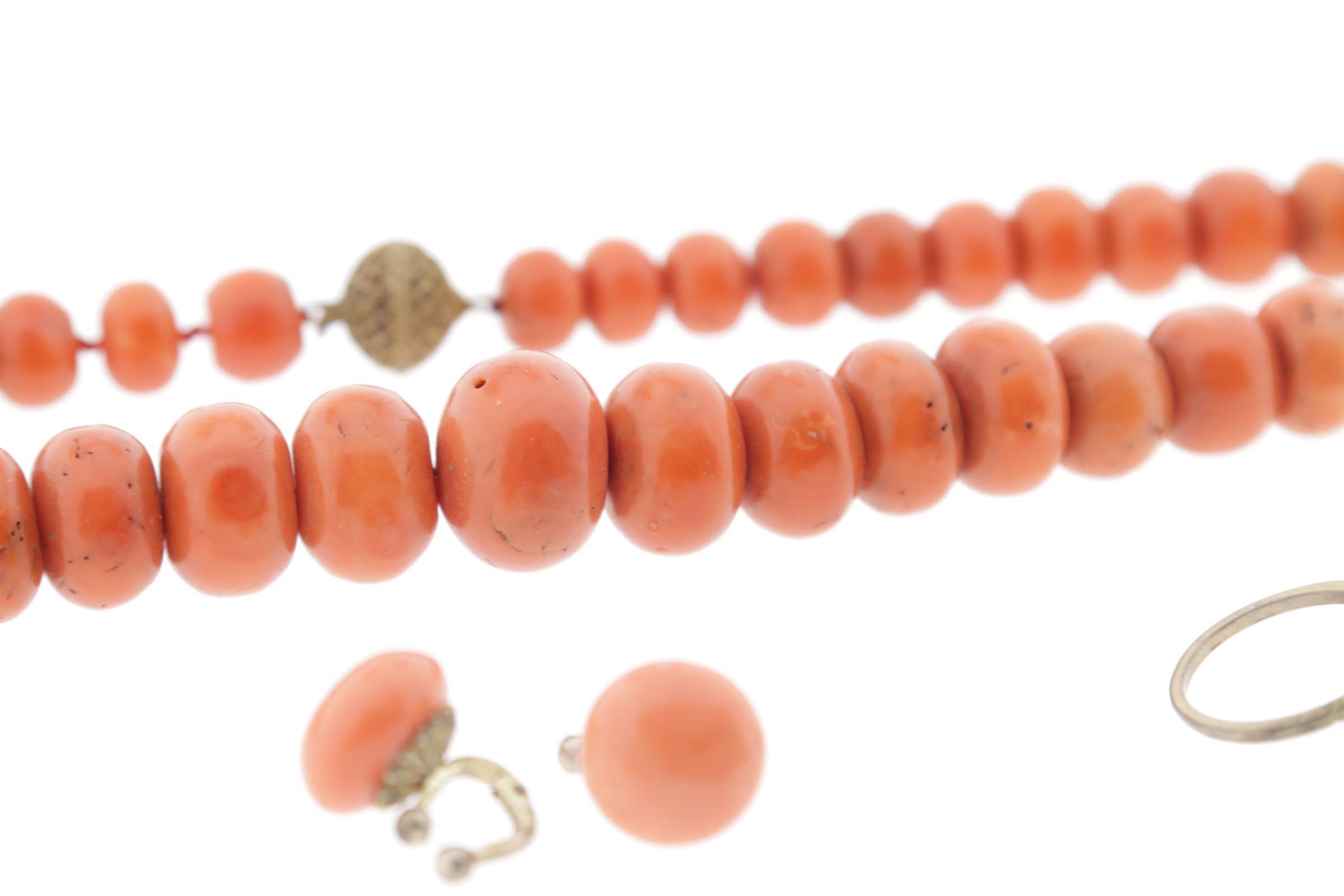 Koopje van een bloedkoralen collier met zilveren slot, bloedkoralen staafjescollier met gouden slot, 2 oorbellen en een ring