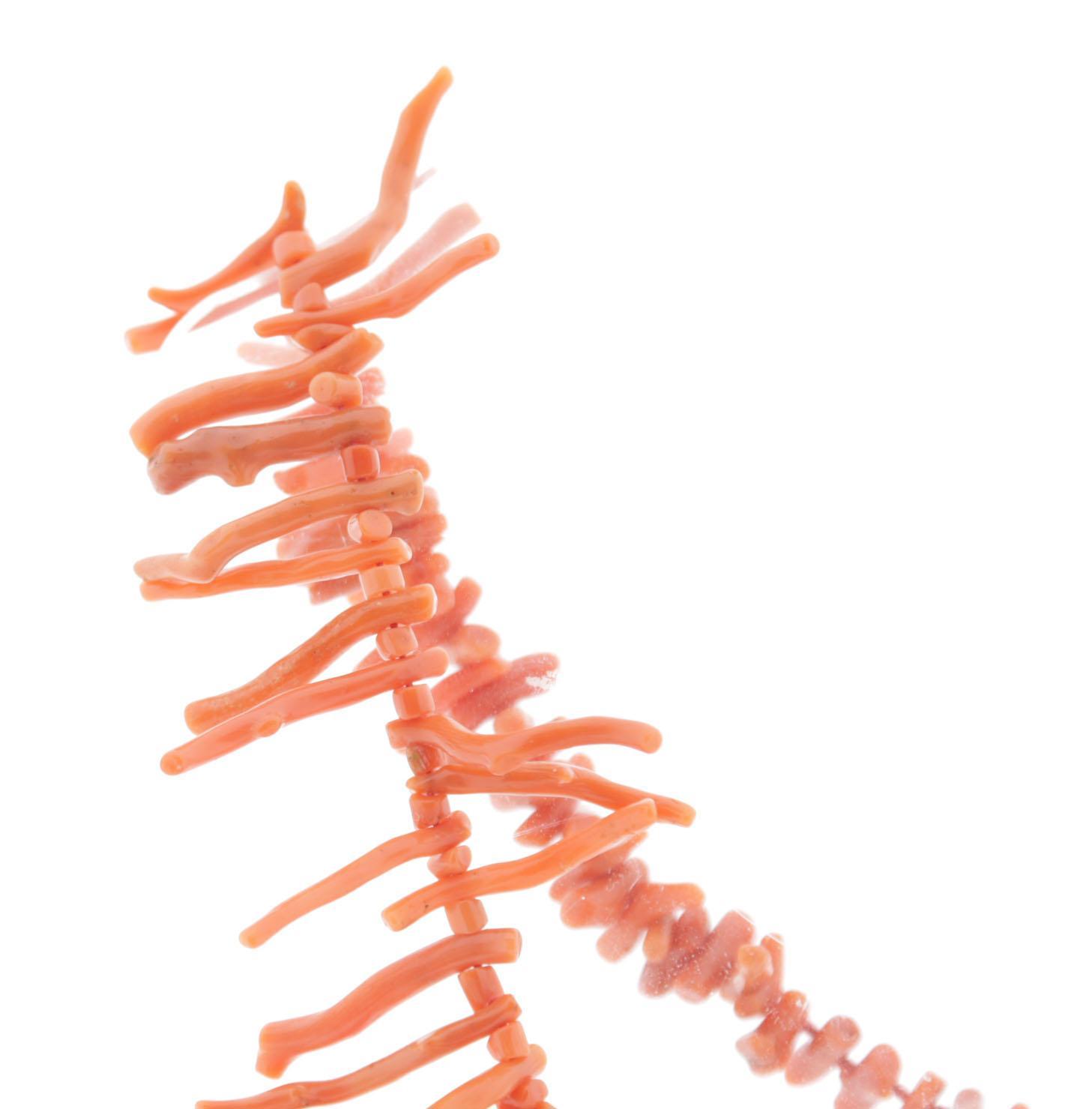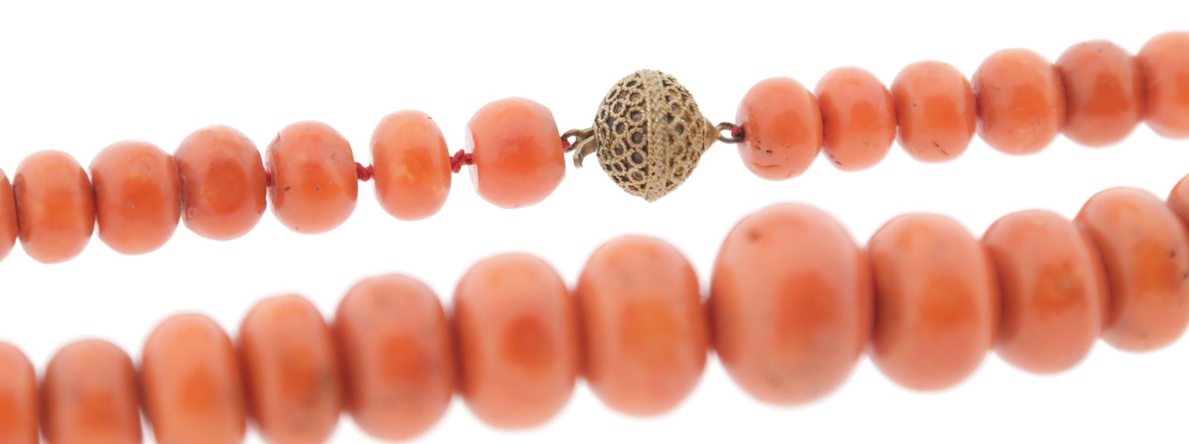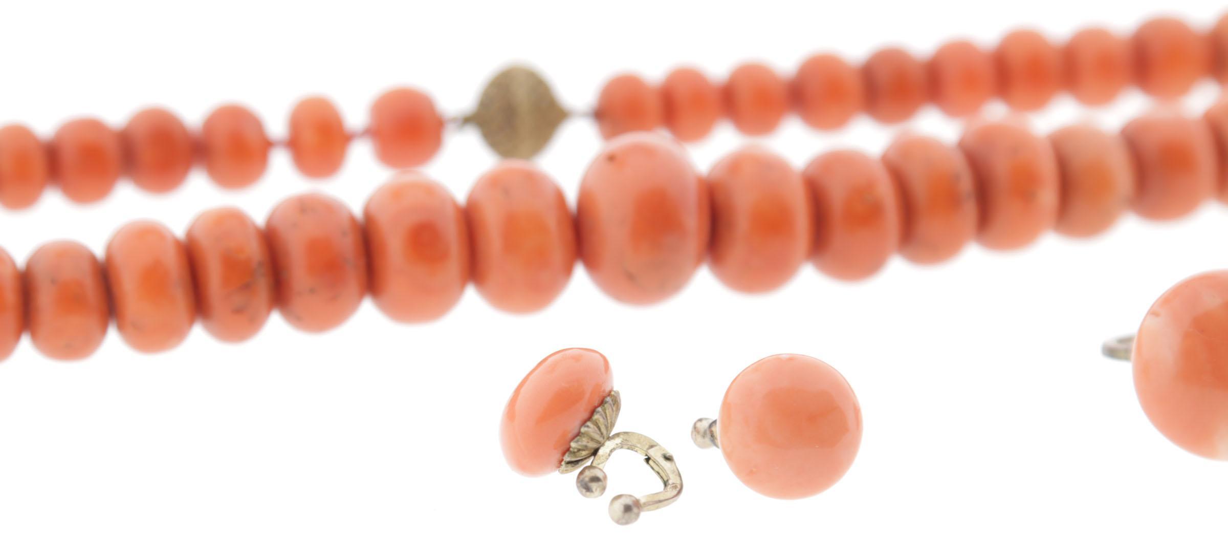 Koopje van een bloedkoralen collier met zilveren slot, bloedkoralen staafjescollier met gouden slot, 2 oorbellen en een ring