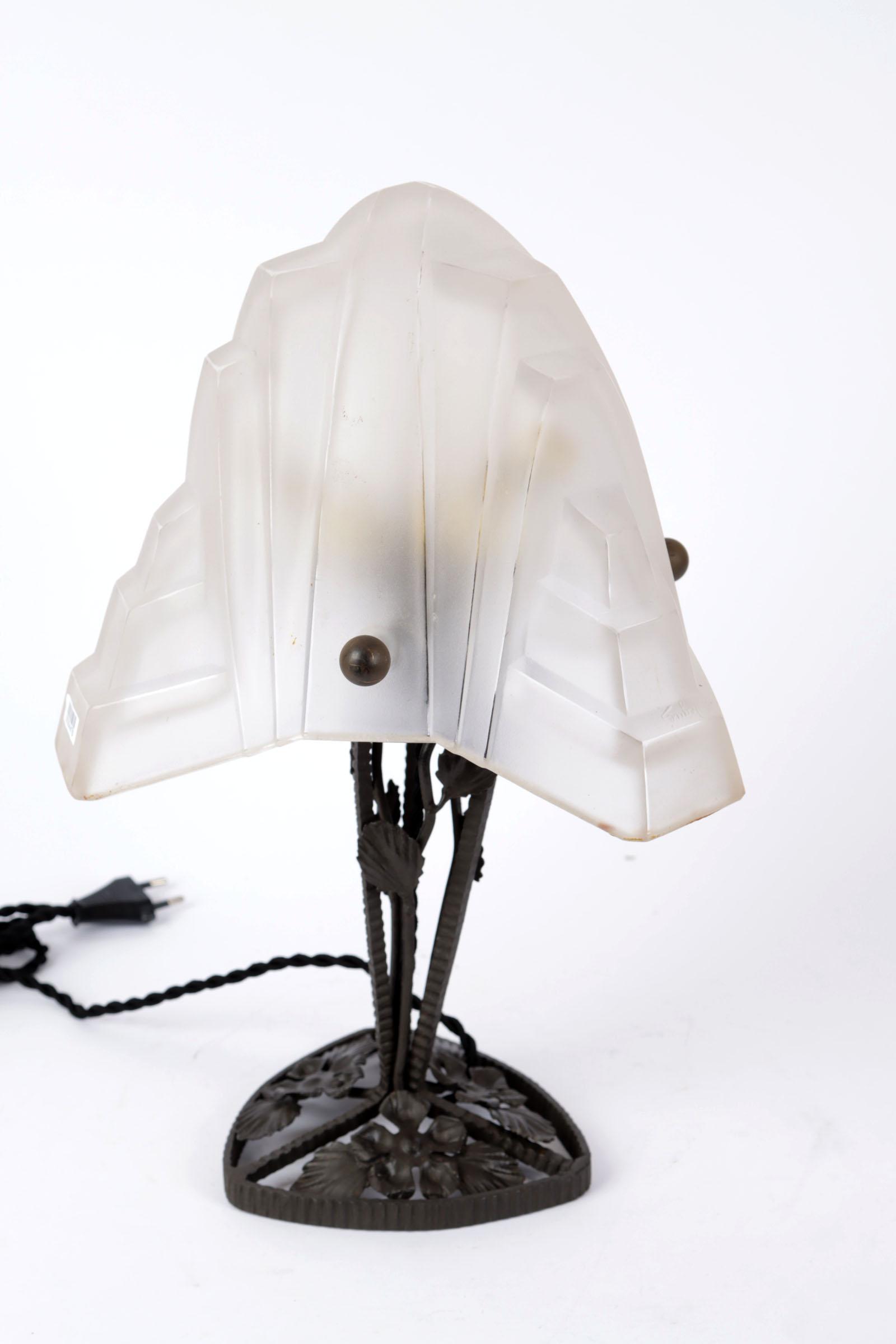 Dequé gesigneerde Art Deco tafellamp op smeedijzer voet met gesatineerde glaskap in geometrisch reliëfdecor h.44 cm.