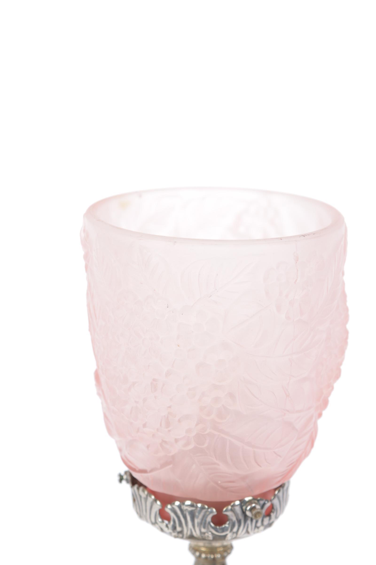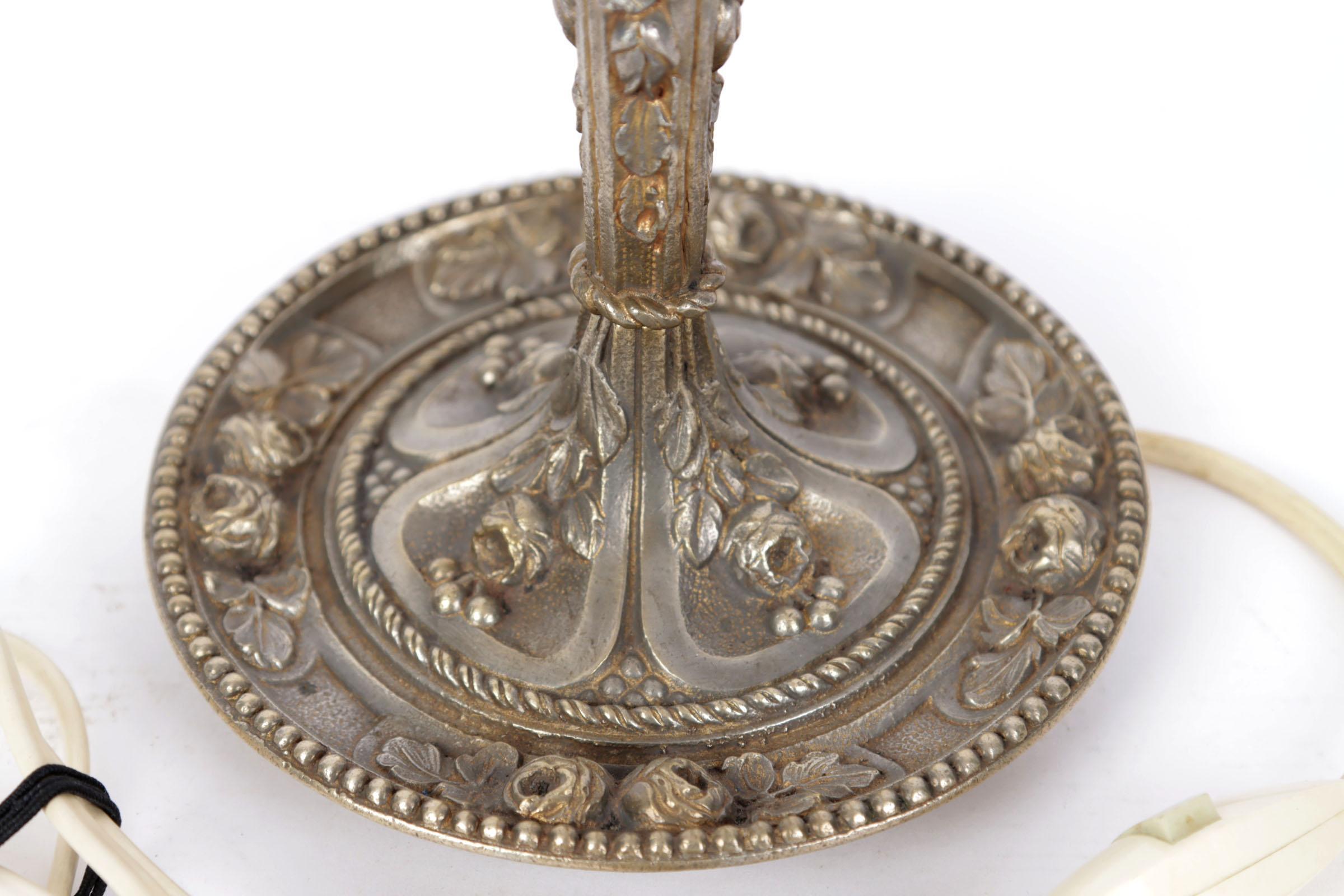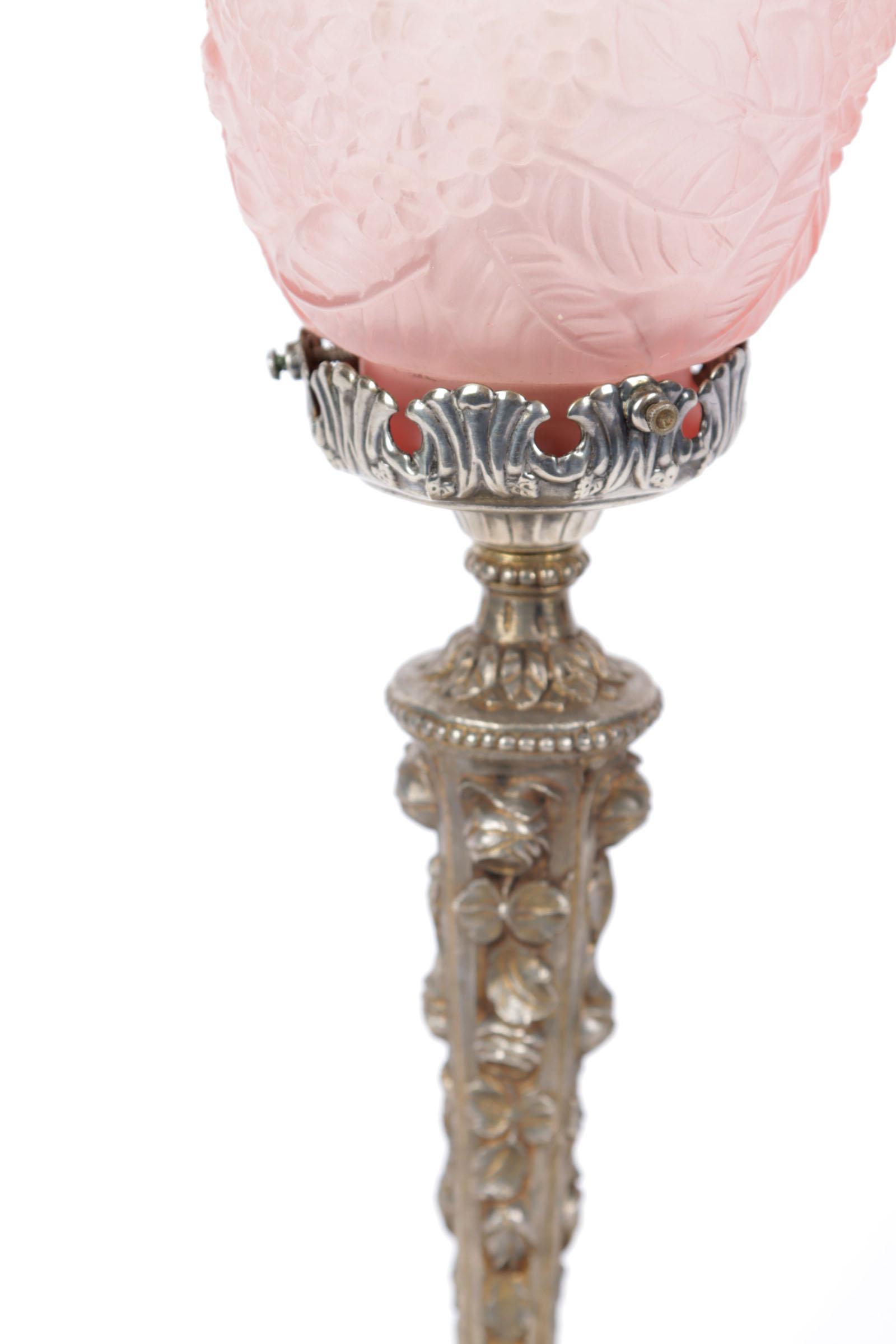Tafellampje op rijk bewerkt verzilverd brons voetje met rosé satiné glaskapje in floraal hoogreliëf
