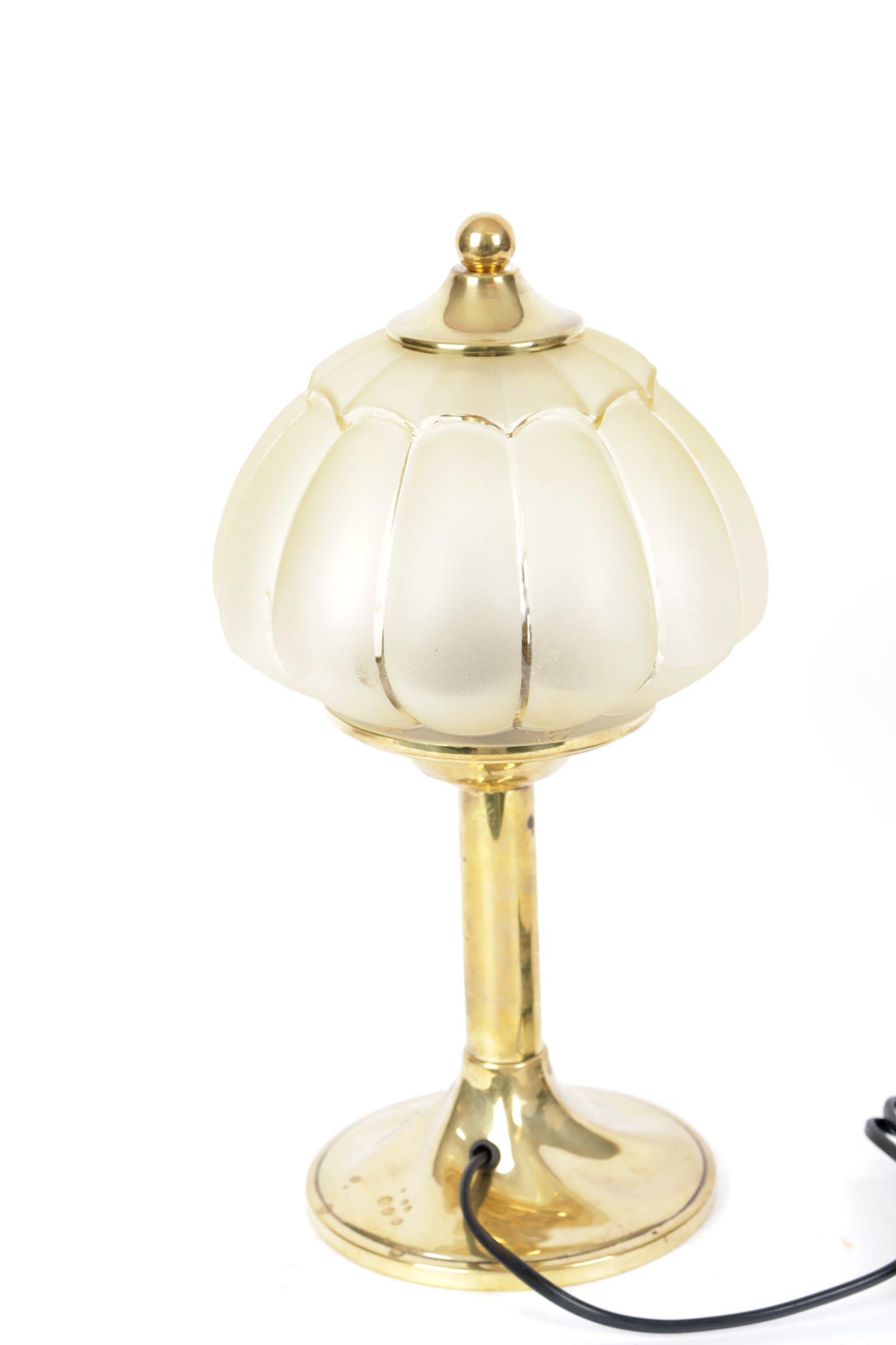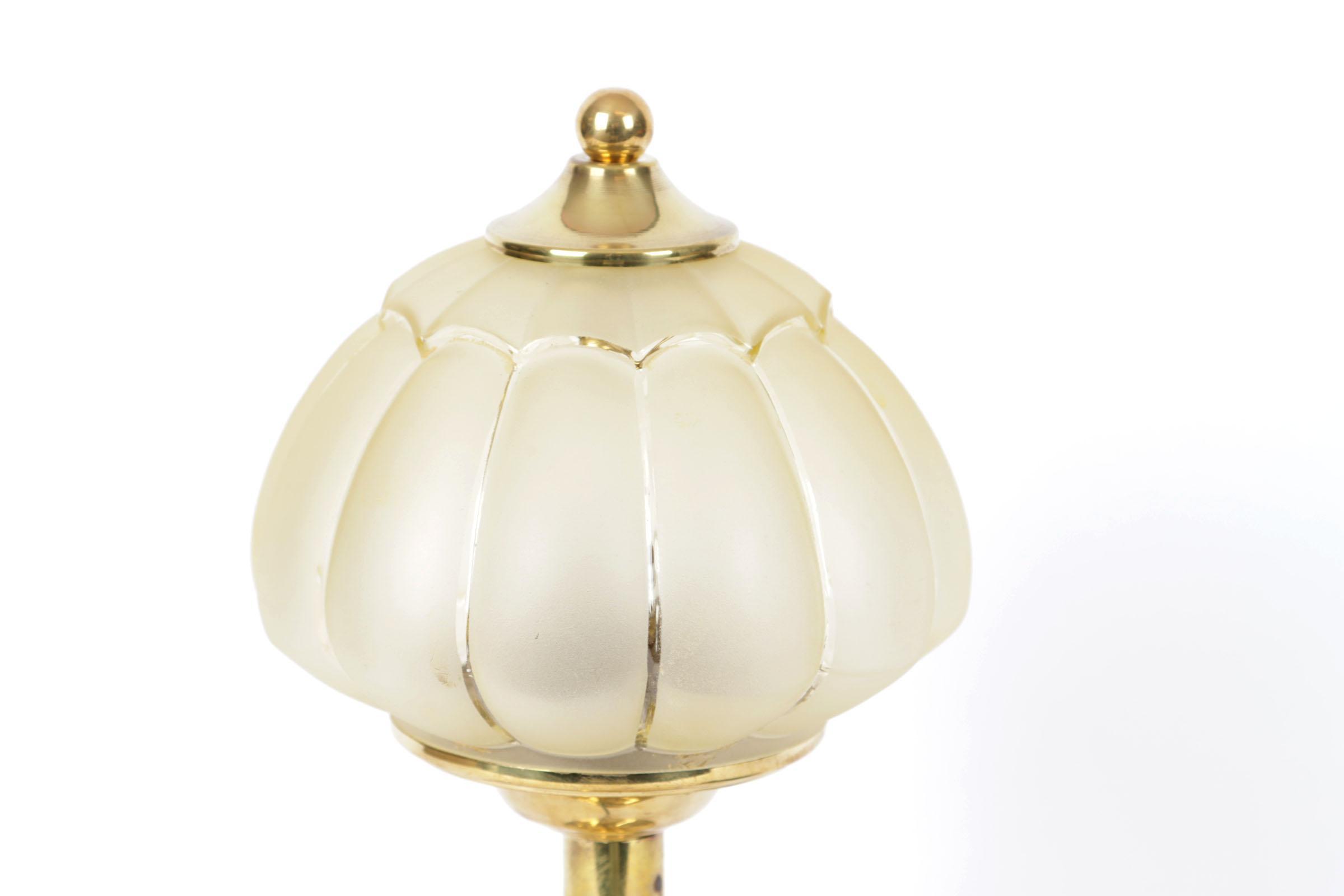 Art Deco tafellampje op koper voetje met geel glaskapje
