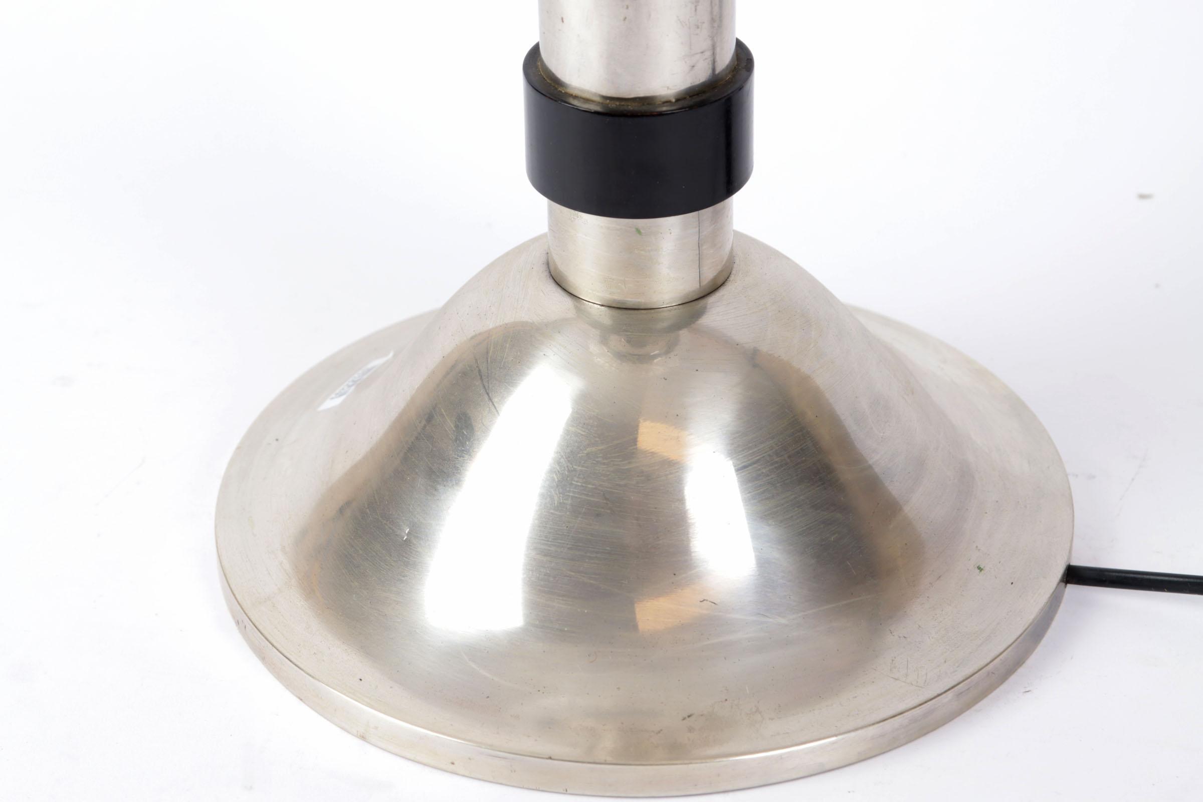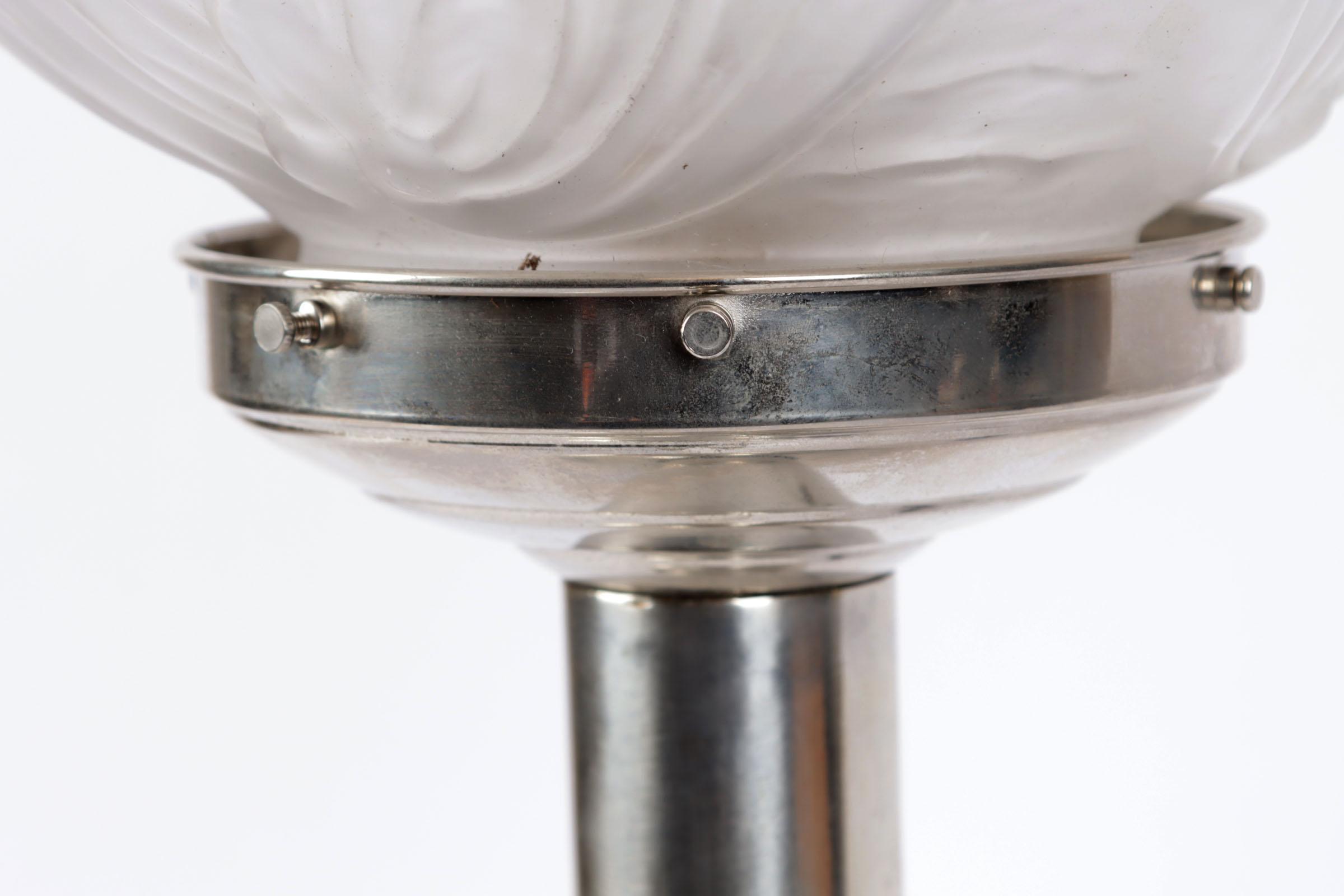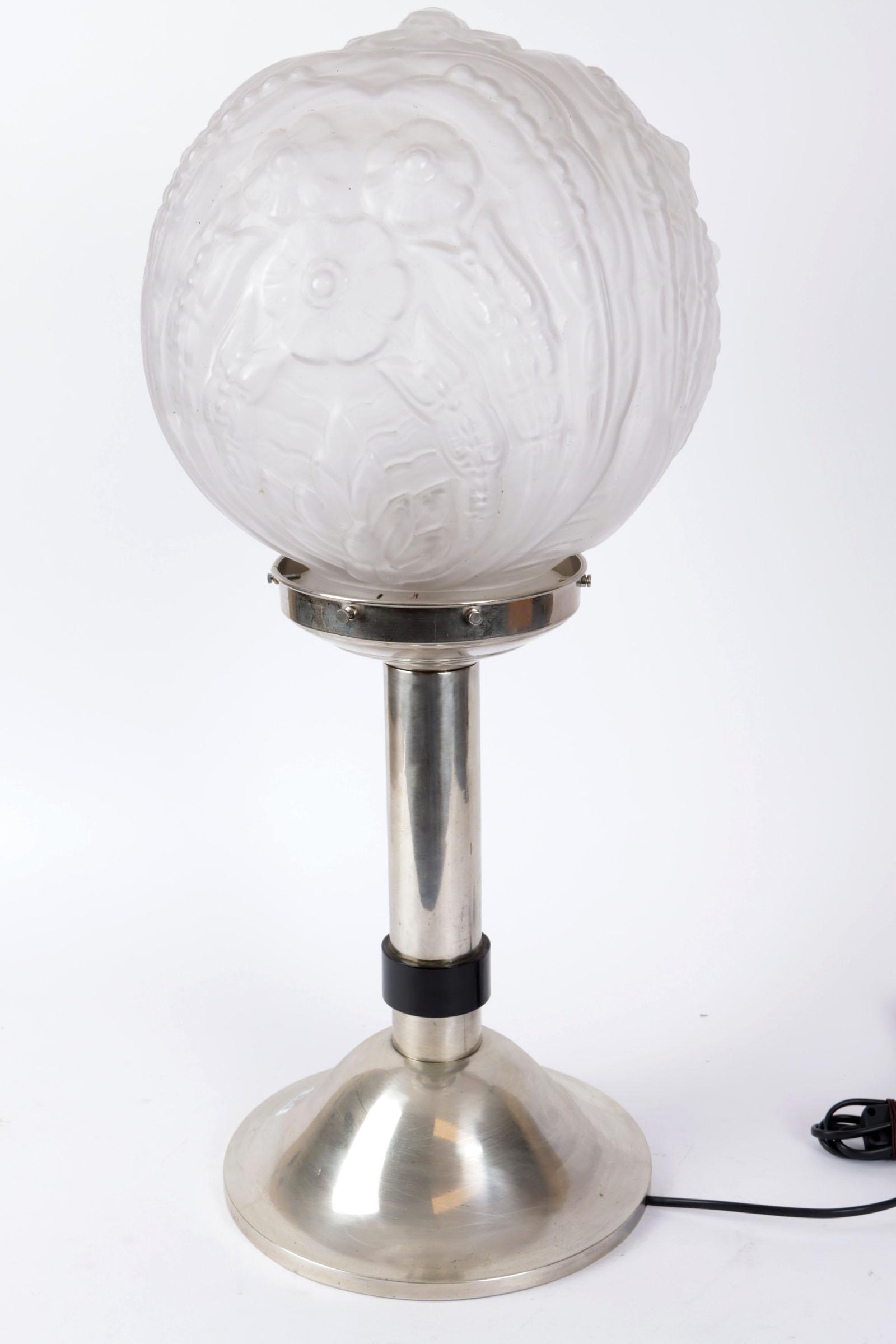 Art Deco tafellamp op verzilverde voet met gesatineerde glasbol in reliëfdecor