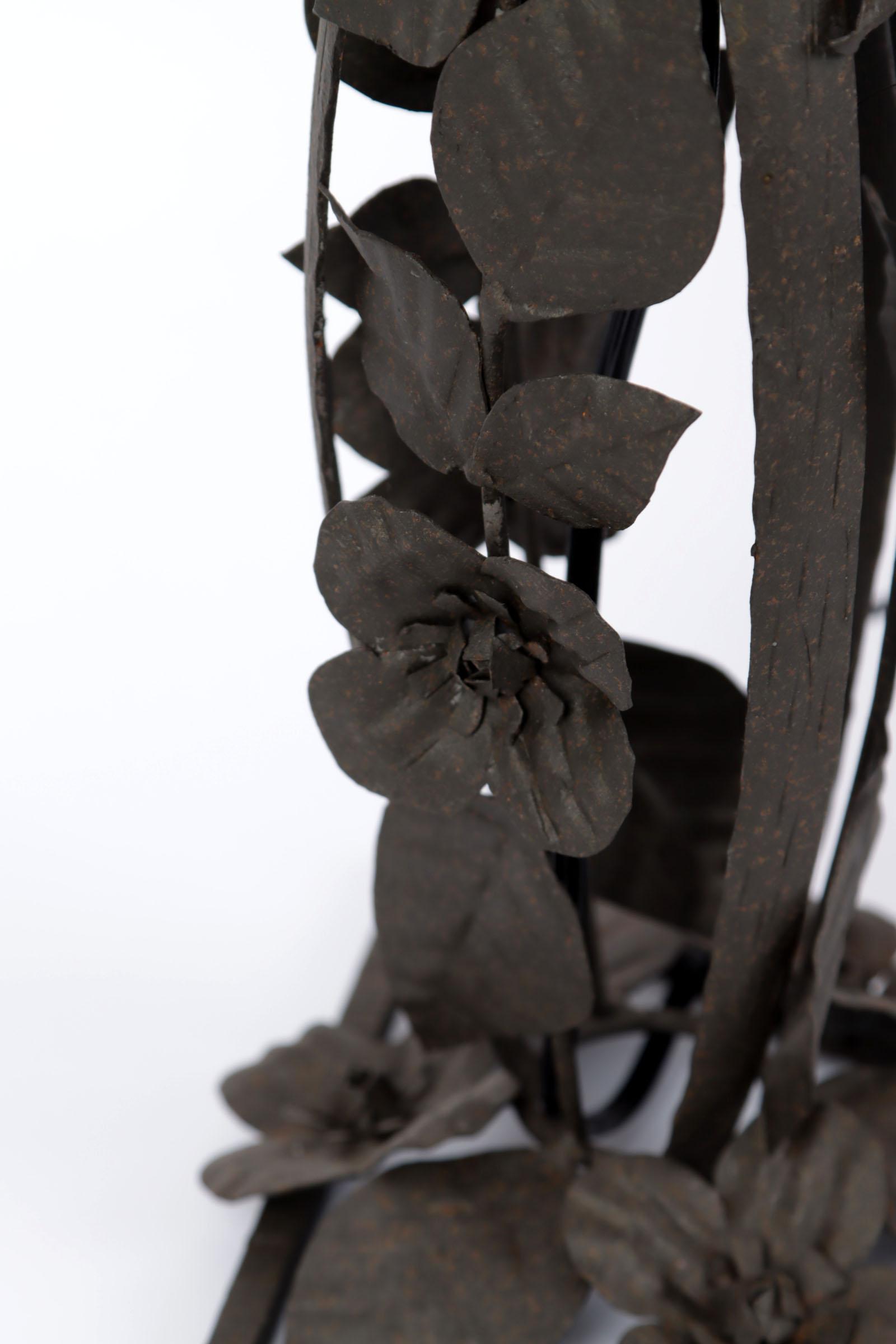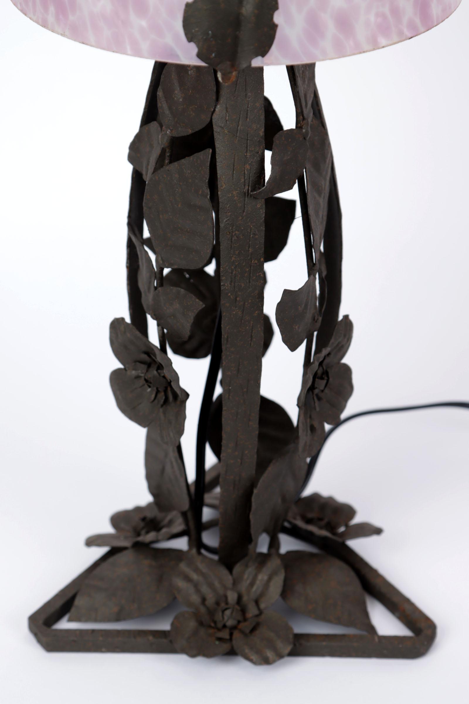Art deco tafellamp op rijk bewerkt smeedijzer voet met pâte de verre glaskap h.46.5 cm.