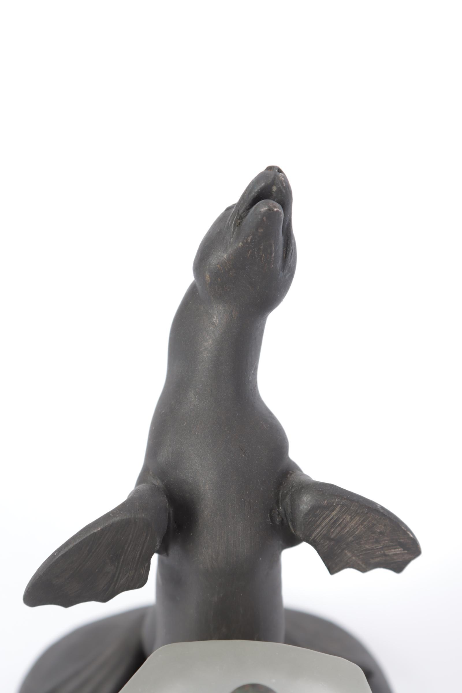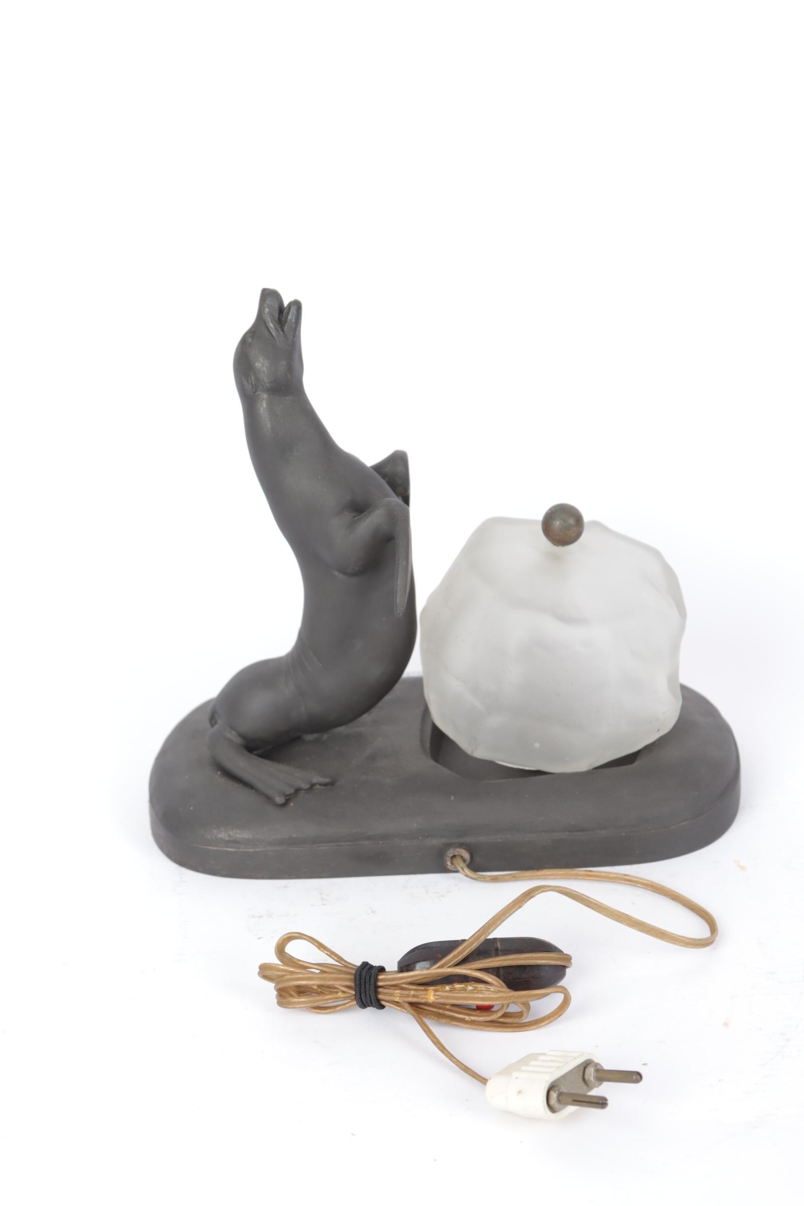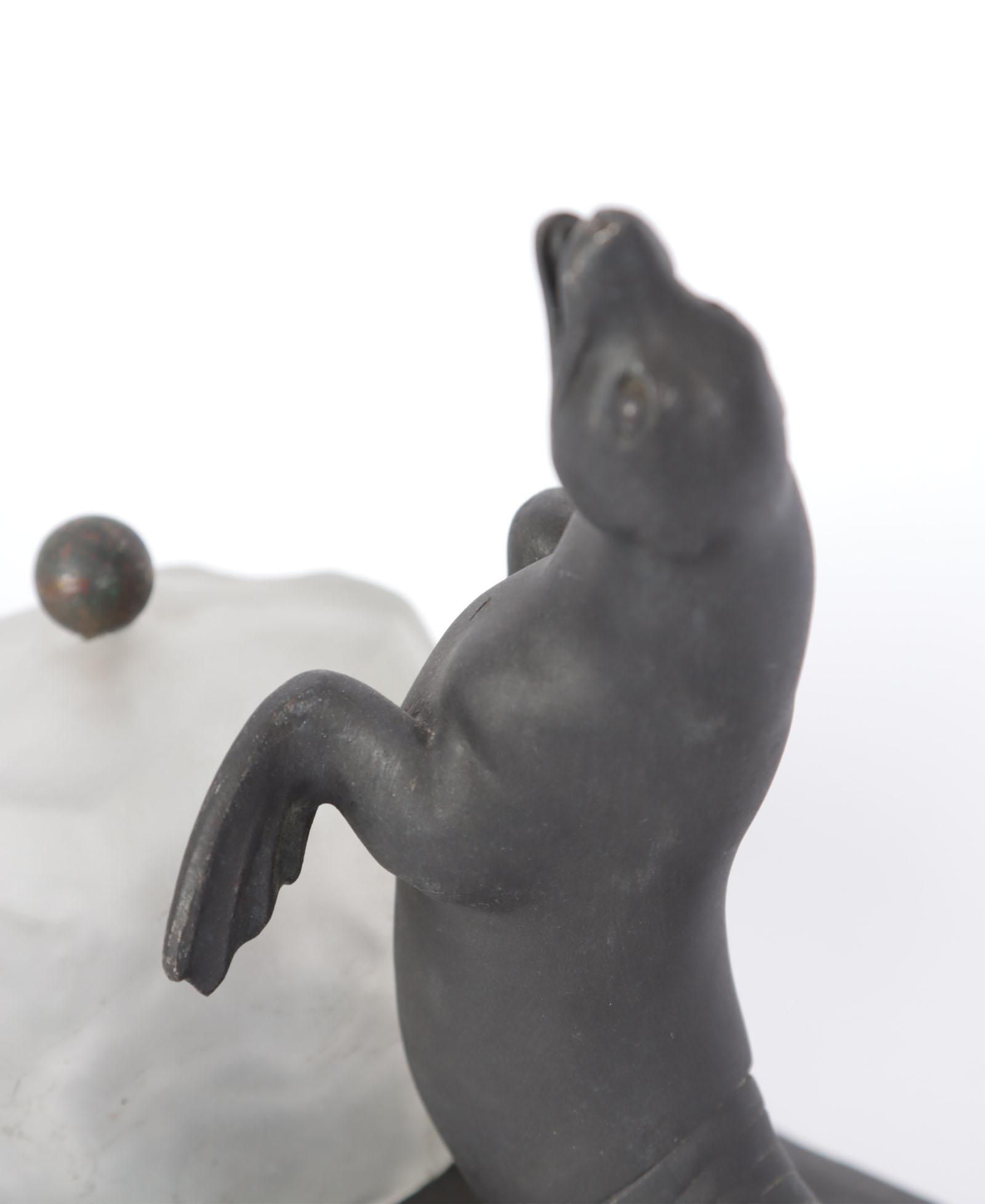 Art Deco tafellampje met voorstelling van een zeeleeuw en glaskapje in de vorm van een ijsrots