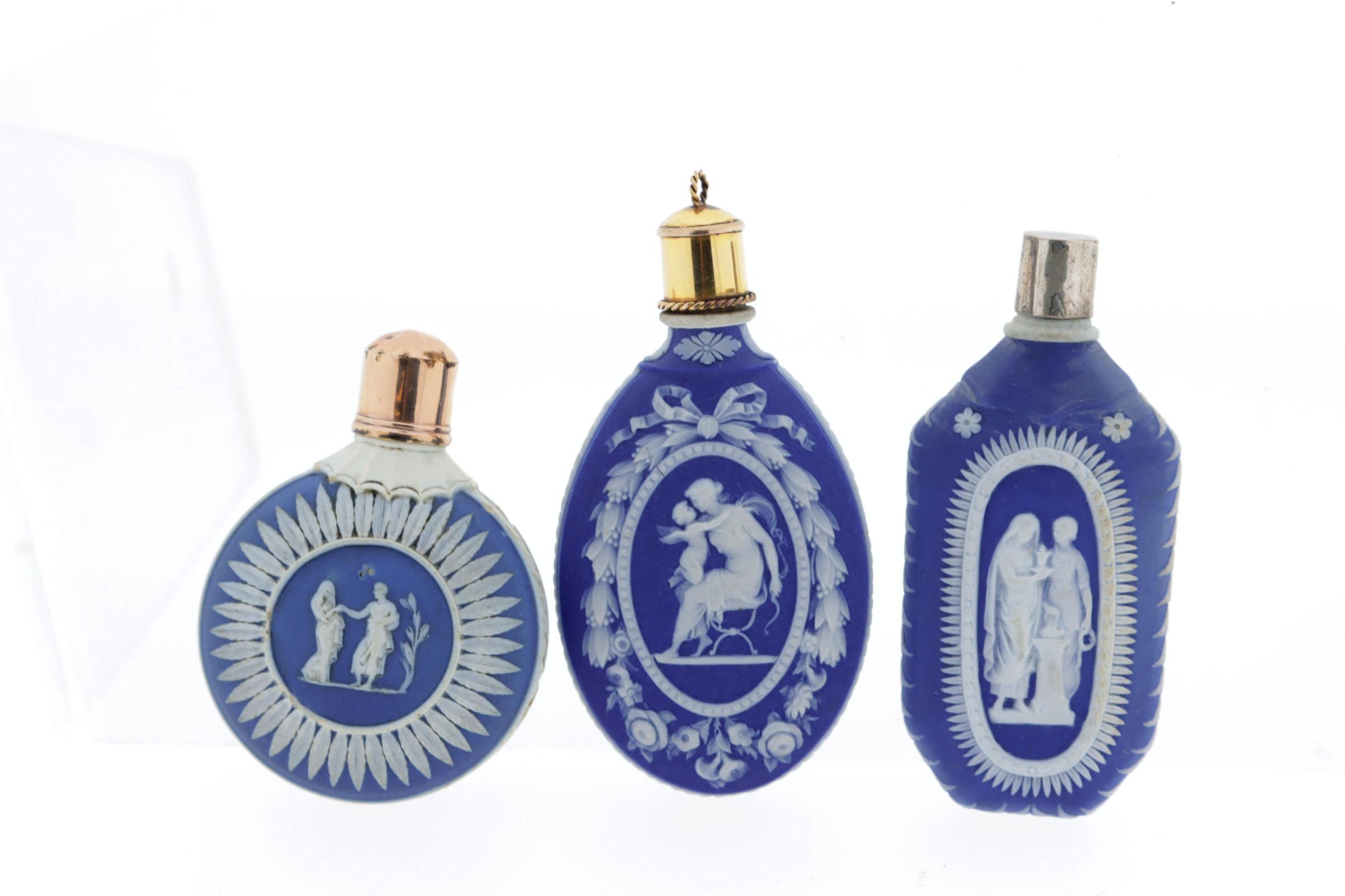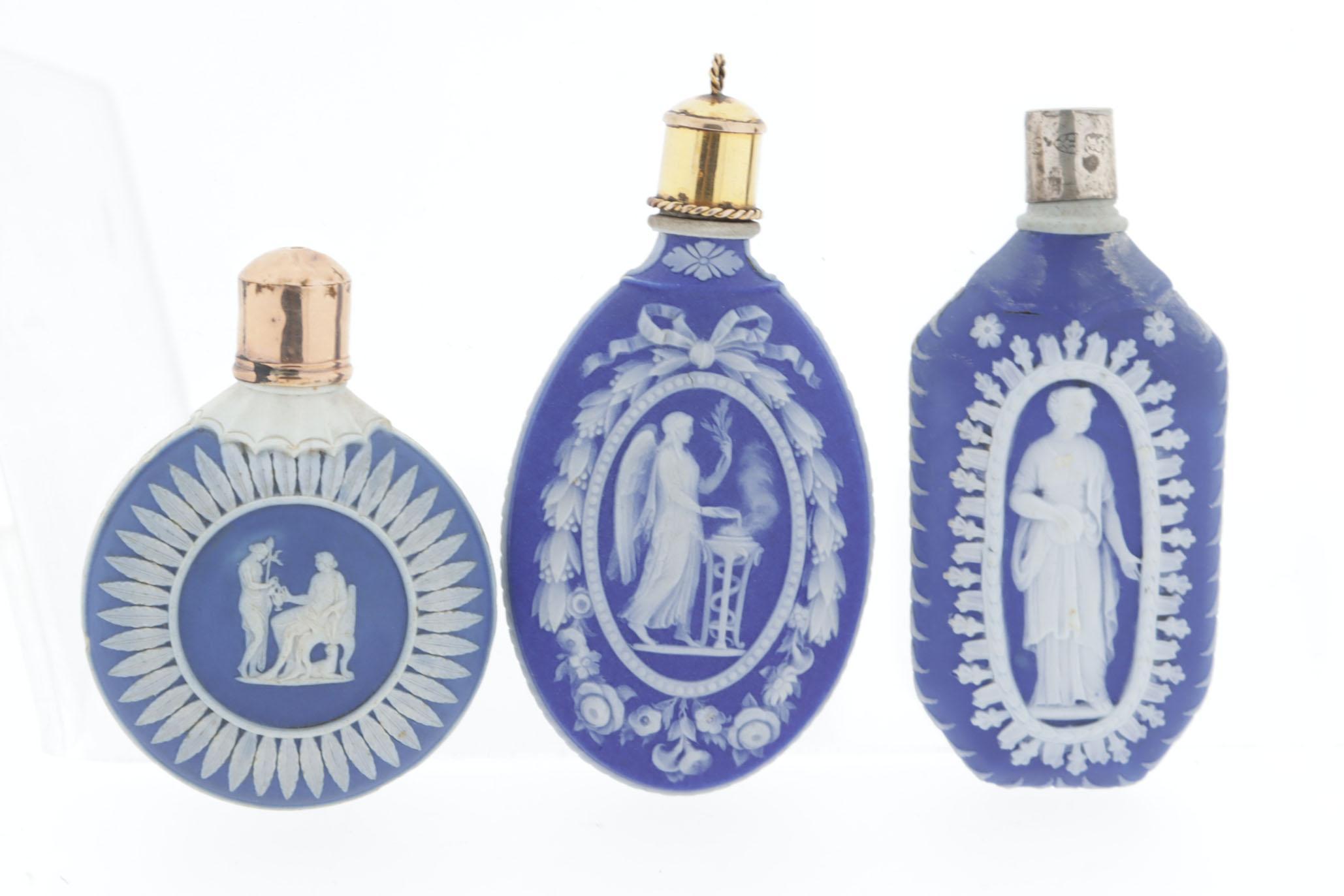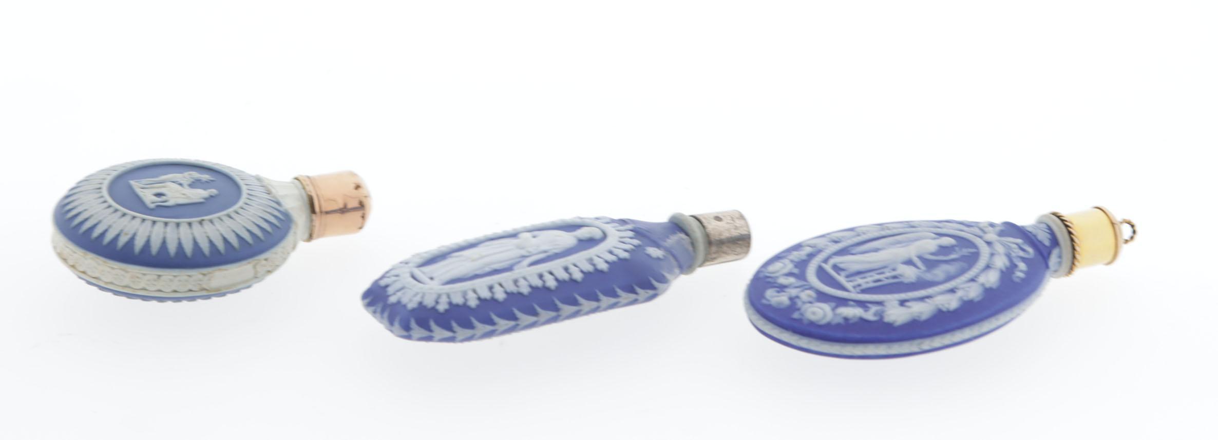 3 Wedgewood parfumflesjes, waarvan 1 met zilveren dop, 2 met gouden dop, hoogte van 6,5-8 cm, rond 1790