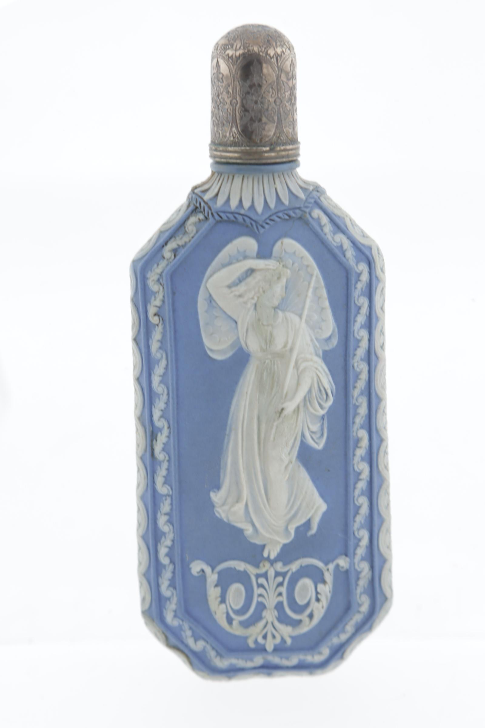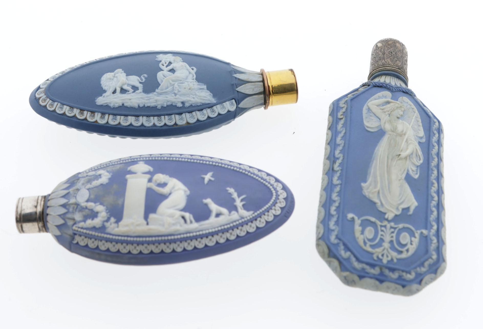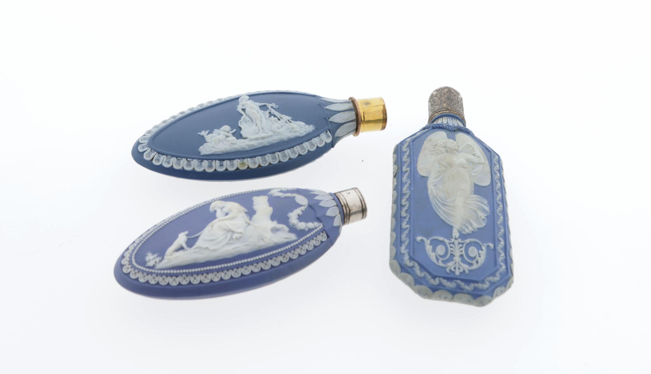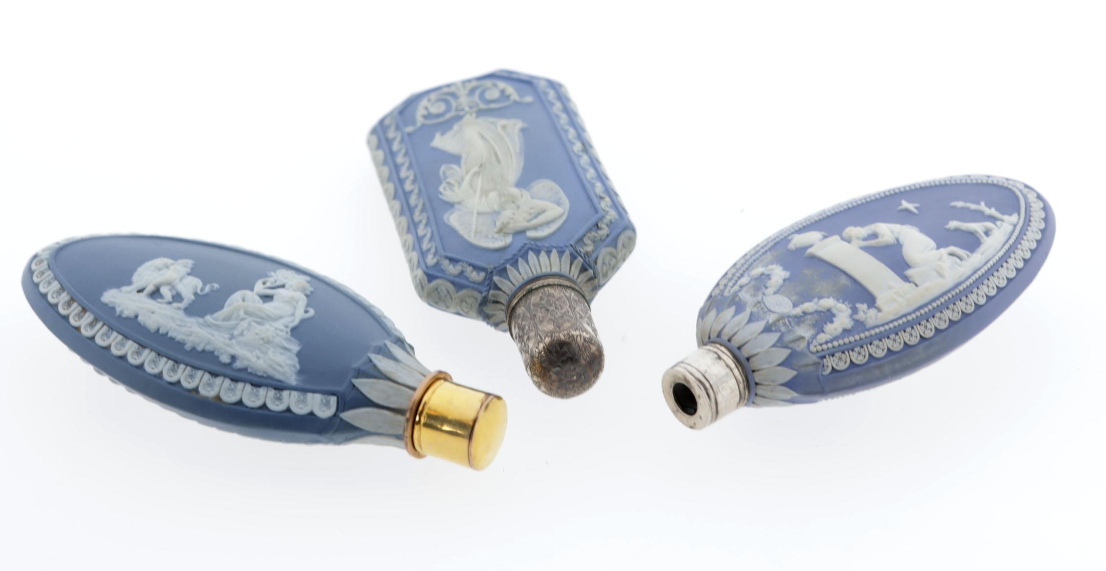 3 Wedgewood parfumflesjes, waarvan 1 met zilveren dop, 1 met zilveren montuur, 1 met gouden dop en gouden binnenstopje, hoogte 9,5-11 cm, rond 1780