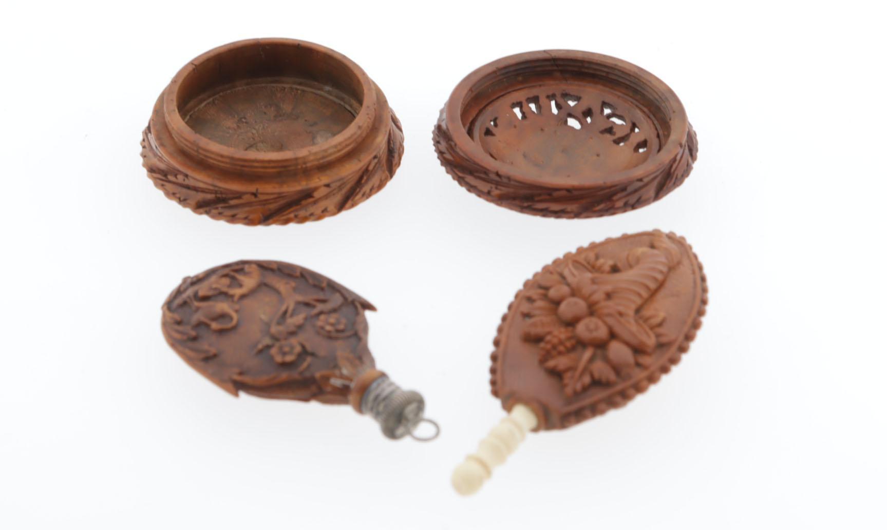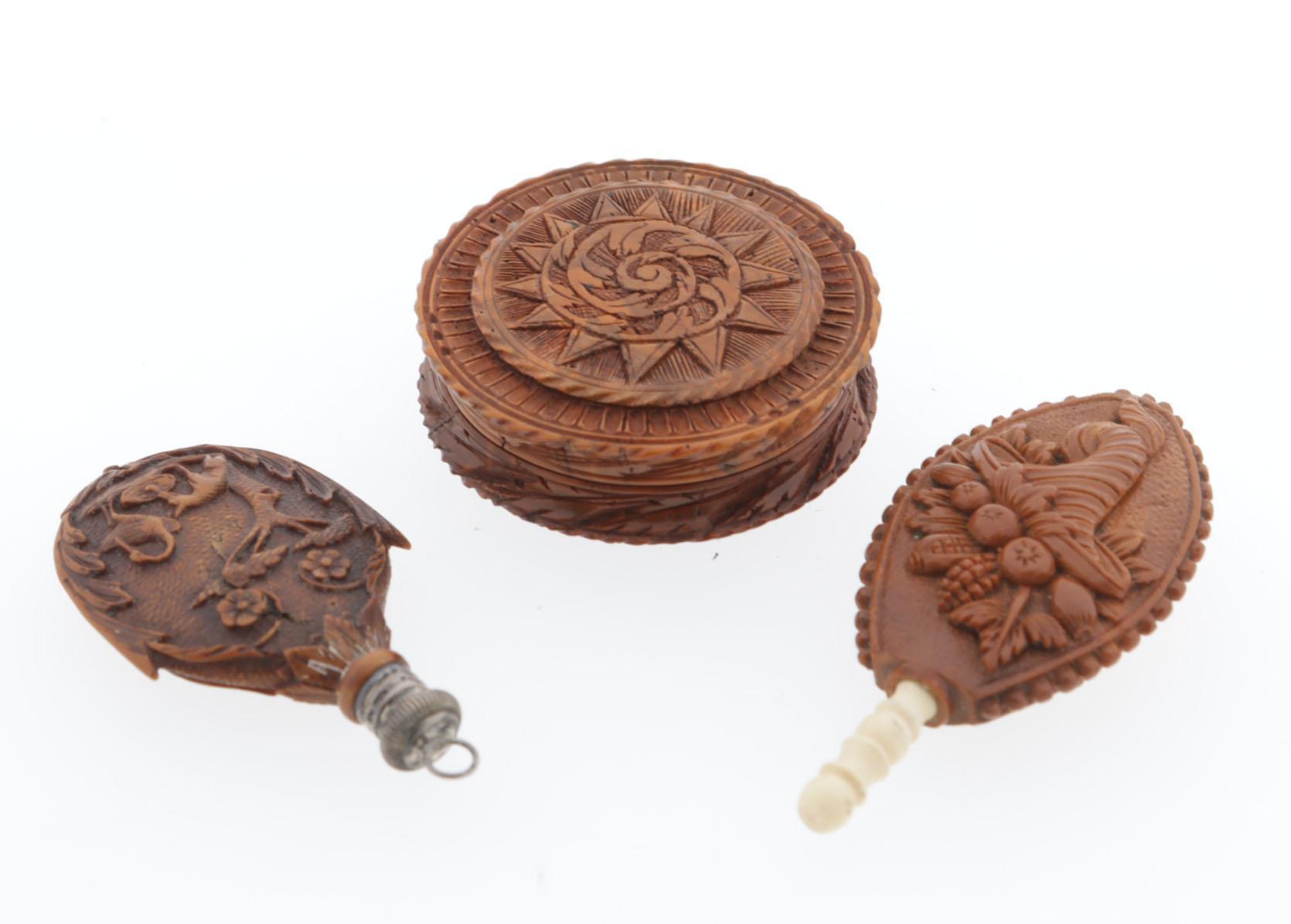 2 corozo parfumflesjes met benen- en zilveren stopje en een snuifdoosje, rond 1800, items zijn rijkelijk handbewerkt aan alle zijden