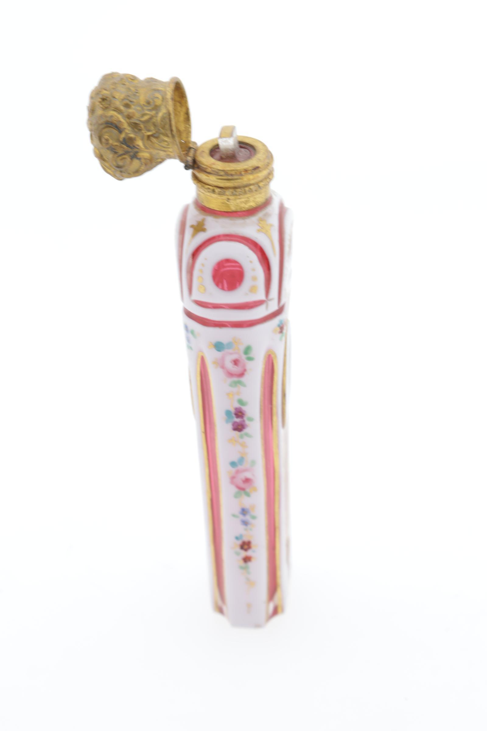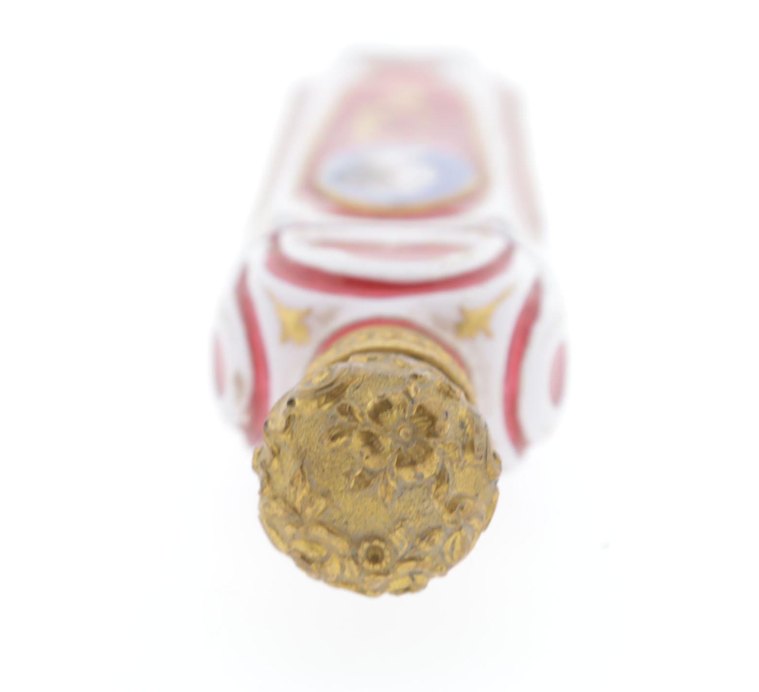 Rood-witte overlay parfumfles, zijkanten beschilderd met fijne bloemetjes, voor en achter portretjes van man en vrouw, Charles X, hoogte 14 cm , Frans, rond 1830