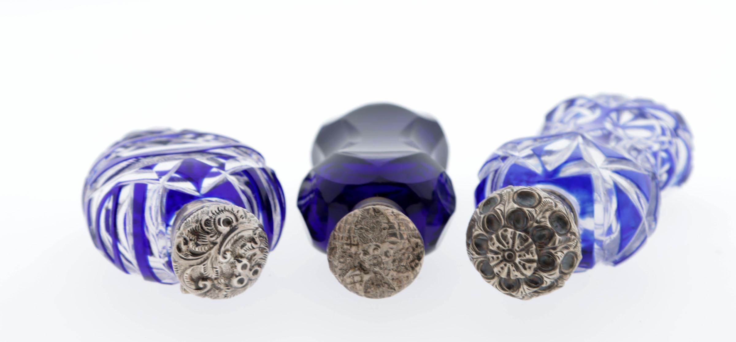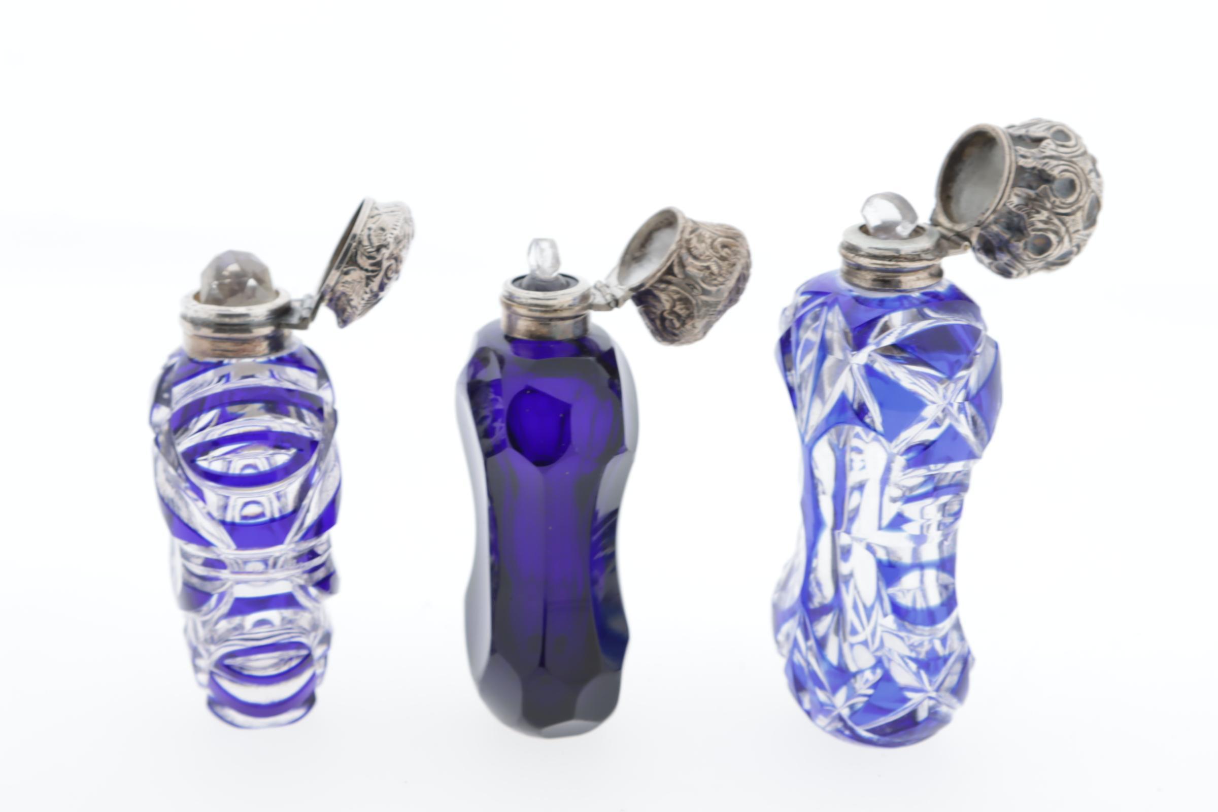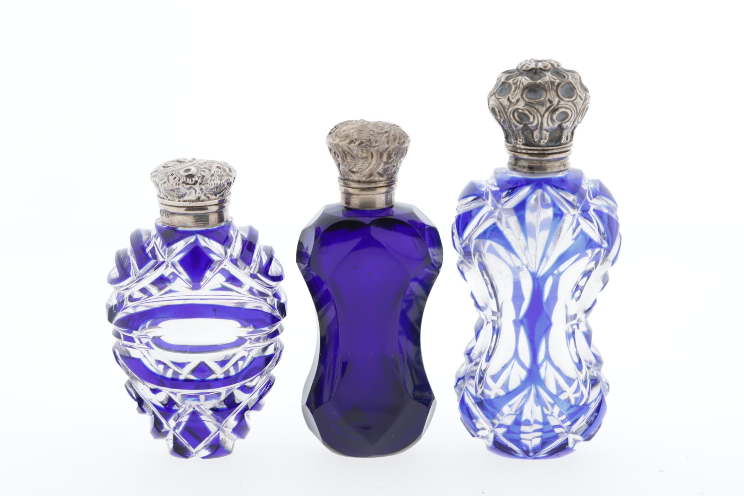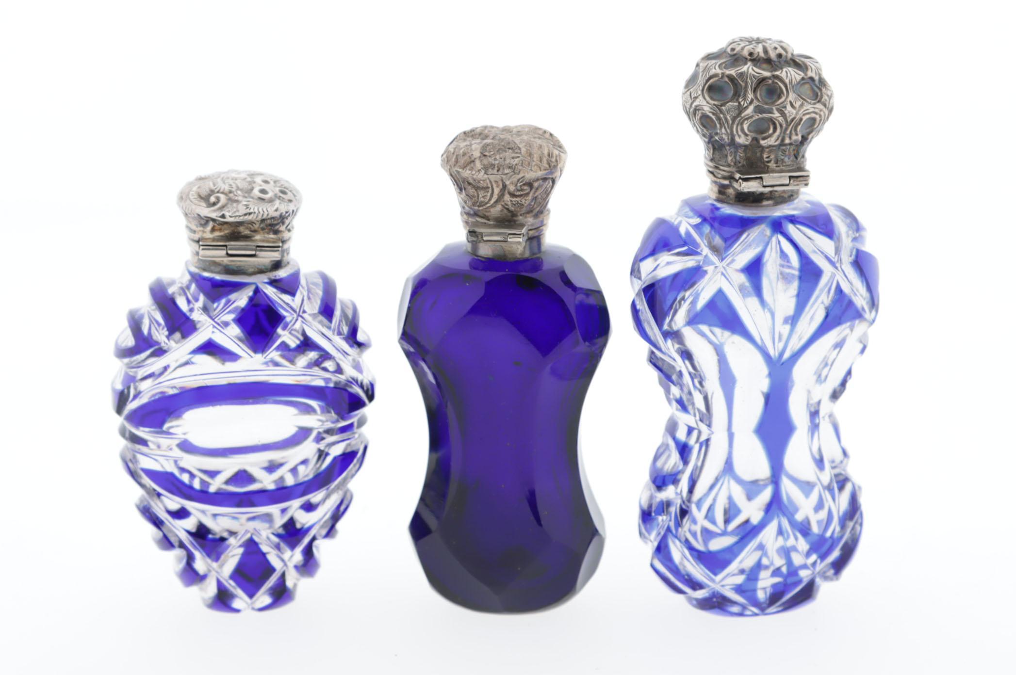 3 parfumflessen, waaronder 2 blauw/kristal overlay, 1 gekeurd CM, Birmingham, 1901, 1 uni blauwe kristal fles, alledrie met zilveren scharnierend montuur