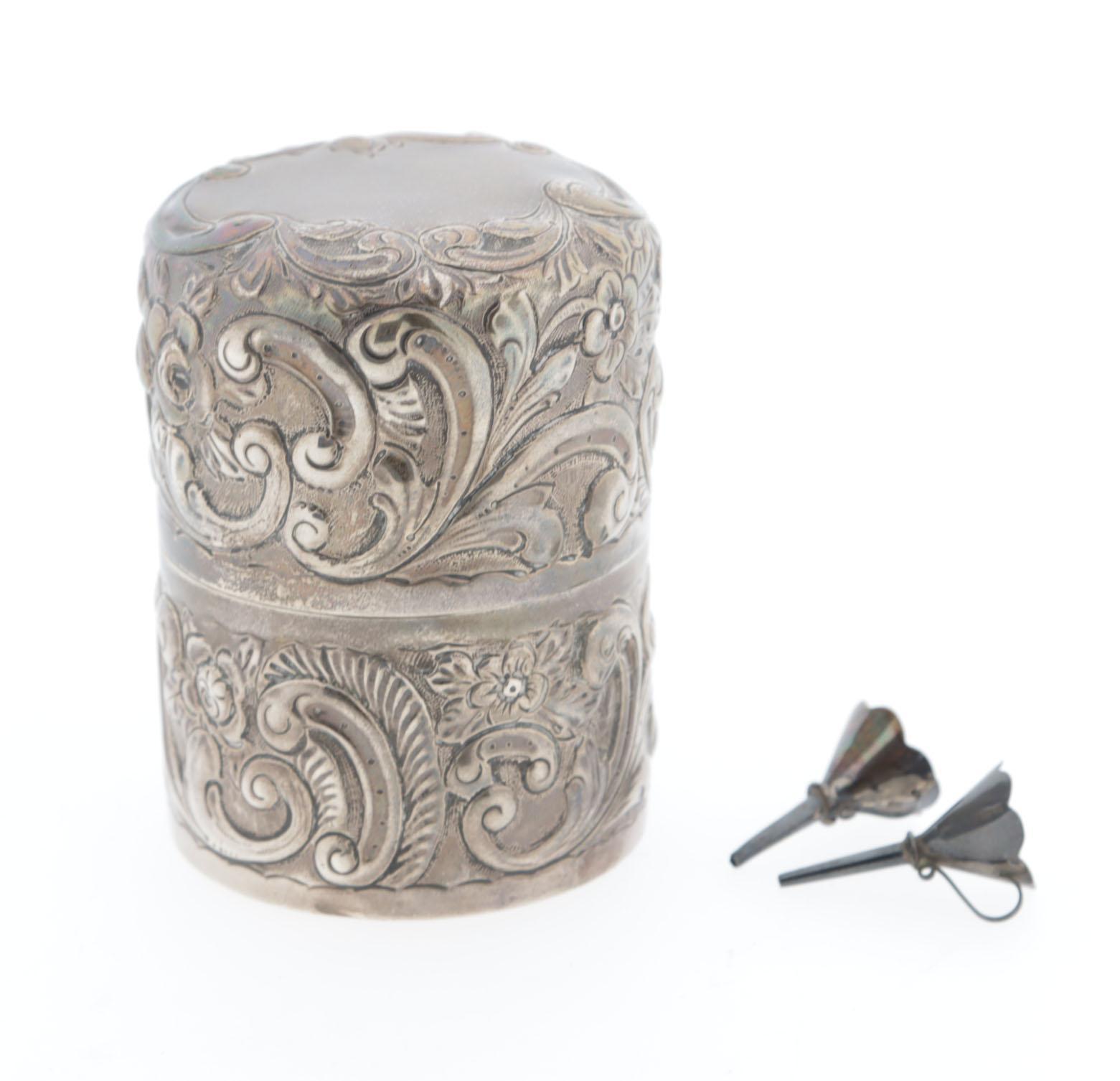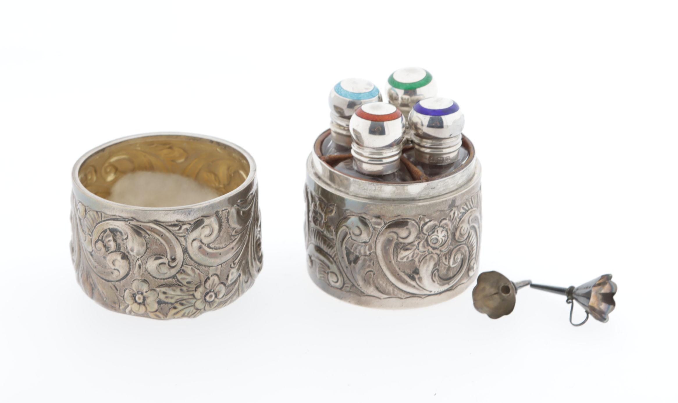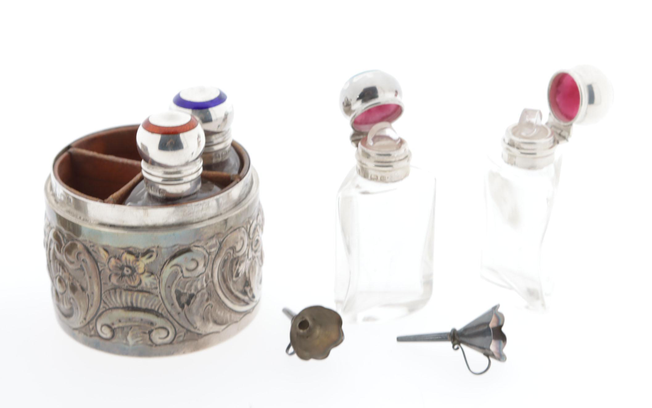 Zilveren doosje waarin 4 kristallen parfumflesjes, ieder met andere kleur geëmailleerde scharnierende dop, kristal binnenstopje, hoogte flesjes 6, 5 cm, hoogte doosje 8,5 cm, hierbij 2 zilveren trechtertjes