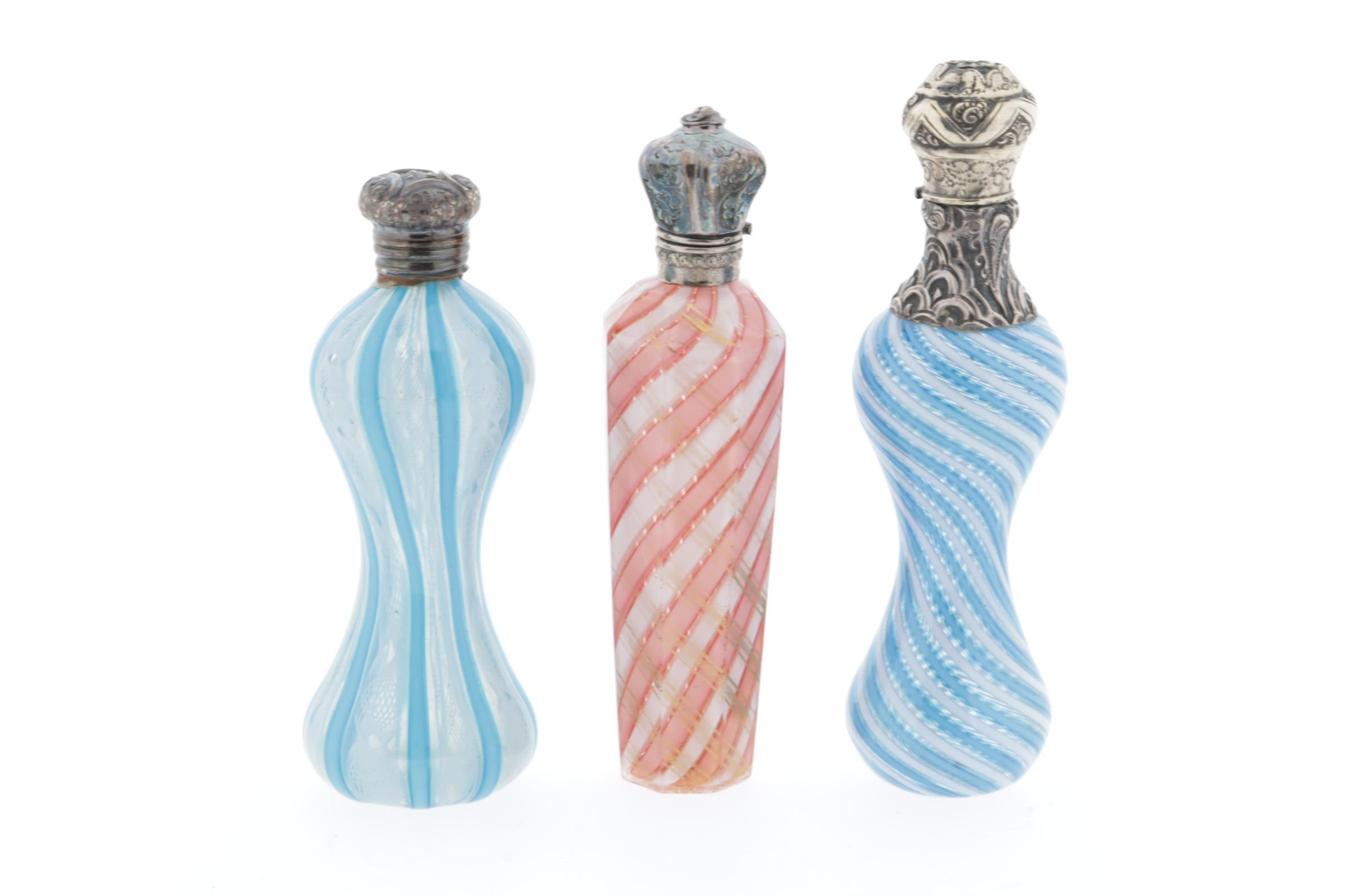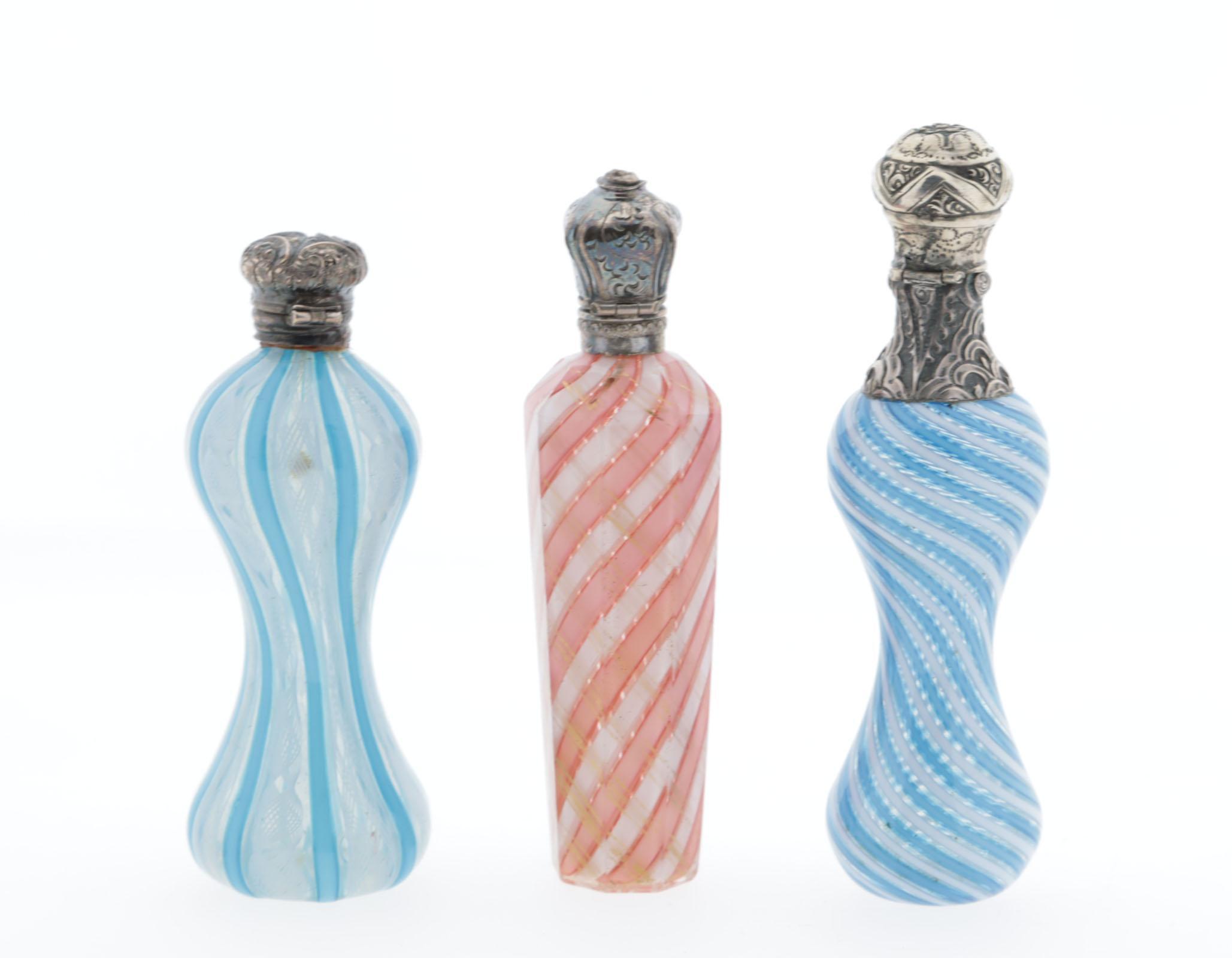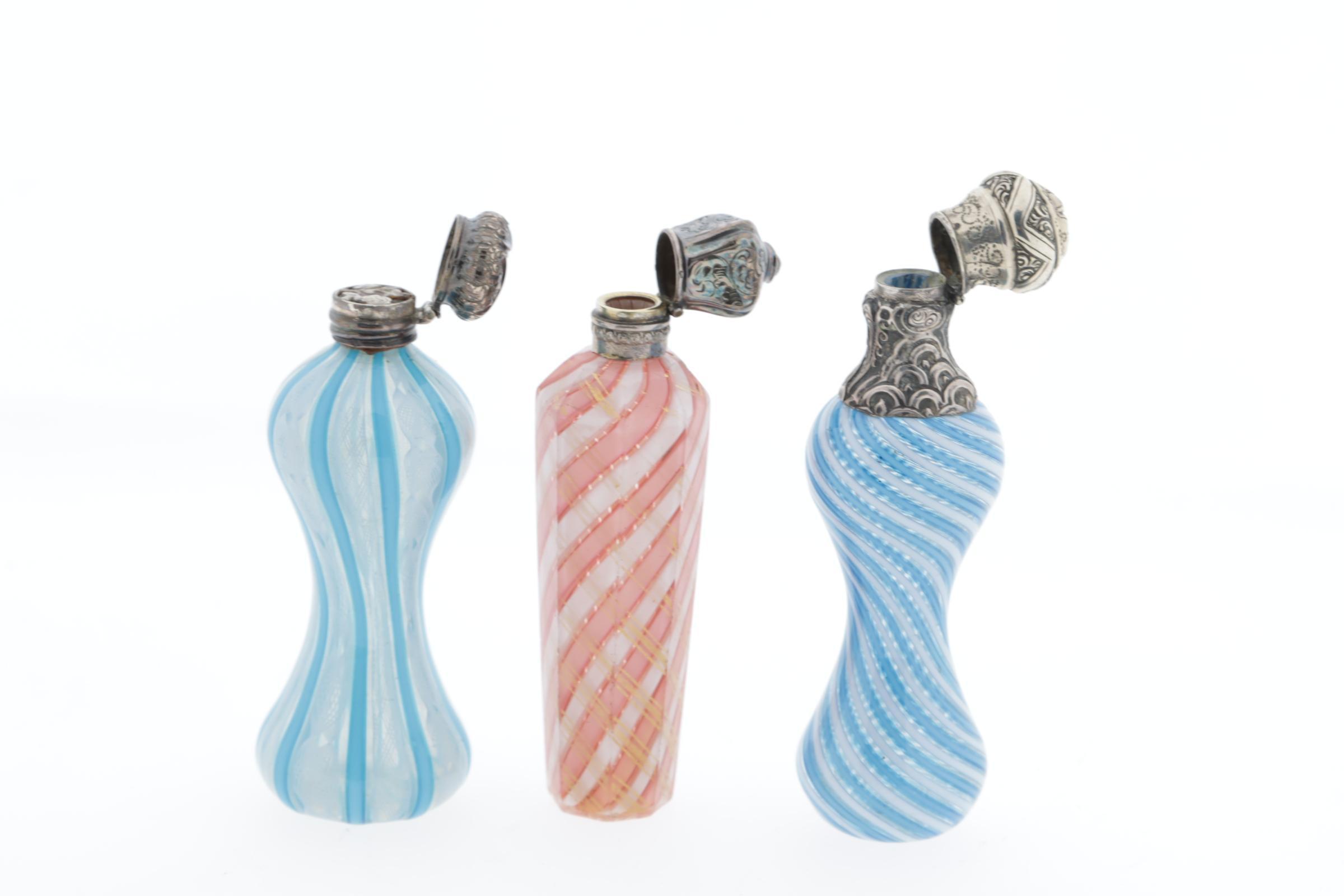 3 parfumflessen, waaronder: 1 met blauw verticale lijnen waartussen wit latticino werk, zilveren montuur, waarop vinaigrette sluiting met roos motief, scharnierende dop, Frans glas, Clichy, Engelse dop, 1850, hoogte 9 cm, 1 glazen fles met turquoise/witte diagonalen, zilveren scharnierend montuur, hoogte 10,5 cm, rond 1850, 1 roze/witte Clichy fles, zilveren scharnierende dop, rond 1850, hoogte 10 cm