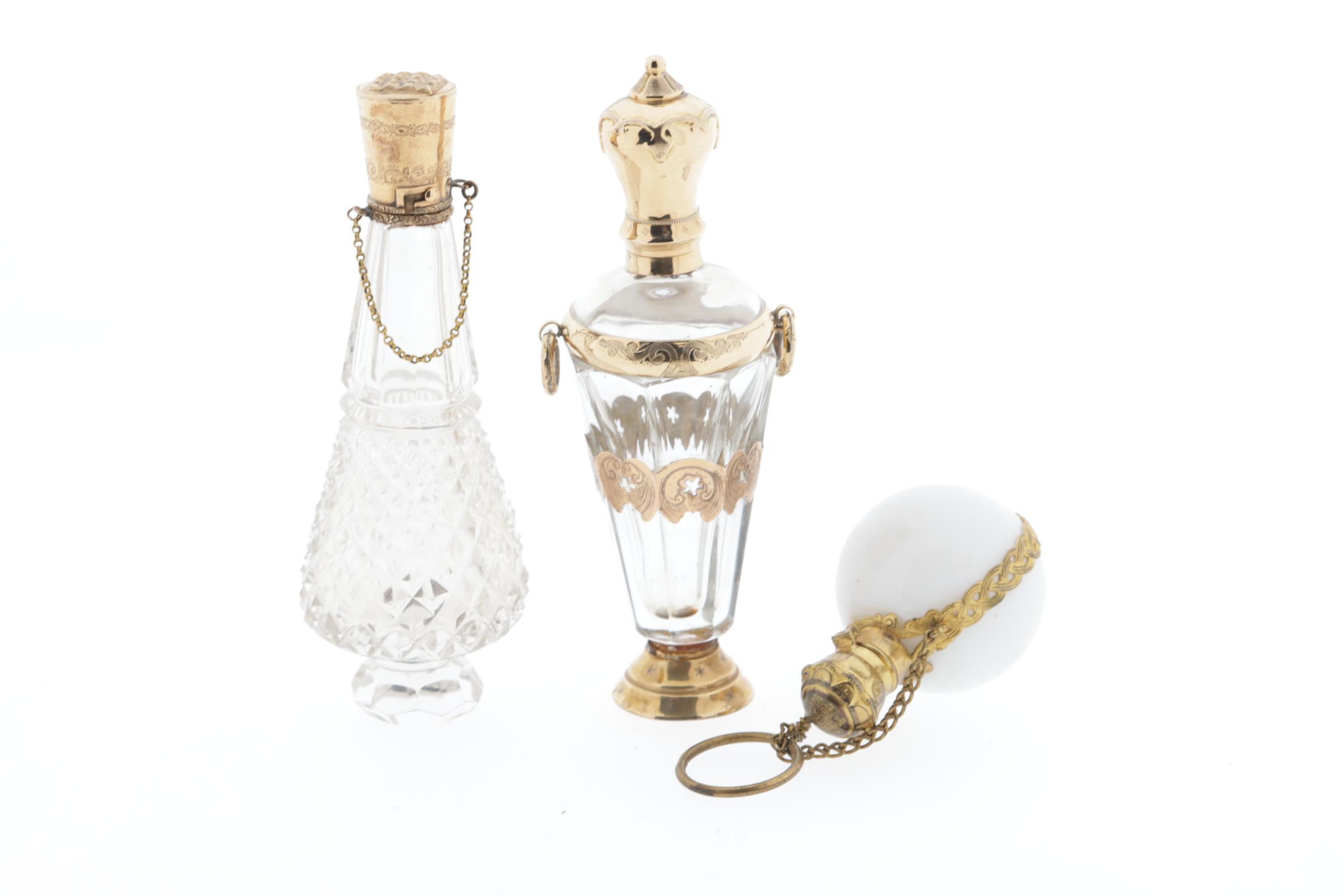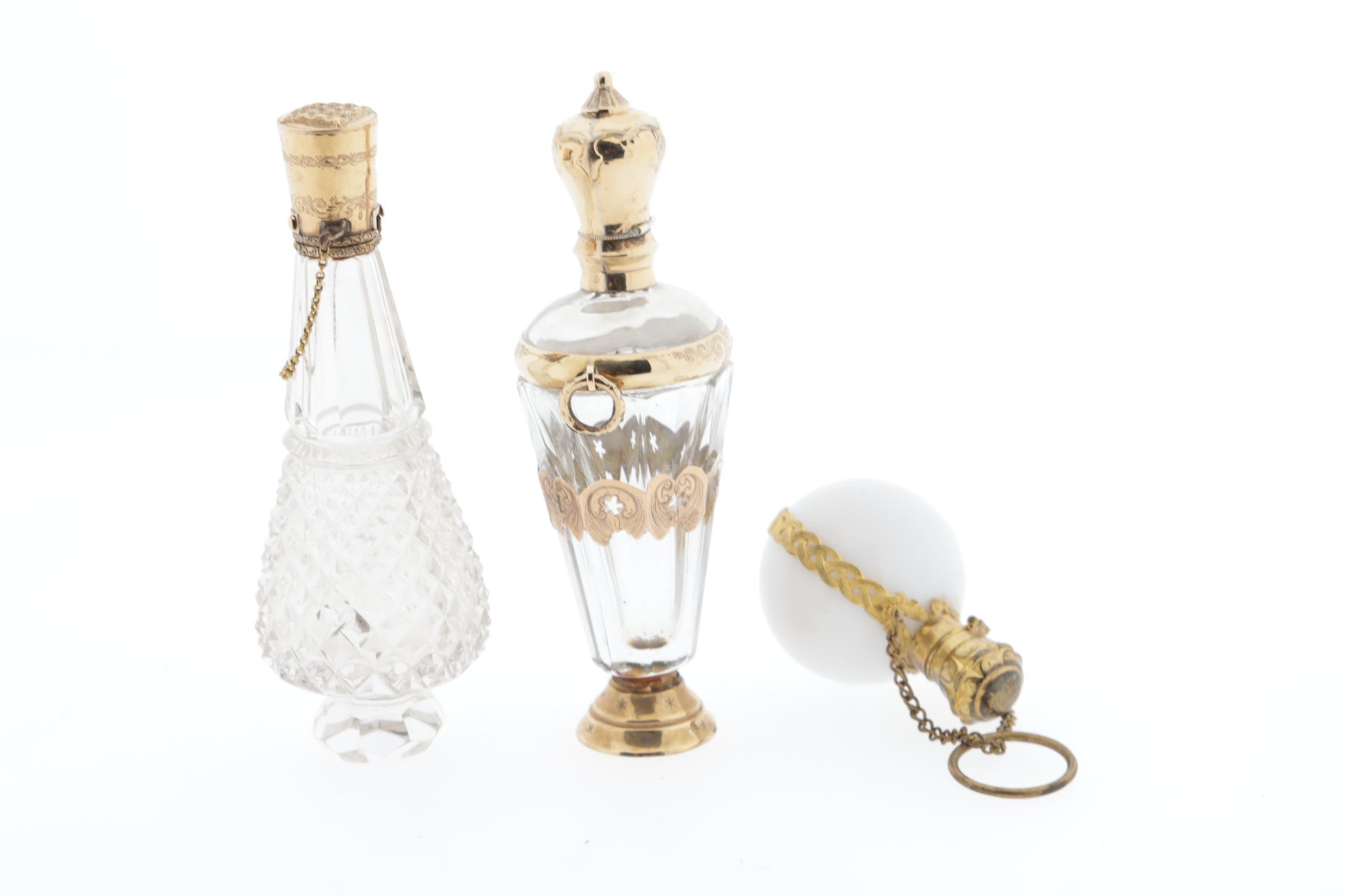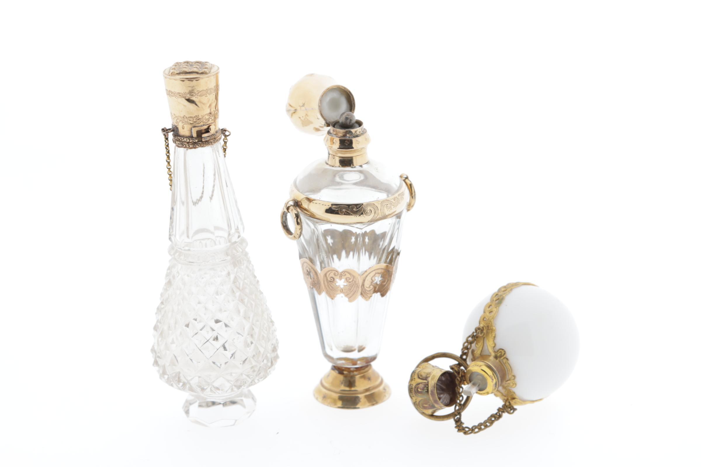 3 parfumflesjes, waaronder: 1 opaline melkwitte bal met koperen montuur, scharnierende dop, rond bol een koperen gevlochten decoratie waaraan ketting met ringetje, glazen binnenstop, hoogte 5,5 cm, kristallen flacon op geslepen 8 kantig voetje, onderste helft diamantslijpsel, gouden dop met banjonet sluiting door kettinkje verbonden aan montuur op flesje. eikenblad keur, Nederlands, rond 1850, hoogte 11,6 cm, 1 kristallen flesje met gouden montuur, gouden voetje en gouden decoratie op flesje, aan weerszijde een gouden ringetje, scharnierende dop, hoogte 11 cm