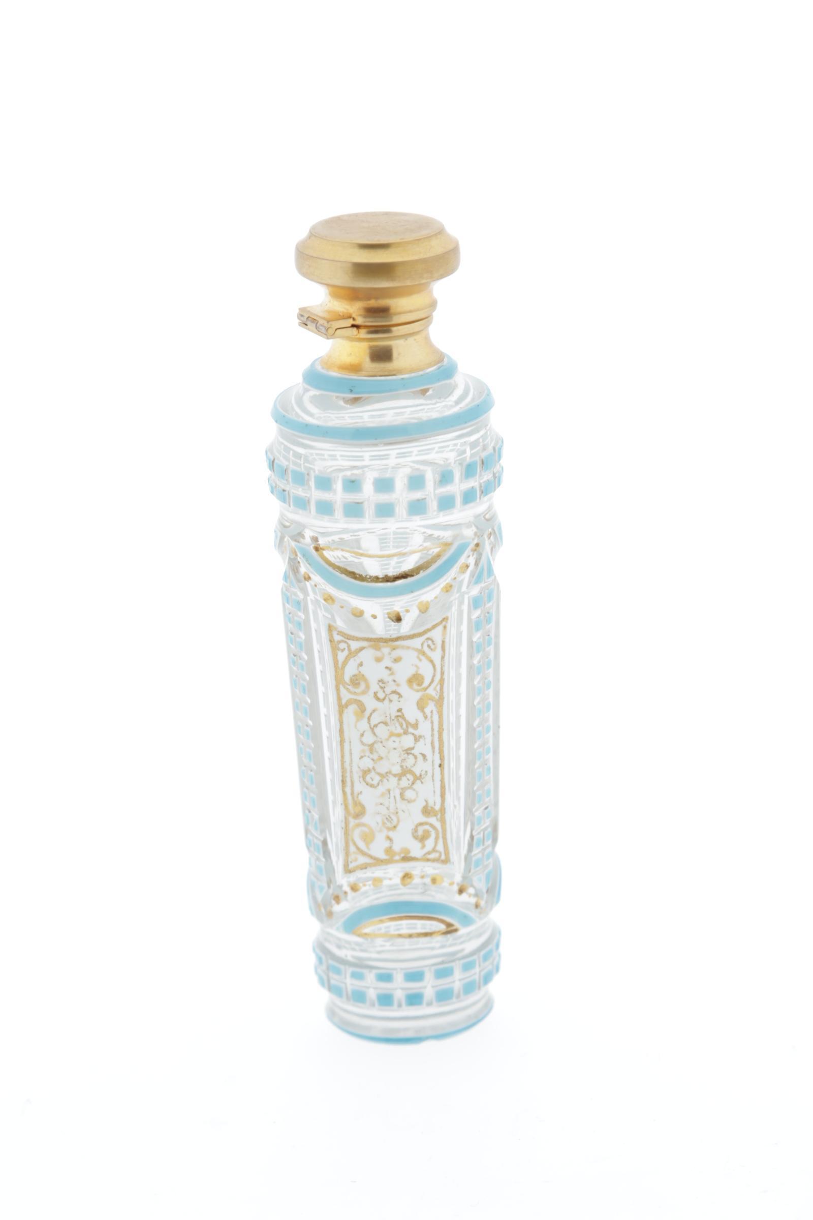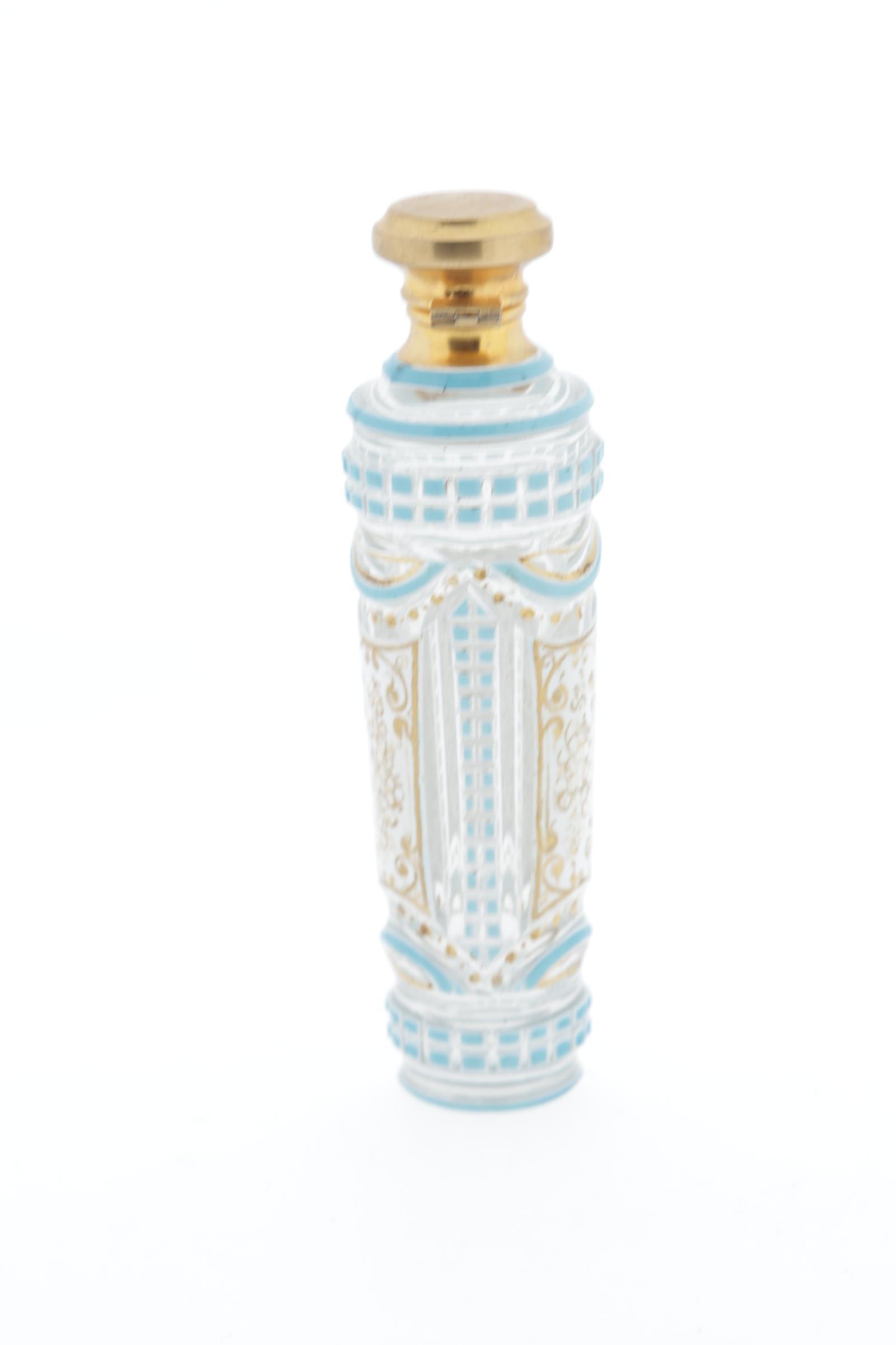 Parfumfles, Frans, turquoise en wit overlay met goud beschilderde panelen, scharnierende metalen dop, kristal binnenstopje, rond 1830, hoogte 11 cm