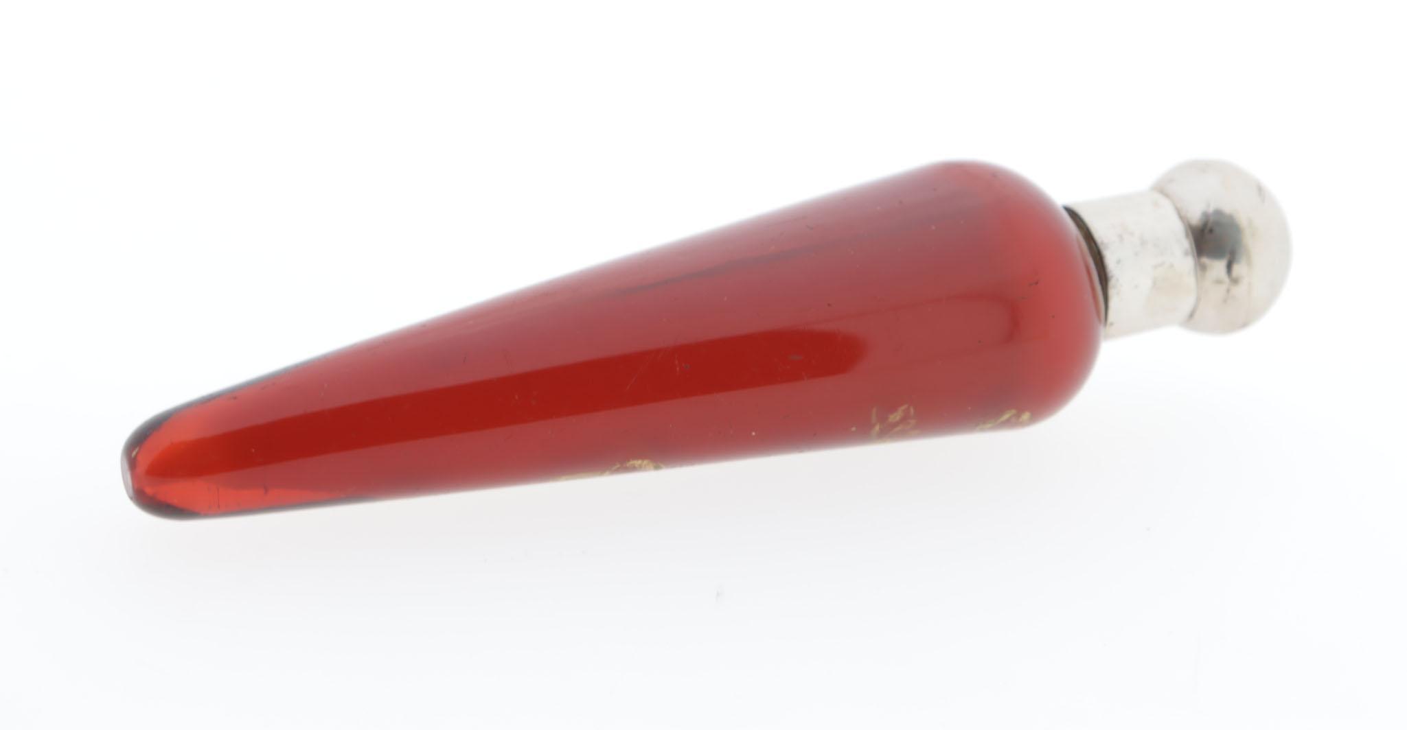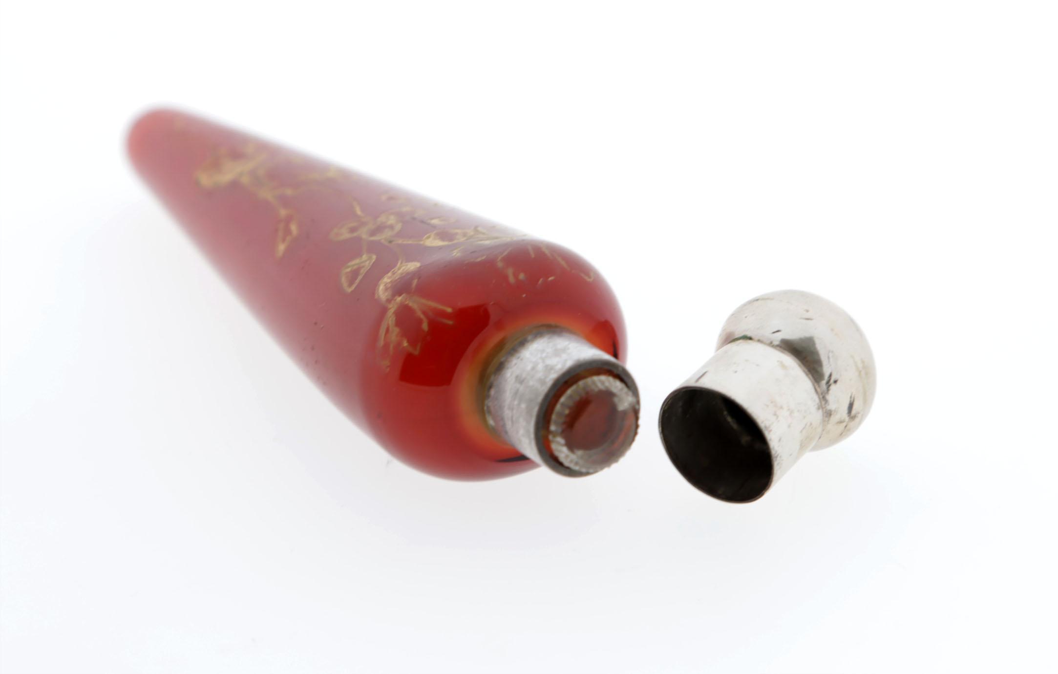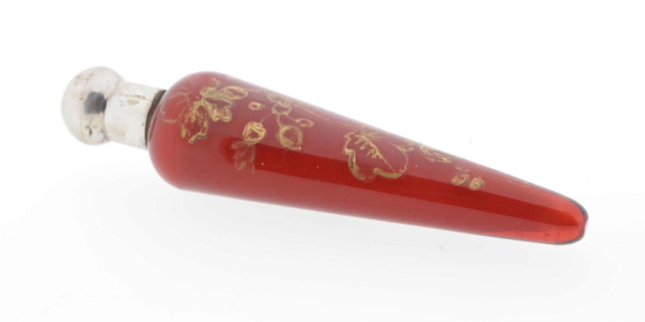 Rode puntvormige glazen parfumfles met zilveren dop, gouden bloembeschildering, in etui waarop "Mappin & Webb Silversmiths to the queen London & Sheffield"
