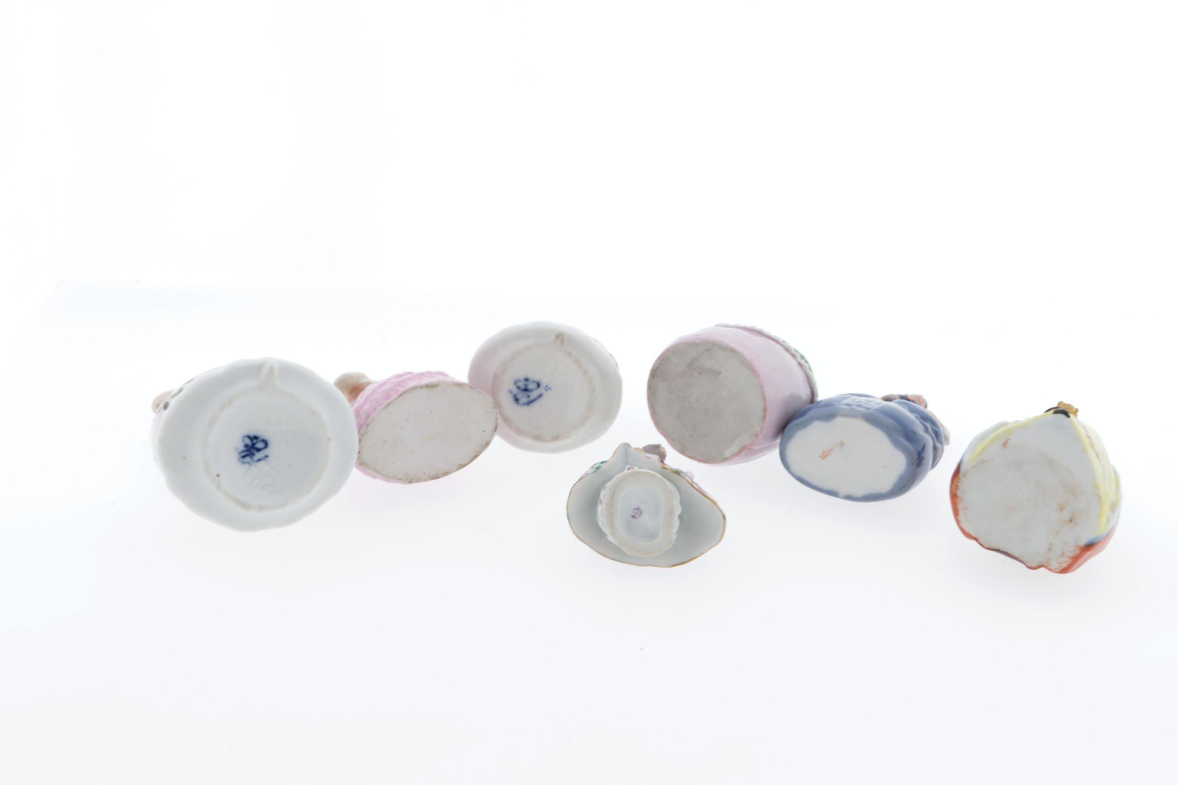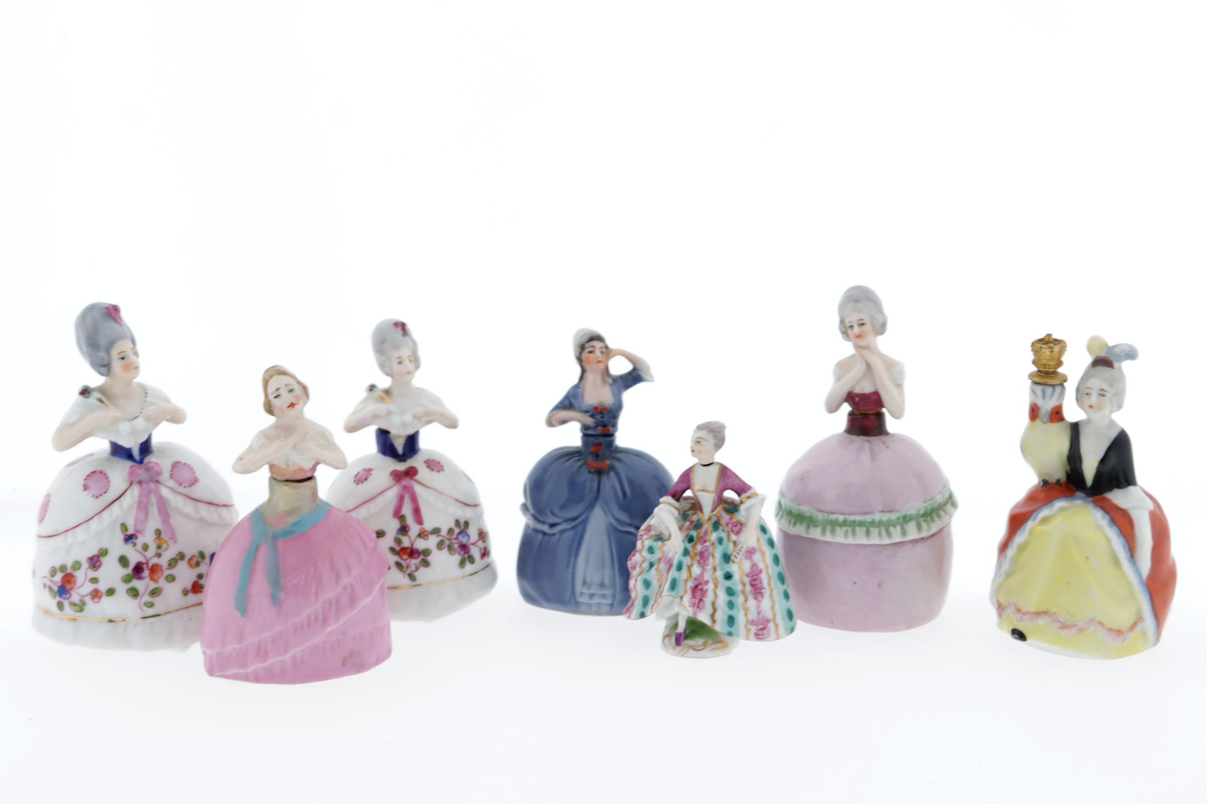7 parfumflesjes, porseleinen vrouwfiguurtjes, waaronder rococo figuurtje met roze/wit/groene gestreepte rok, gemerkt D (Derby?), 18e eeuw, hoogte 6,5 cm, 2 witte vrouwtjes met gebloemde rokken, lijfjes zijn dop op kurk, gemerkt blauw porceleinmerk W. Goebel, rond 1920, Duits, roze vrouwtje blauwe strik, bovenlijf is stop, inscriptie 7742, Duits? rond 1920, hoogte 9 cm, blauw vrouwtje, rococo, gemerkt "foreign" Sitzendorf, Duitsland, rond 1920, hoogte 8,5 cm
