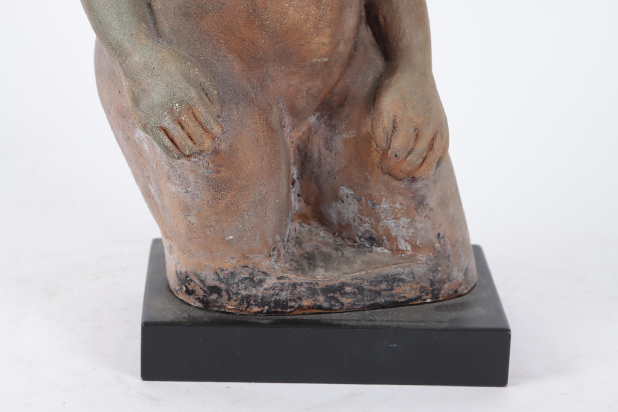 Onb.meester, terracotta sculptuur van een vrouwelijk naakt rustend op houten sokkel, h.37 cm.