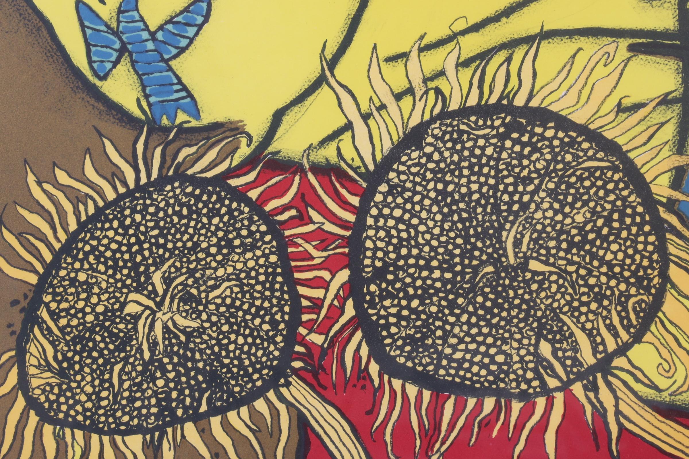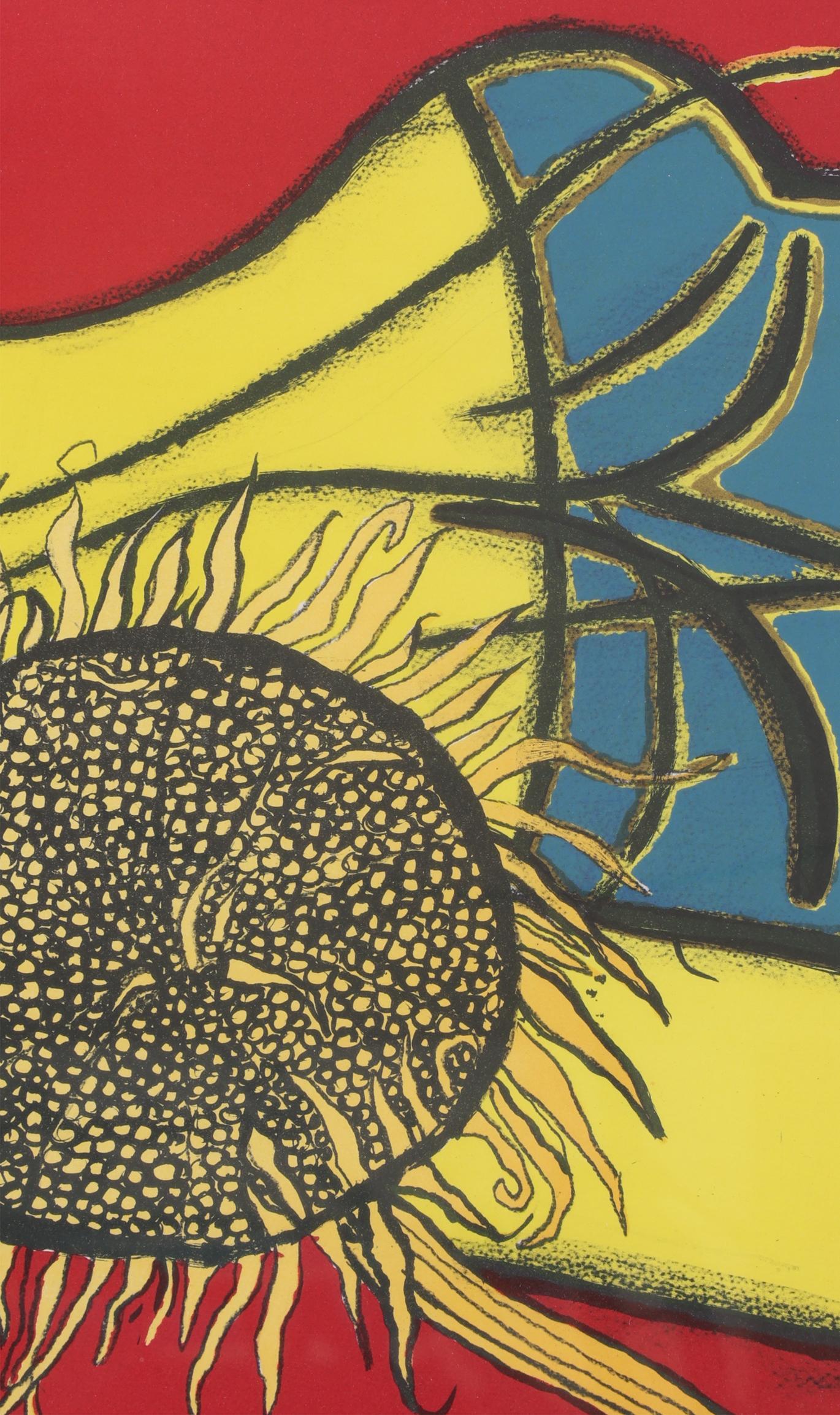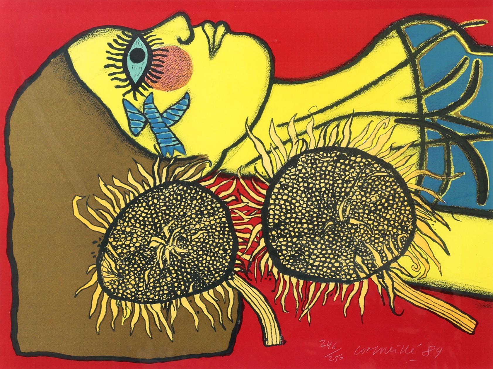 'Corneille', alias van Cornelis Guillaume van Beverloo, (1922- 2010), Vrouw met zonnebloemen, handgesigneerde lithografie, nr.246/250, gedateerd 1998, 70 x 55 cm.