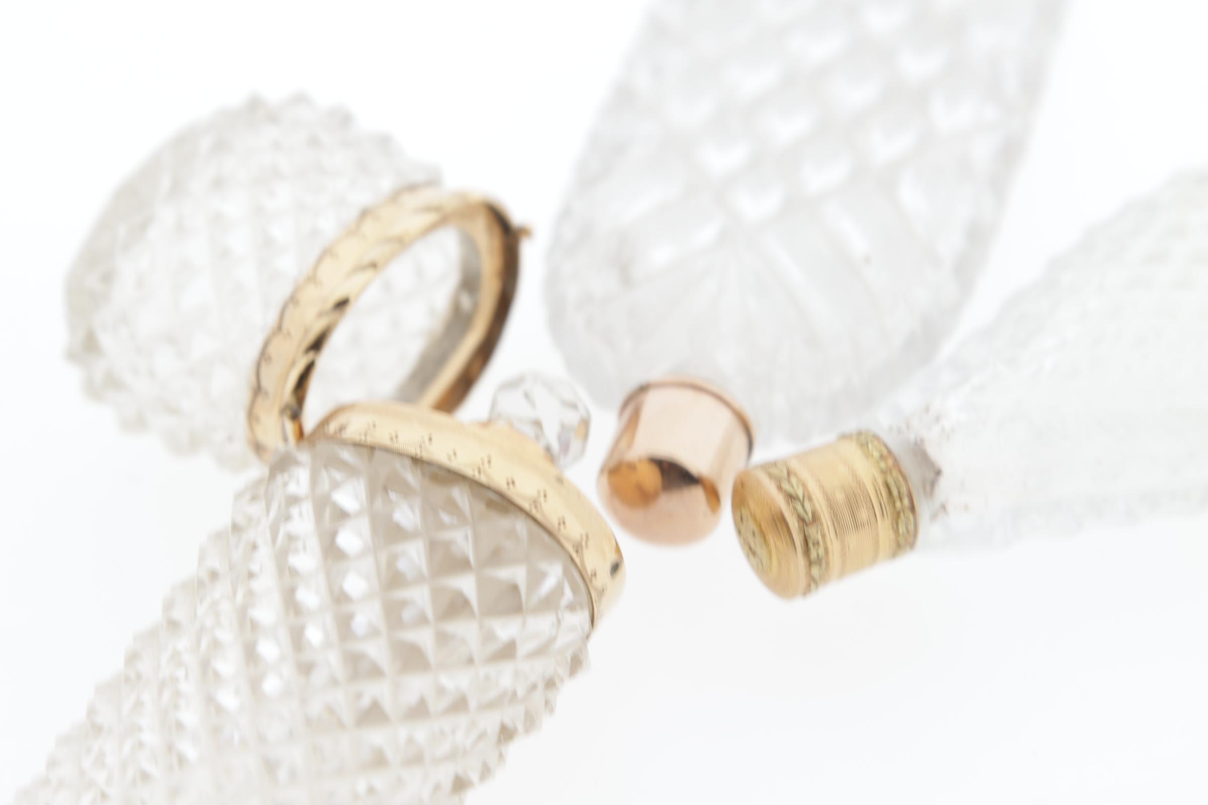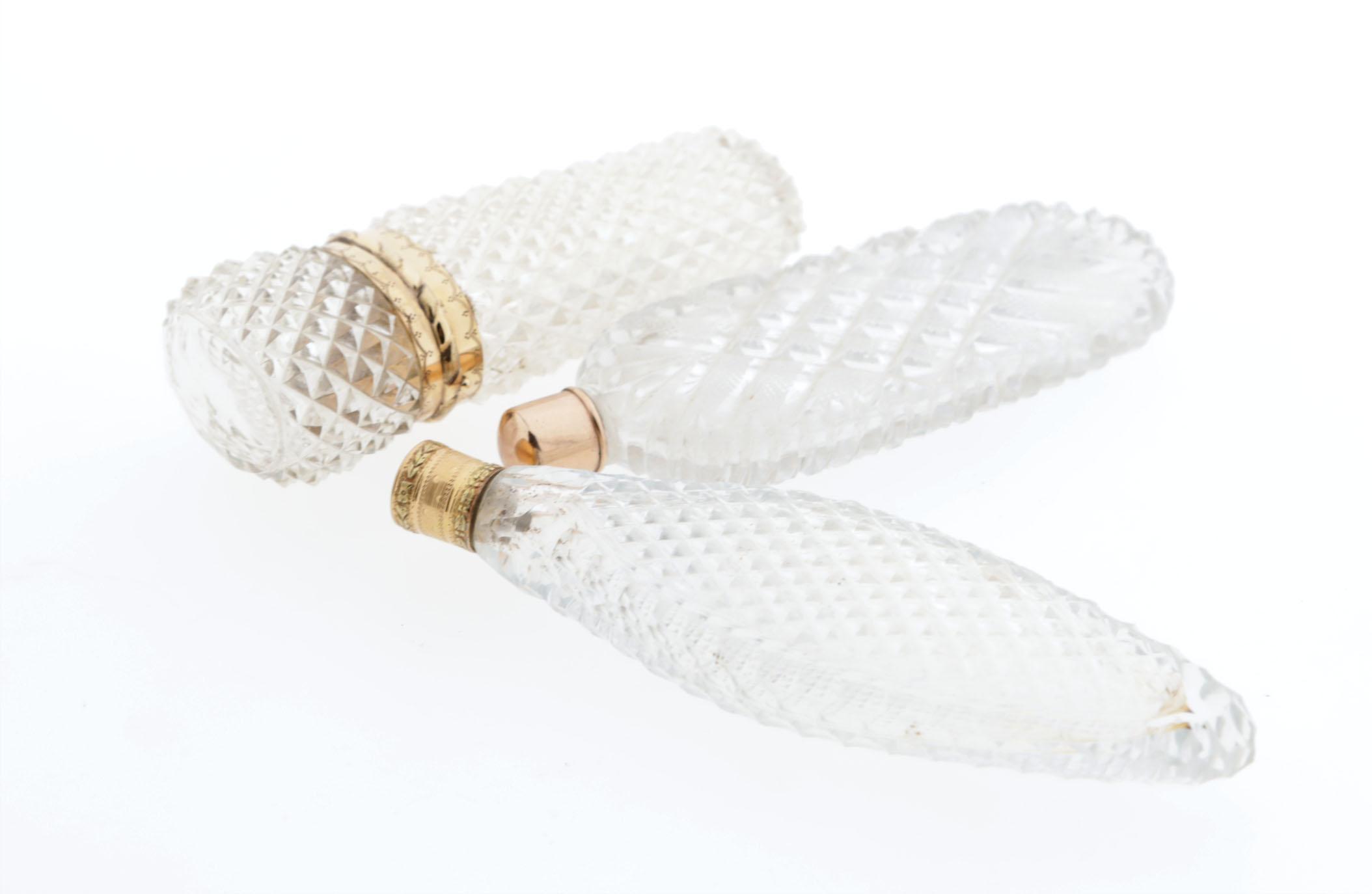 3 geslepen kristallen flessen,waaronder: 1 Georgean fles, gouden dop, hoogte 10 cm, 1 elypsvormige fles, rondom geslepen, tweekleurige gouden schroefdop met bladmotieven, Frans, 1800, hoogte 11 cm, 1 staande flacon, rondom geslepen, gouden montuur en kristallen binnendop, Nederlands goudkeurmerk, hoogte 9,4 cm