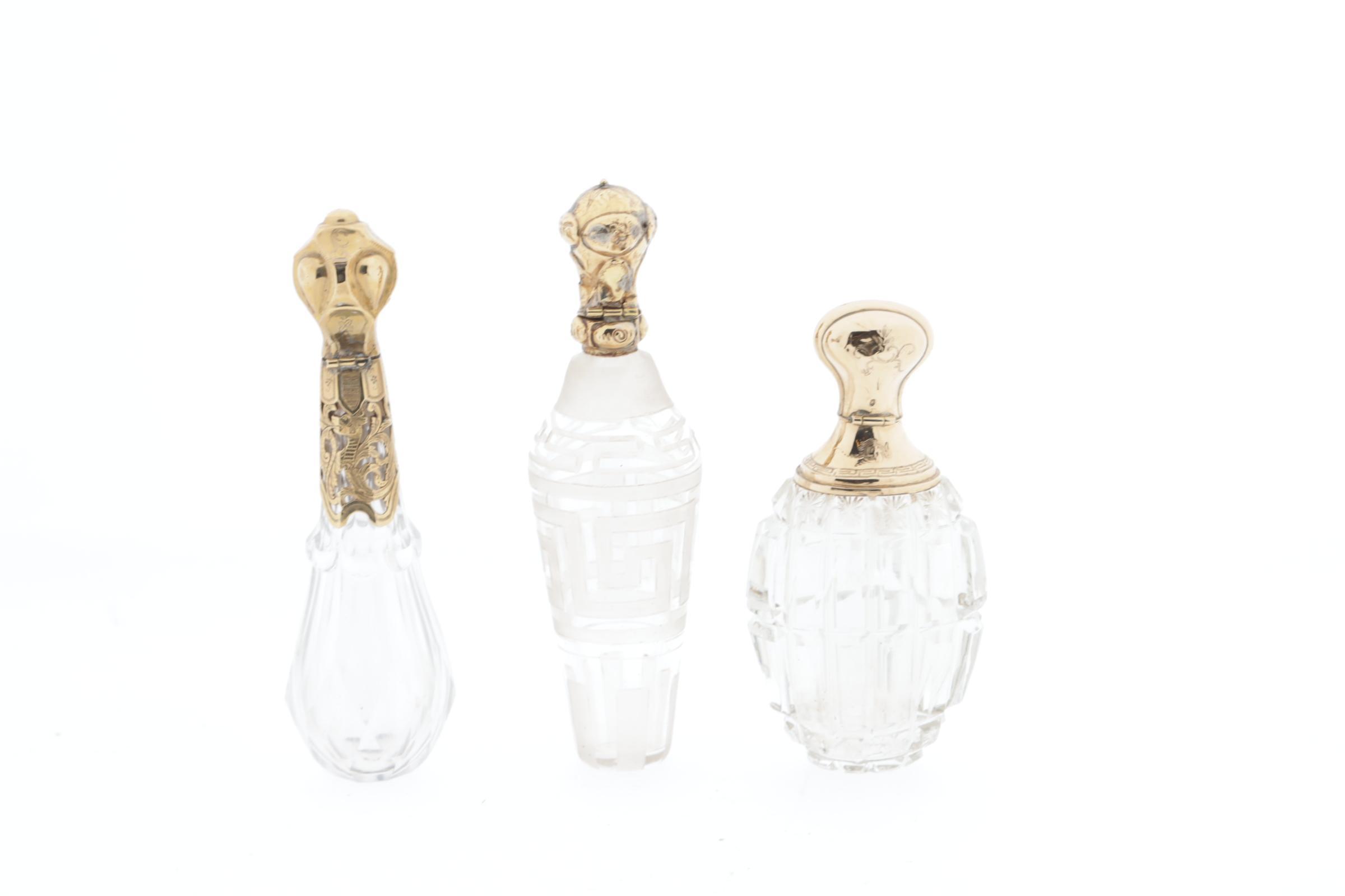 3 kristallen parfumflesjes, allen met gouden scharnierende dop, 2 met kristallen binnendop, 1 fles met meander-achtige graveringen rand, eikenkeur, Nederlands, 19e eeuw, hoogte 11,2 cm, 1 flacon met horizontale en verticale lijnen geslepen, dop met Griekse rand, Nederlands keur (eikenblad), hoogte 8,9 cm