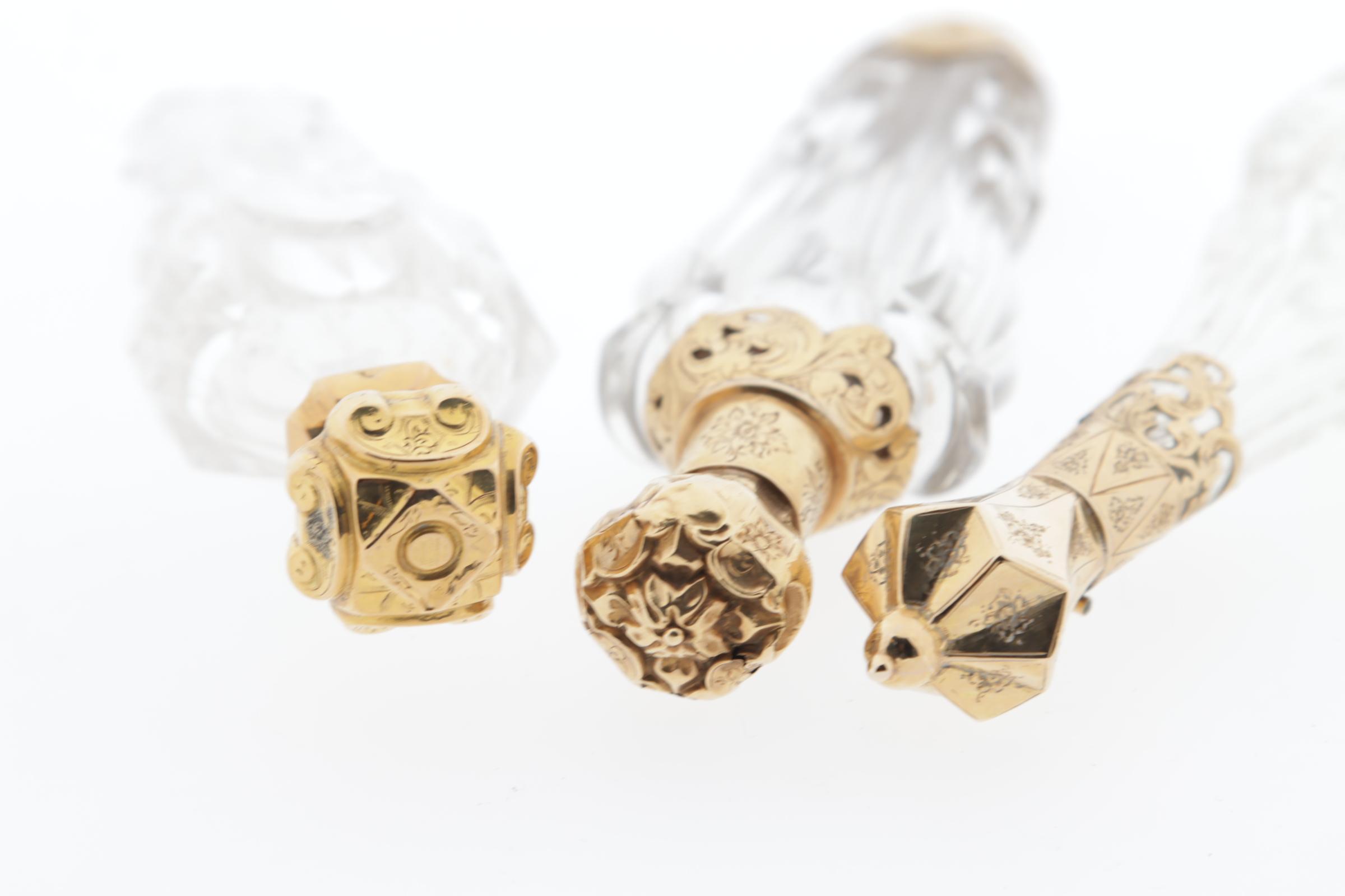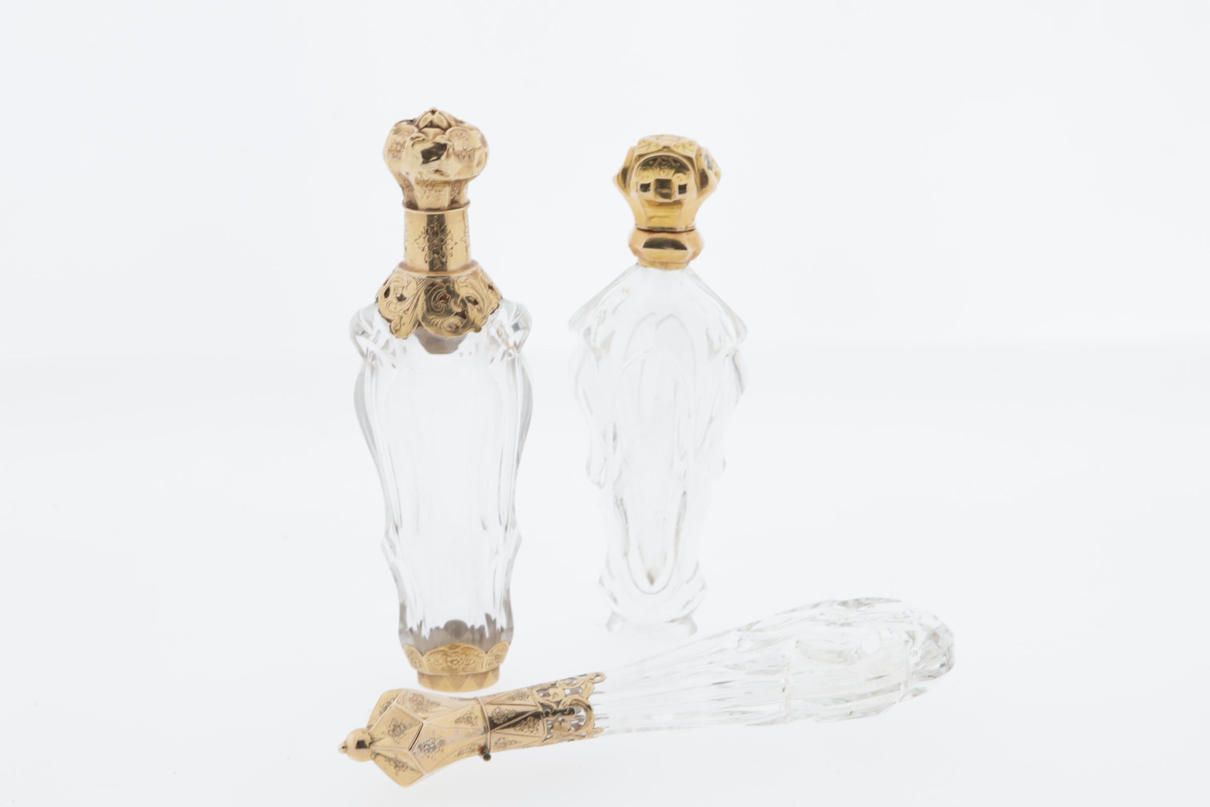 3 kristallen parfumflessen met gouden scharnierende doppen, waarvan 1 liggend model met gouden kroondop, Nederlands gekeurd, eikenblad, hoogte 13 cm, 1 fles met gouden dop en gouden kraag en -voet, hoogte 12,5 cm
